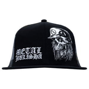 The Metal Mulisha Mayhem Flex Hat in Military Green features a custom skull art screenprint on the wearer's front left panel and an old english style Metal Mulisha embroidery on the front right panel, small Metal Mulisha logo embroidery on back center and small helmet embroidery on left side, Military Green back panels covered in black and grey all over screen print, large M/M underbill print, and custom printed internal seam taping. Flat bill with ability to curve.