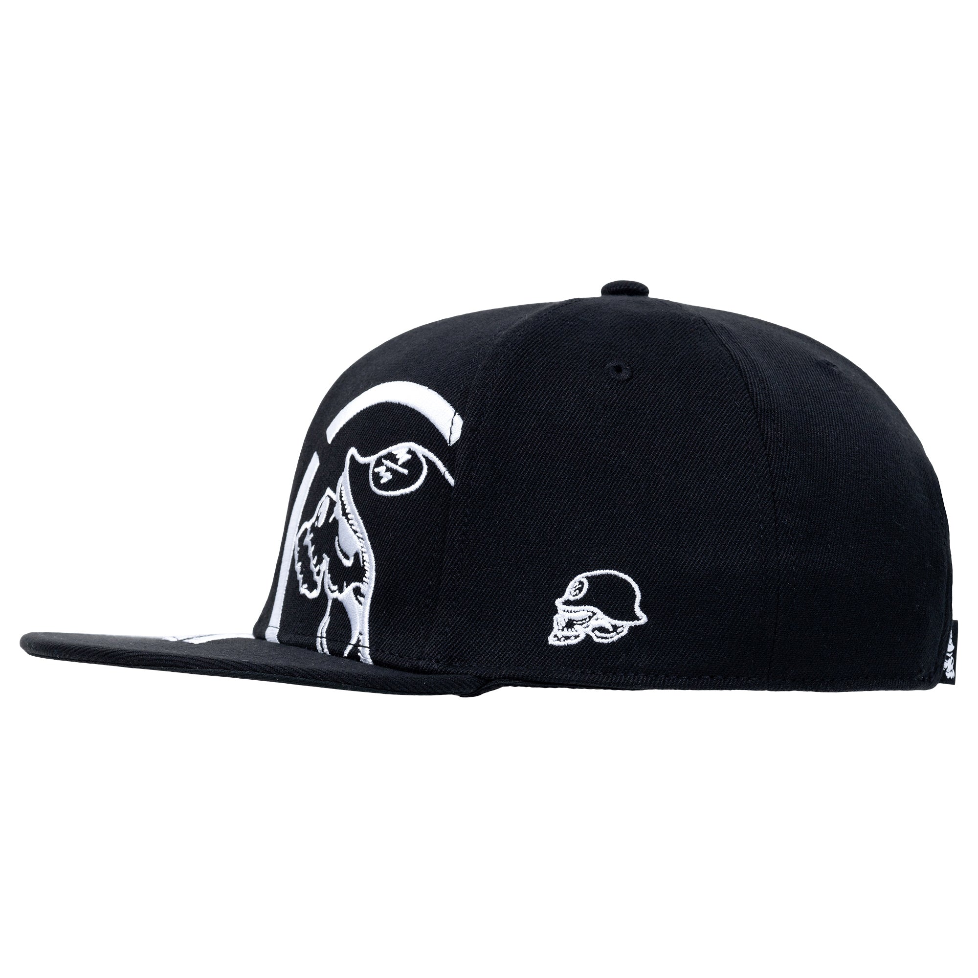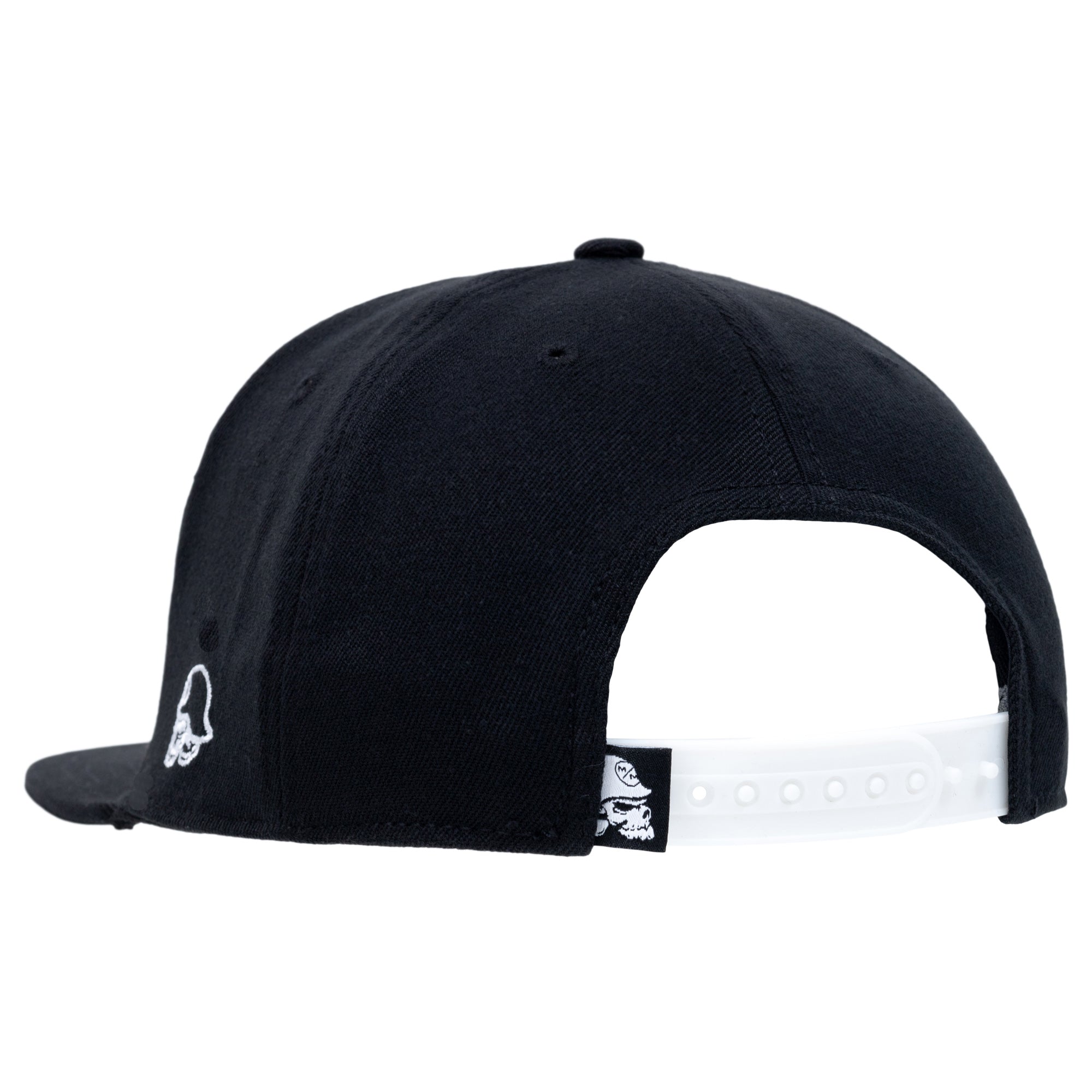 The Staple Snapback Hat in Black features a large embroidered Metal Mulisha skull with chevrons with a scope on the front in White, a custom underbill print in White, a small white helmet logo on the left side panel, and White comfortable Flexsnap band with a small custom woven label.