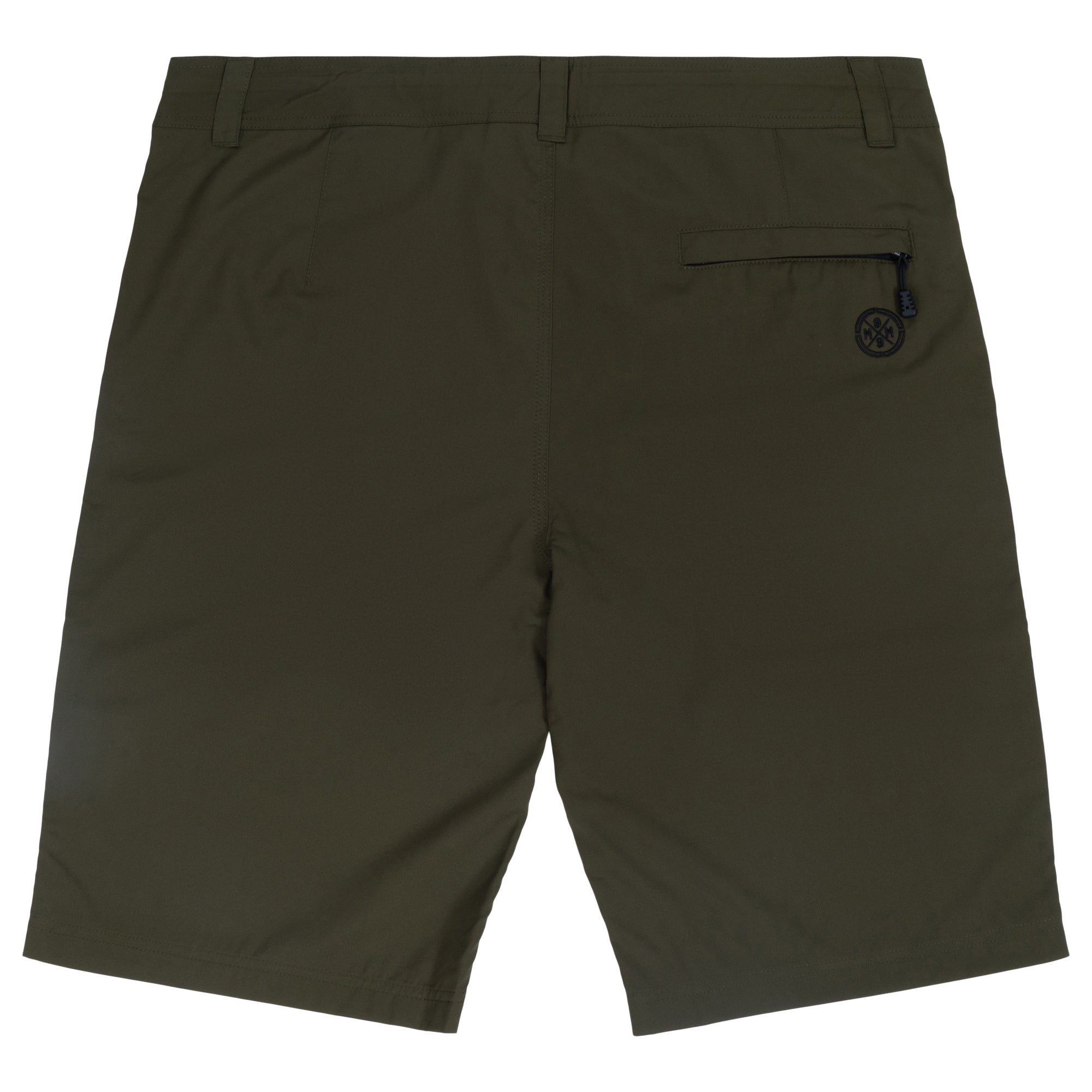 The Metal Mulisha Crooked Hybrid Boardshorts in Military Green will dominate in & out of the water. With a lightweight, fast drying and slightly stretchy boardshort material they are comfortable and adaptable to anything and look like a regular pair of shorts. Both front pockets have zippers to make sure nothing falls out of the mesh pockets. The back pocket has a zipper pocket. Front zipper fly with a button attached with sturdy nylon...you won't bust buttons off like the ones attached with thread. Internal drawstring to adjust fit without a belt. Front left leg has Chevron logo print and back pocket has an embroidered M/M 99 emblem. 22" outseam so they are a little longer than you find from most surf brands.