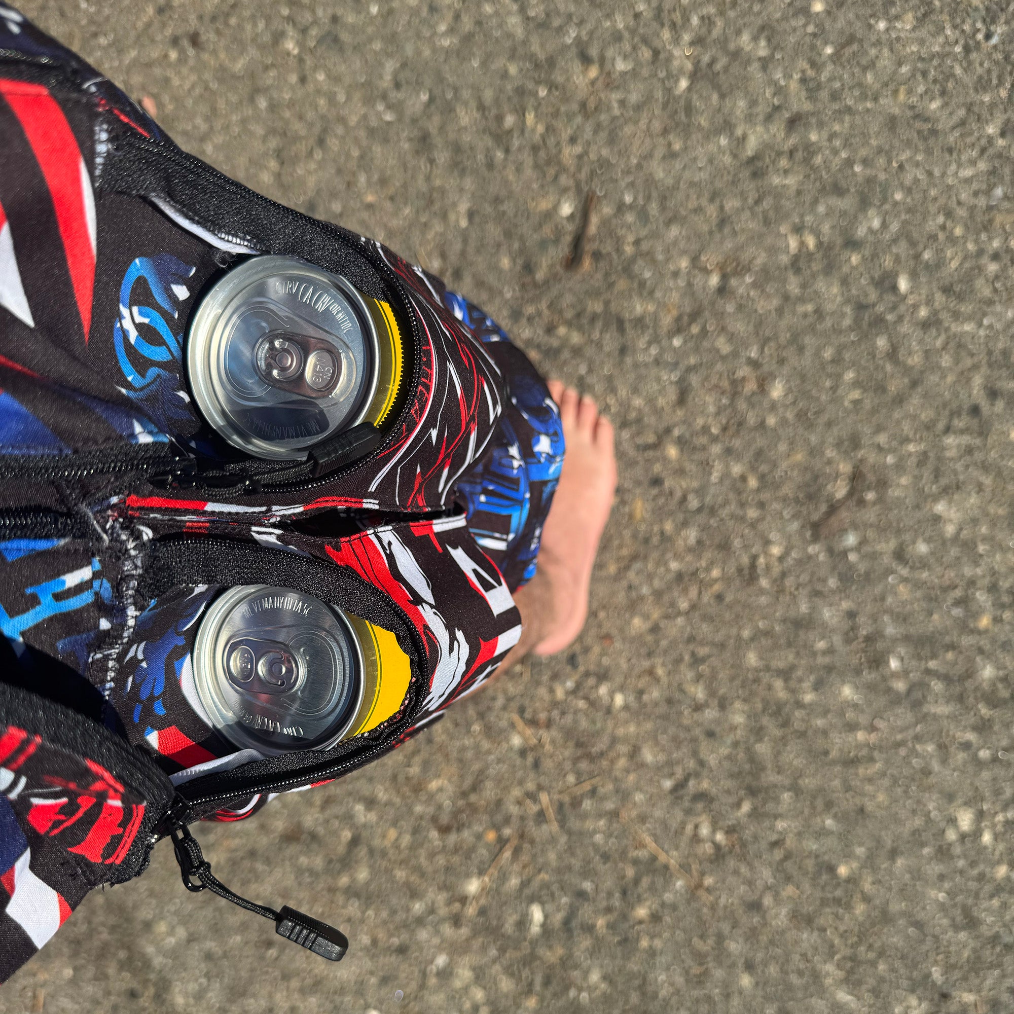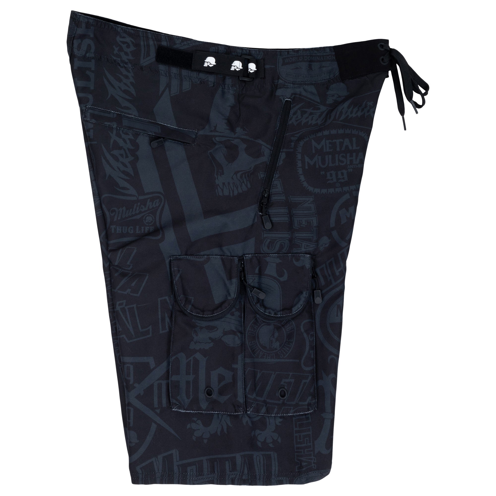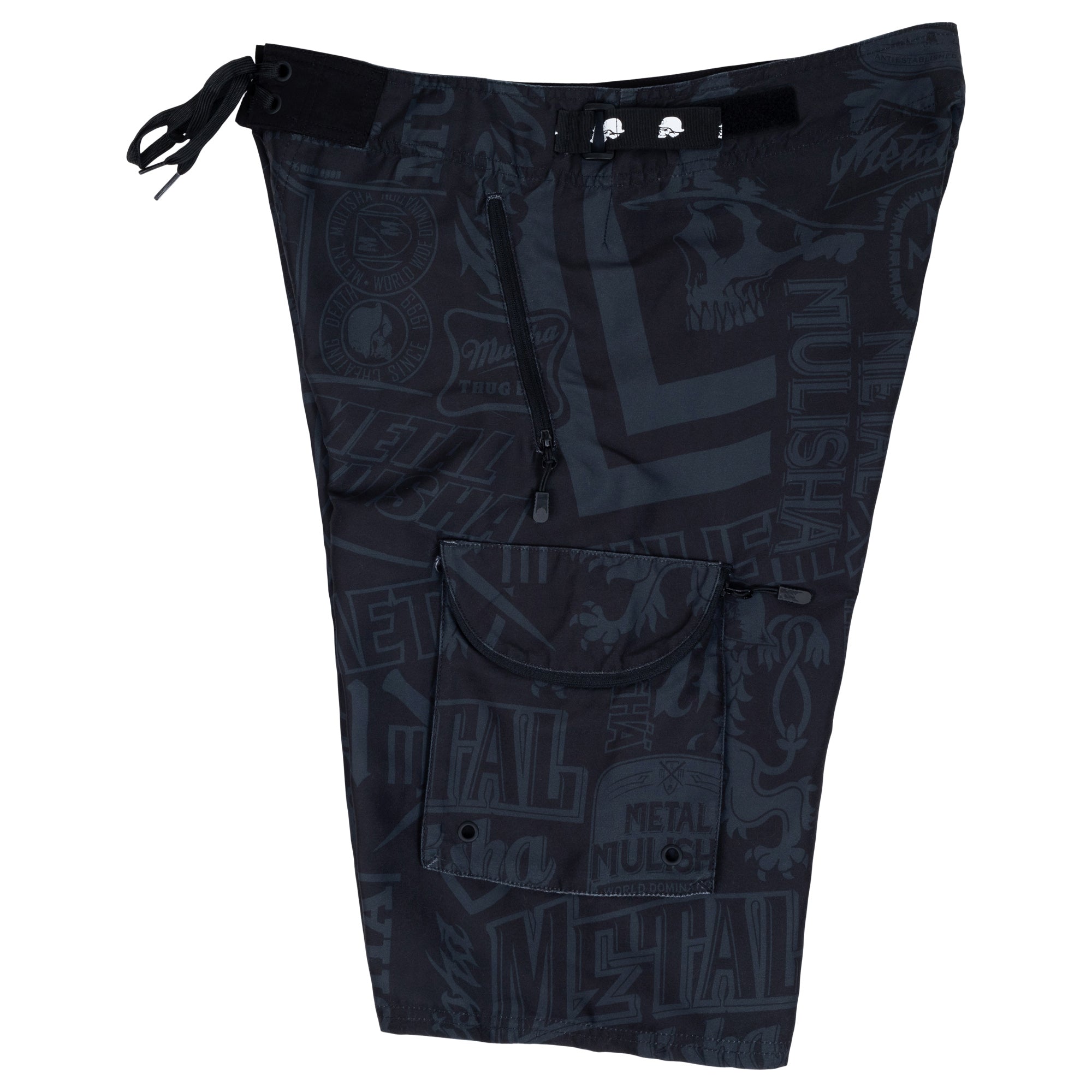 The Metal Mulisha D-Lush Boardshorts in Black and Grey allover print. These technical drinking boardshorts are built with enough pockets to carry a 6-pack! With a 22" outseam these are longer shorts that will go to or past your knees. On the wearer's right side there are duel leg pockets that each hold 1 beverage and these pockets are made to be a snug fit so even a narrow bottle can stay secure with the zipper open. The wearer's left side has a single big pocket that can fit 2 beers or whatever else you need to hold, and includes an elastic loop to keep keys from falling out. The shorts also have standard front zippered pockets that can each hold an additional beer. Plus a back right zippered pocket perfect for wallets. Everything is zippered to keep your stuff secured.