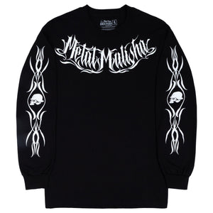 Metal Mulisha Twisted Long Sleeve T-Shirt in Black features a large front hit with Metal Mulisha prints down the side of both sleeves in White.
