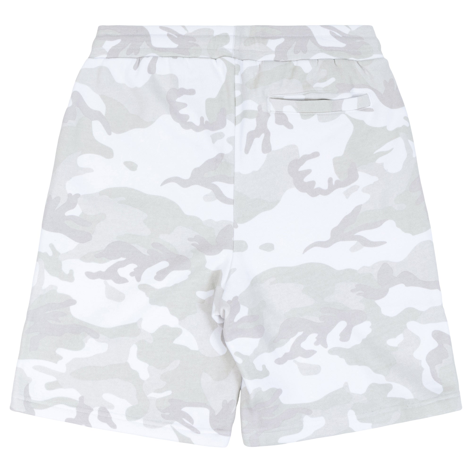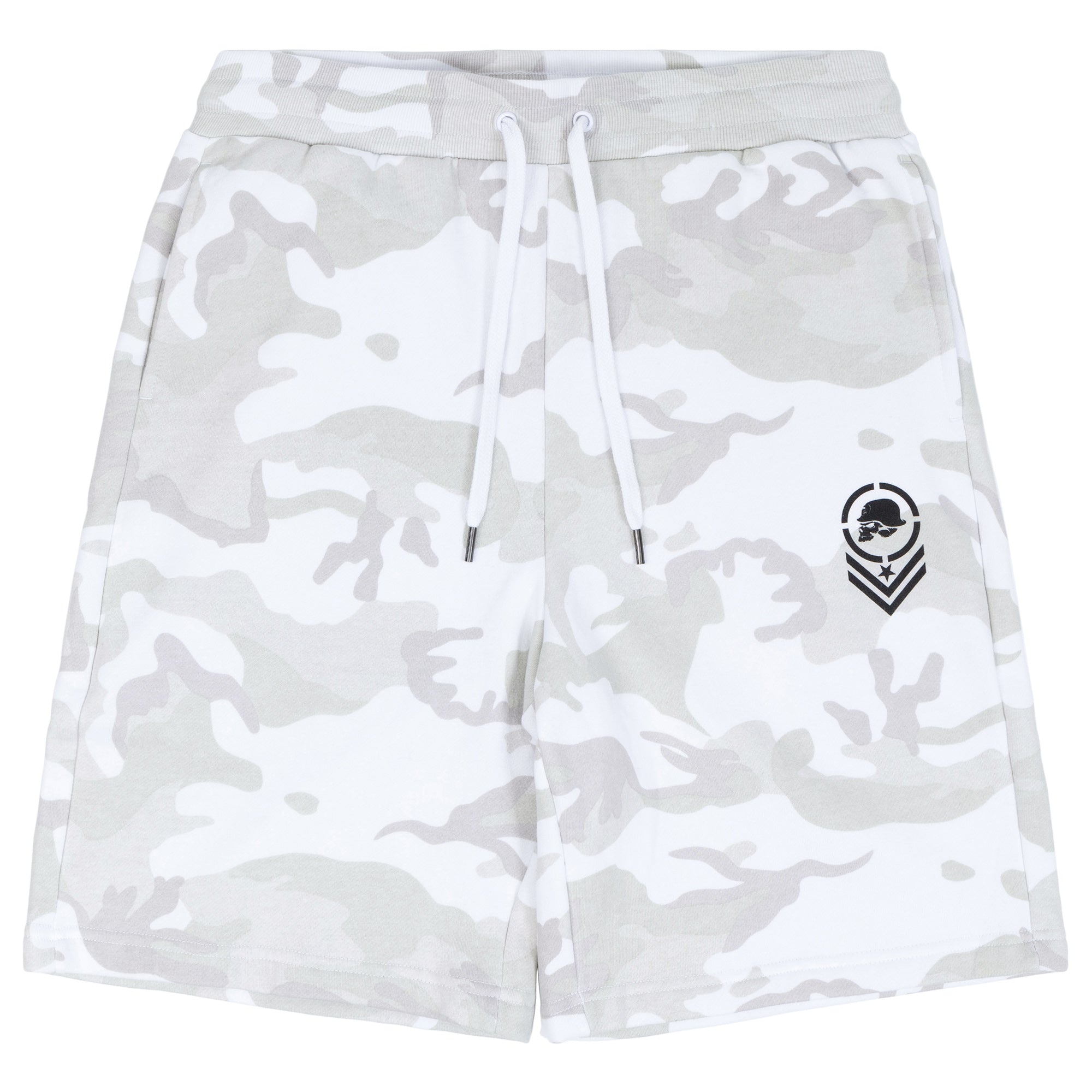 The Chillin Metal Mulisha Sweatshorts in White Camo are a midweight made from 80% Cotton 20% Polyester anti-pill fleece, they have 2 front pockets and 1 back pocket, Metal Mulisha Chevron Logo on wearer's left leg, and elastic waistband with shoestring drawcord.