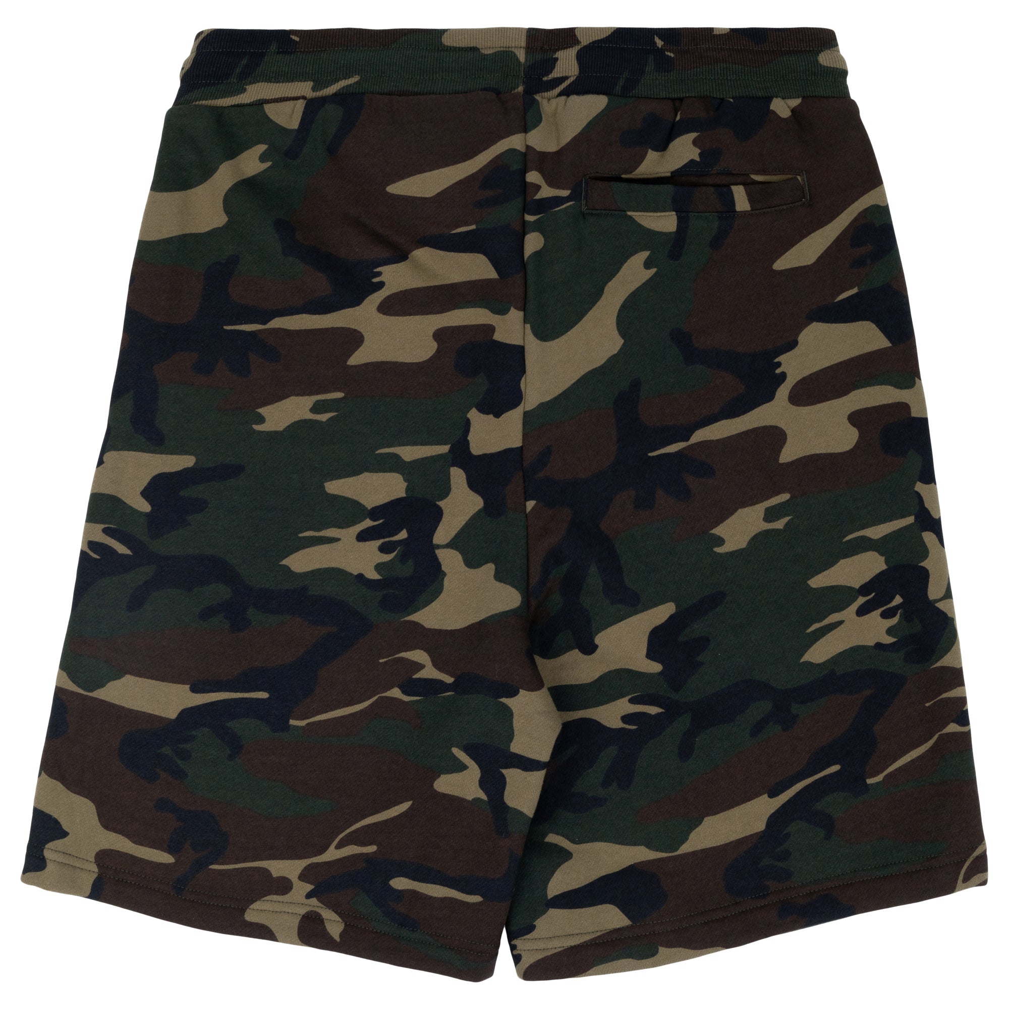 The Chillin Metal Mulisha Sweatshorts in Camo are a midweight made from 80% Cotton 20% Polyester anti-pill fleece, they have 2 front pockets and 1 back pocket, Metal Mulisha Chevron Logo on wearer's left leg, and elastic waistband with shoestring drawcord.