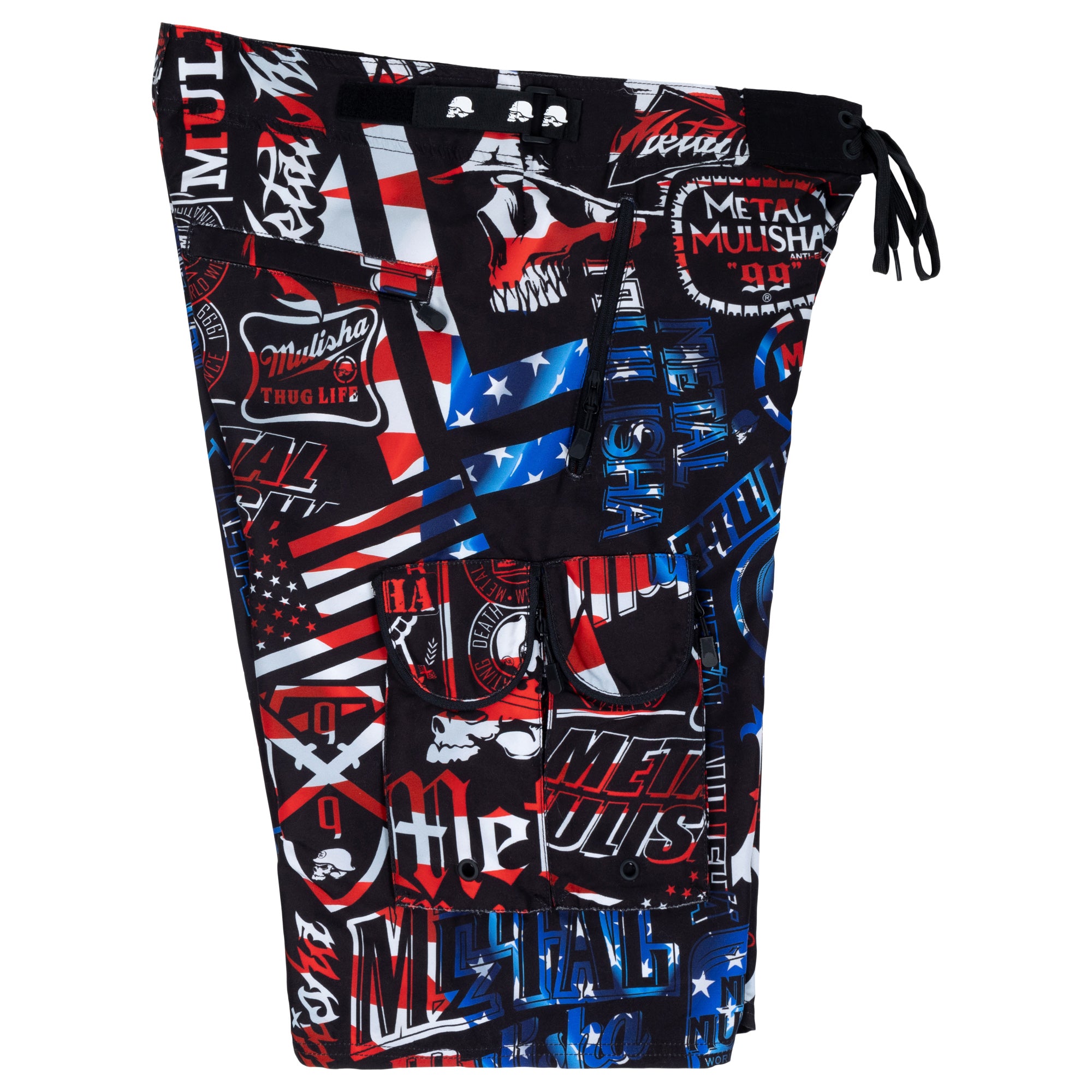 The Metal Mulisha D-Lush Boardshorts in Red, White and Blue allover print. These technical drinking boardshorts are built with enough pockets to carry a 6-pack! With a 22" outseam these are longer shorts that will go to or past your knees. On the wearer's right side there are duel leg pockets that each hold 1 beverage and these pockets are made to be a snug fit so even a narrow bottle can stay secure with the zipper open. The wearer's left side has a single big pocket that can fit 2 beers or whatever else you need to hold, and includes an elastic loop to keep keys from falling out. The shorts also have standard front zippered pockets that can each hold an additional beer. Plus a back right zippered pocket perfect for wallets. Everything is zippered to keep your stuff secured.