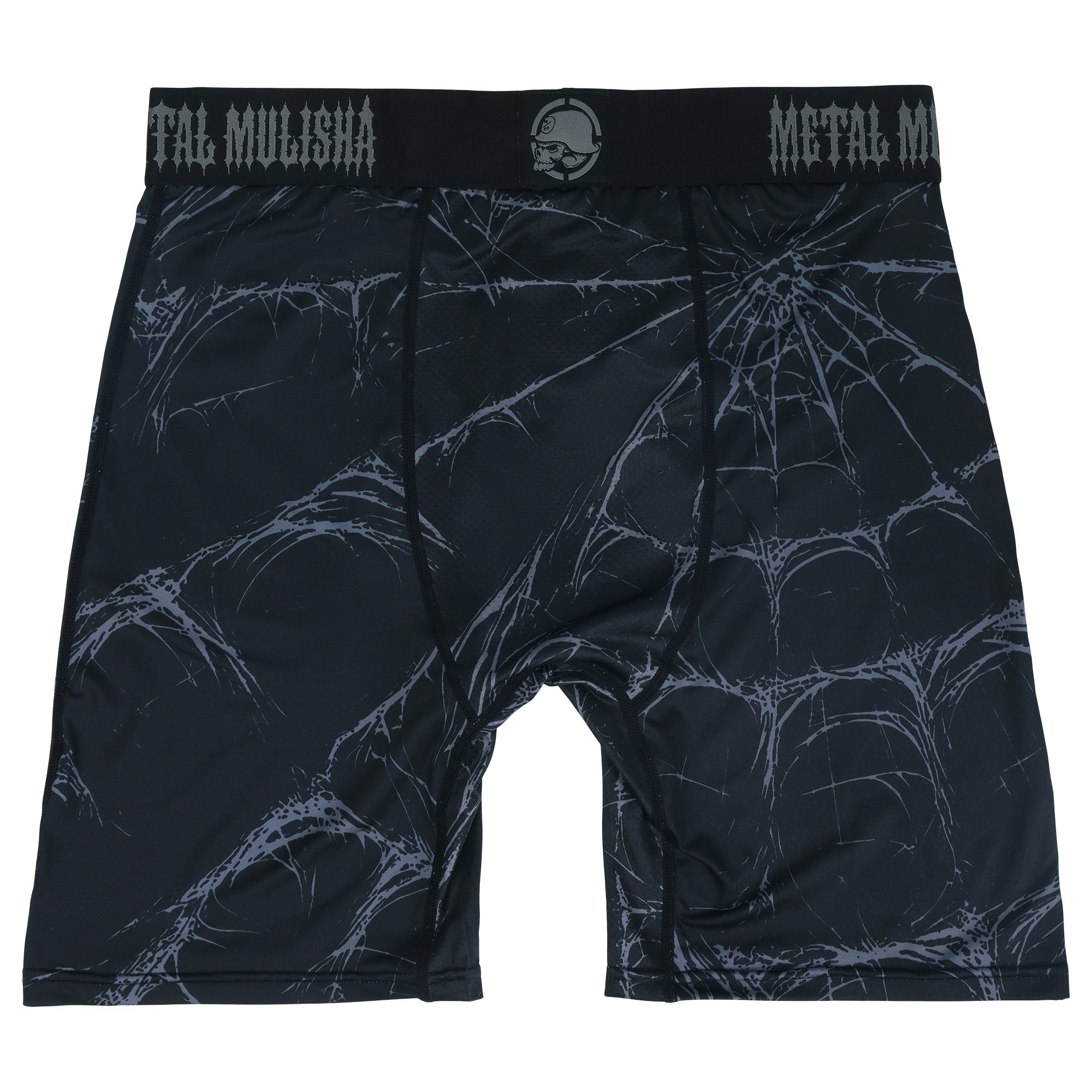 The Webbed Boxer Shorts in Black with a Grey web pattern all over and a chevron Metal Mulisha skull on the front and a custom Metal Mulisha comfort waistband.