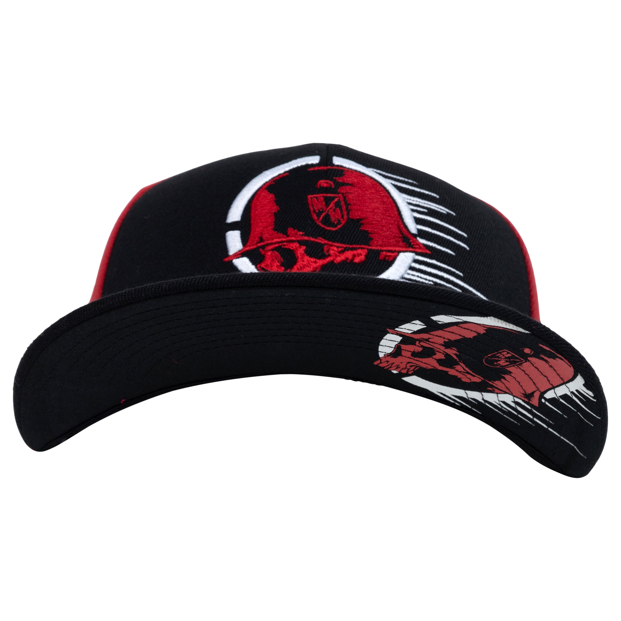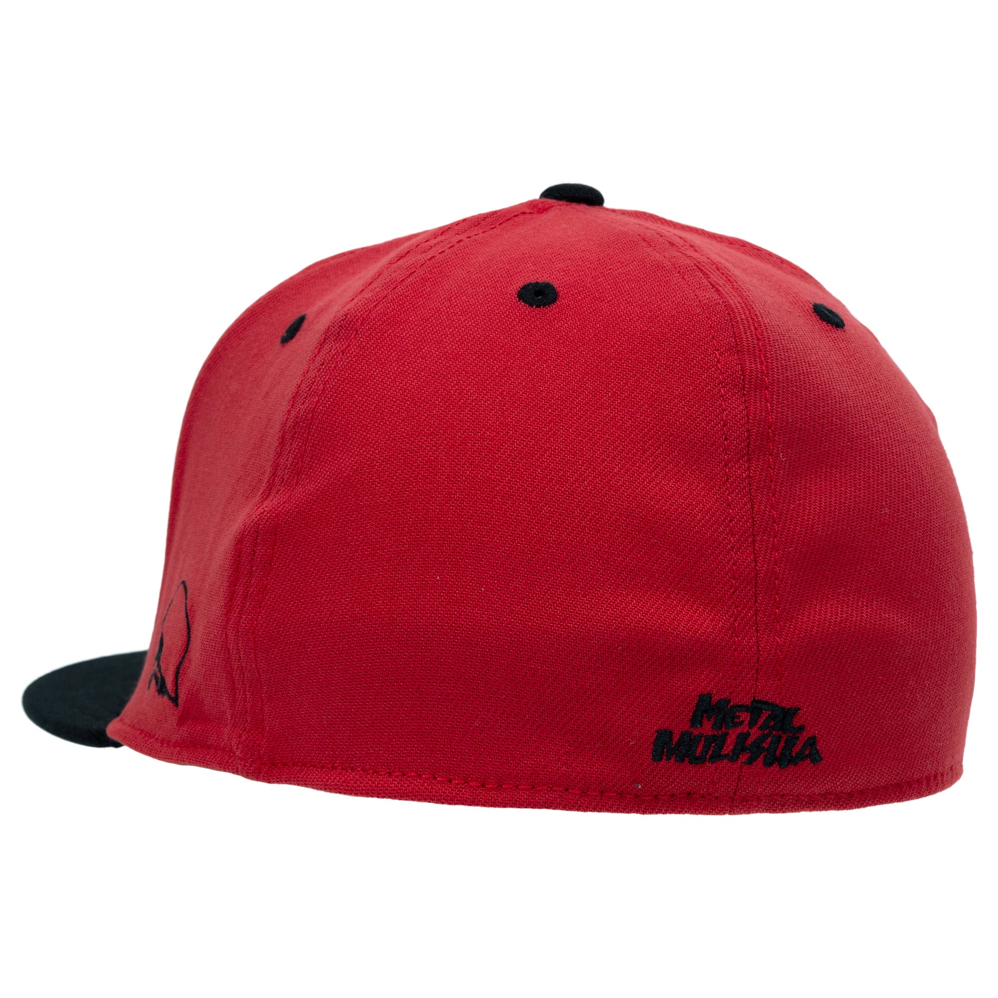 The Beam Flex Hat in Black and Red features a large skull embroidery on the front panels in Red and White, custom printed underbill, custom sweatband, all over Red on back panels, small skull on left side in Black and Metal Mulisha logo on back in Black.
