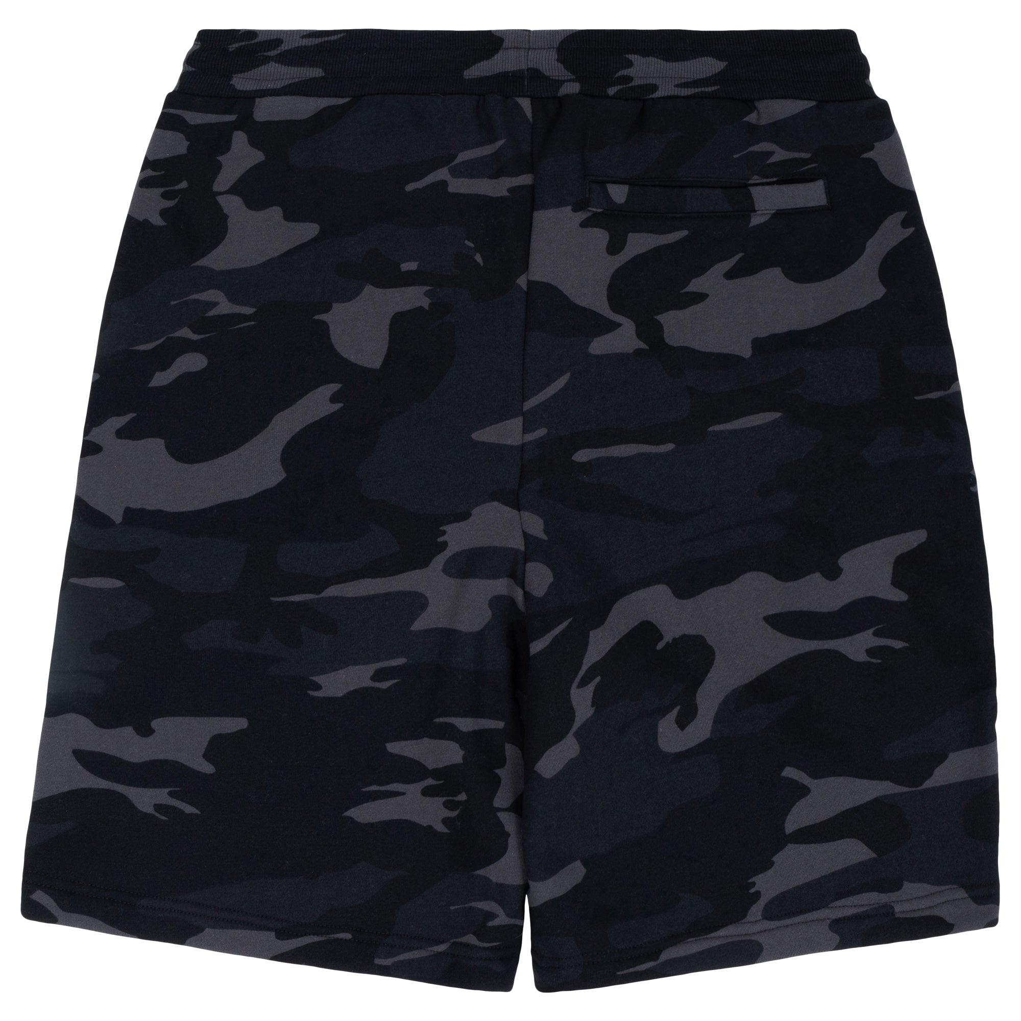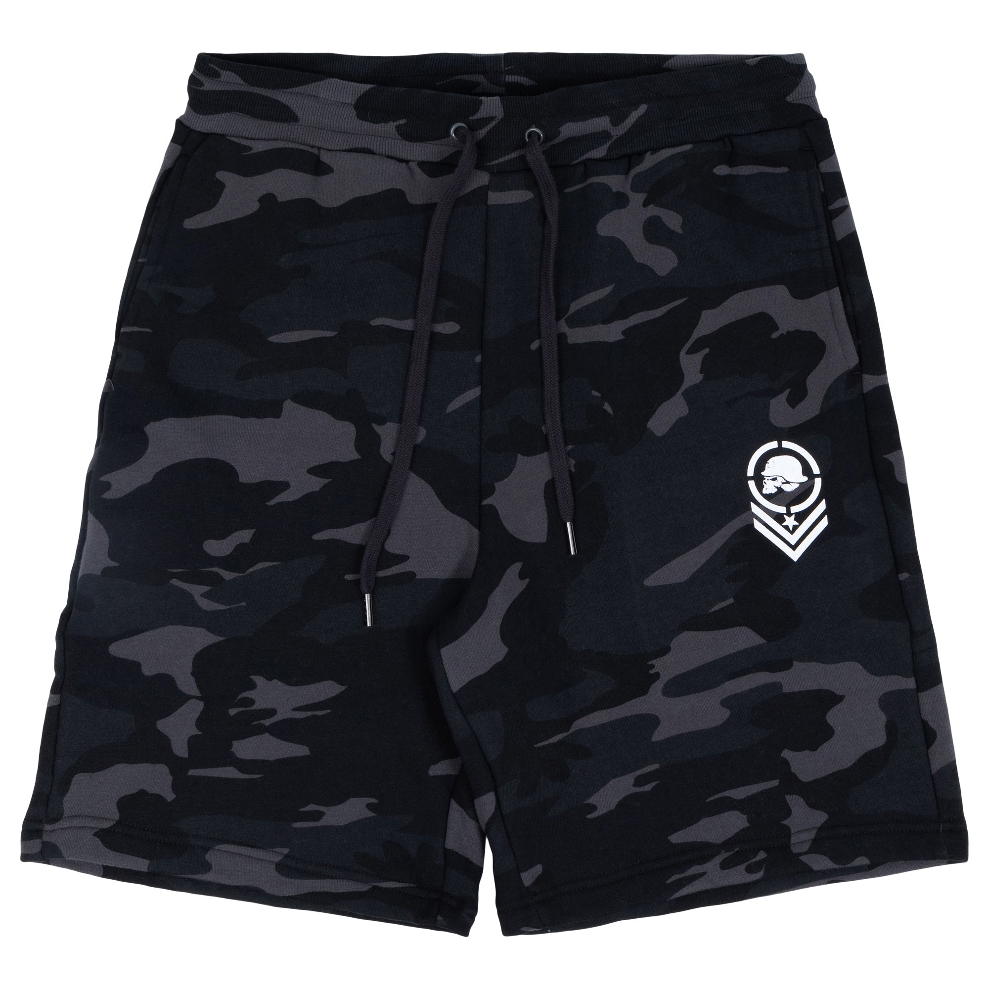 The Chillin Metal Mulisha Sweatshorts in Black Camo are a midweight made from 80% Cotton 20% Polyester anti-pill fleece, they have 2 front pockets and 1 back pocket, Metal Mulisha Chevron Logo on wearer's left leg, and elastic waistband with shoestring drawcord.