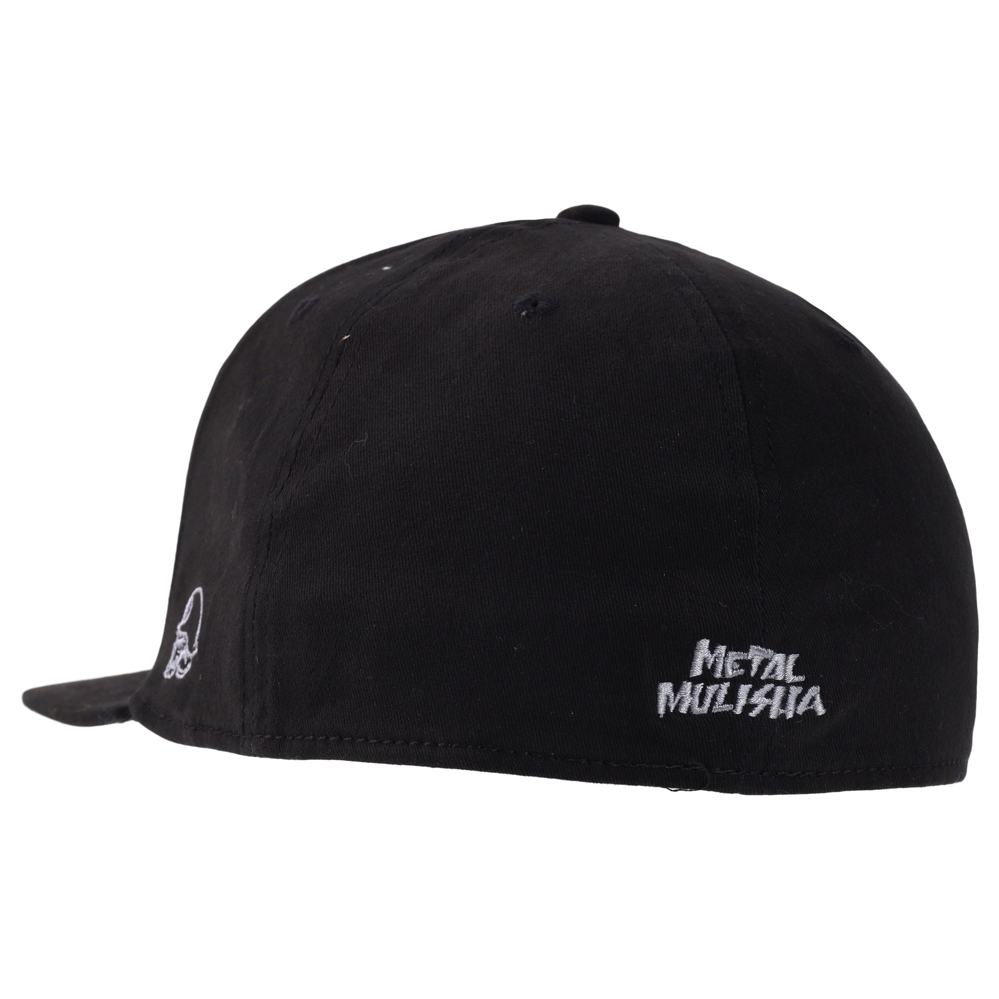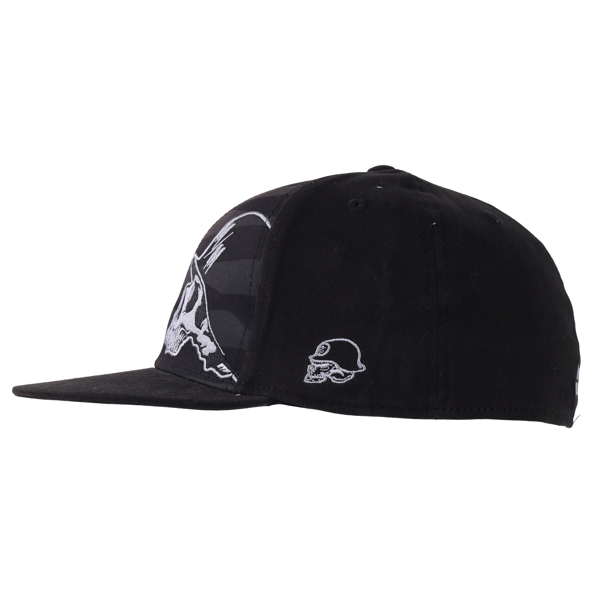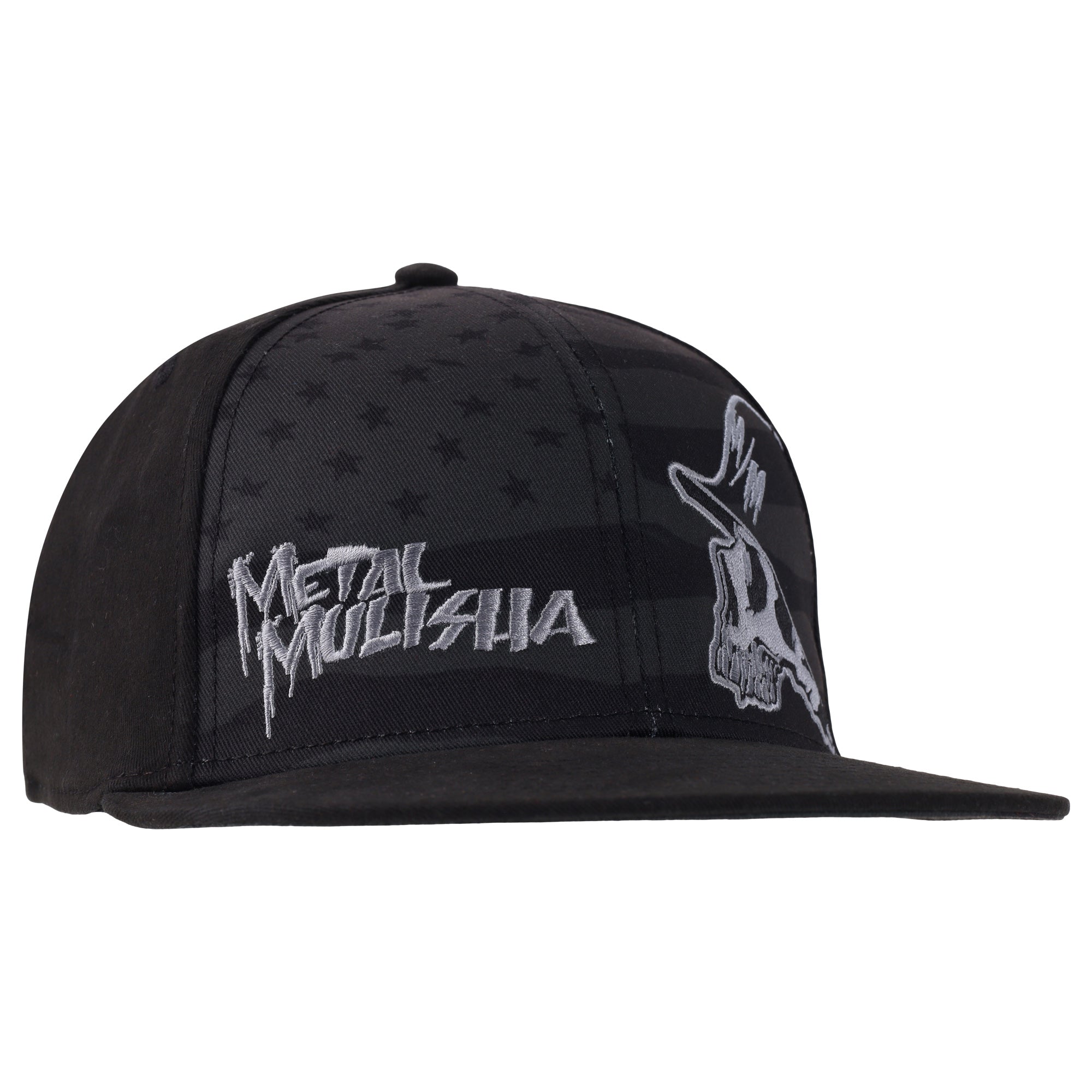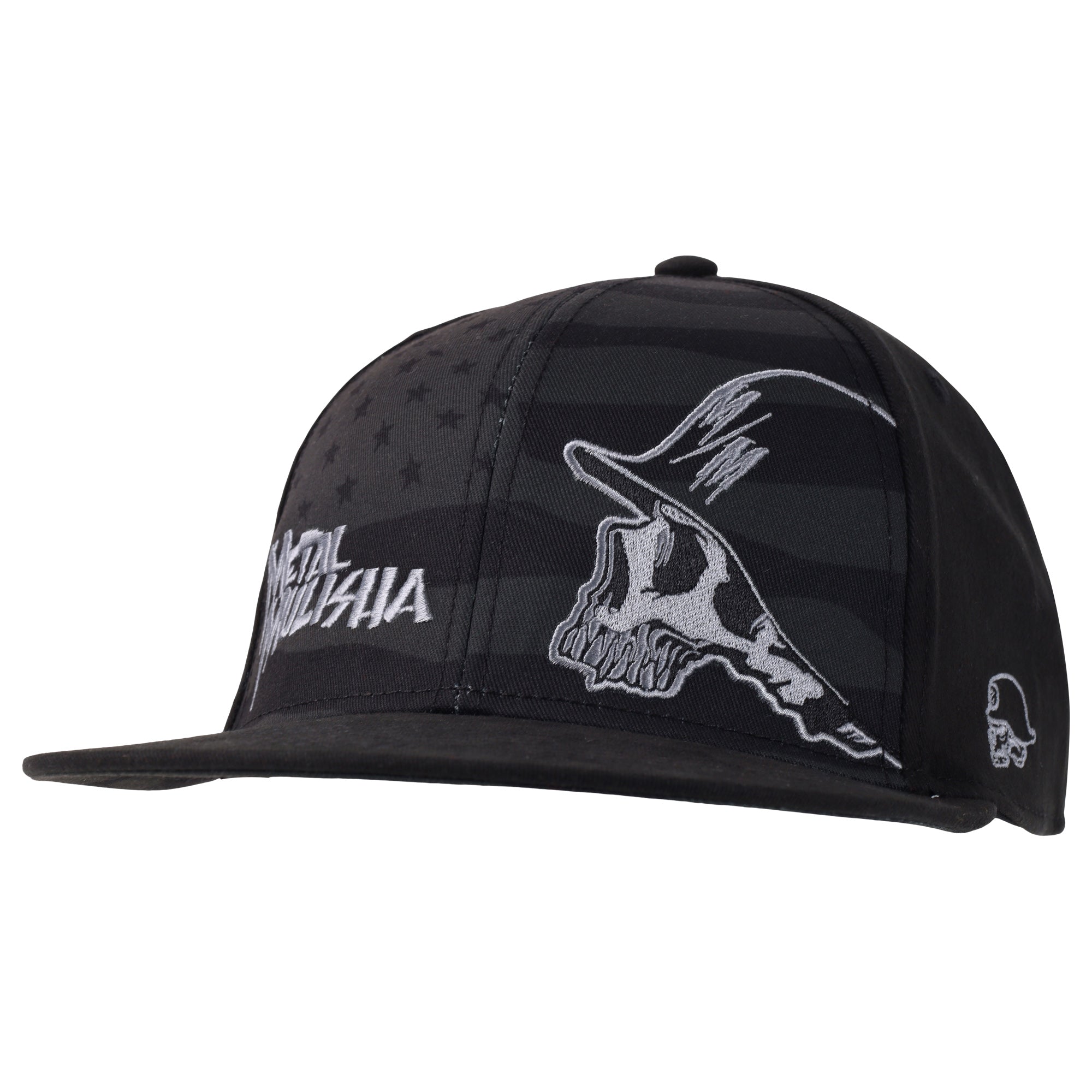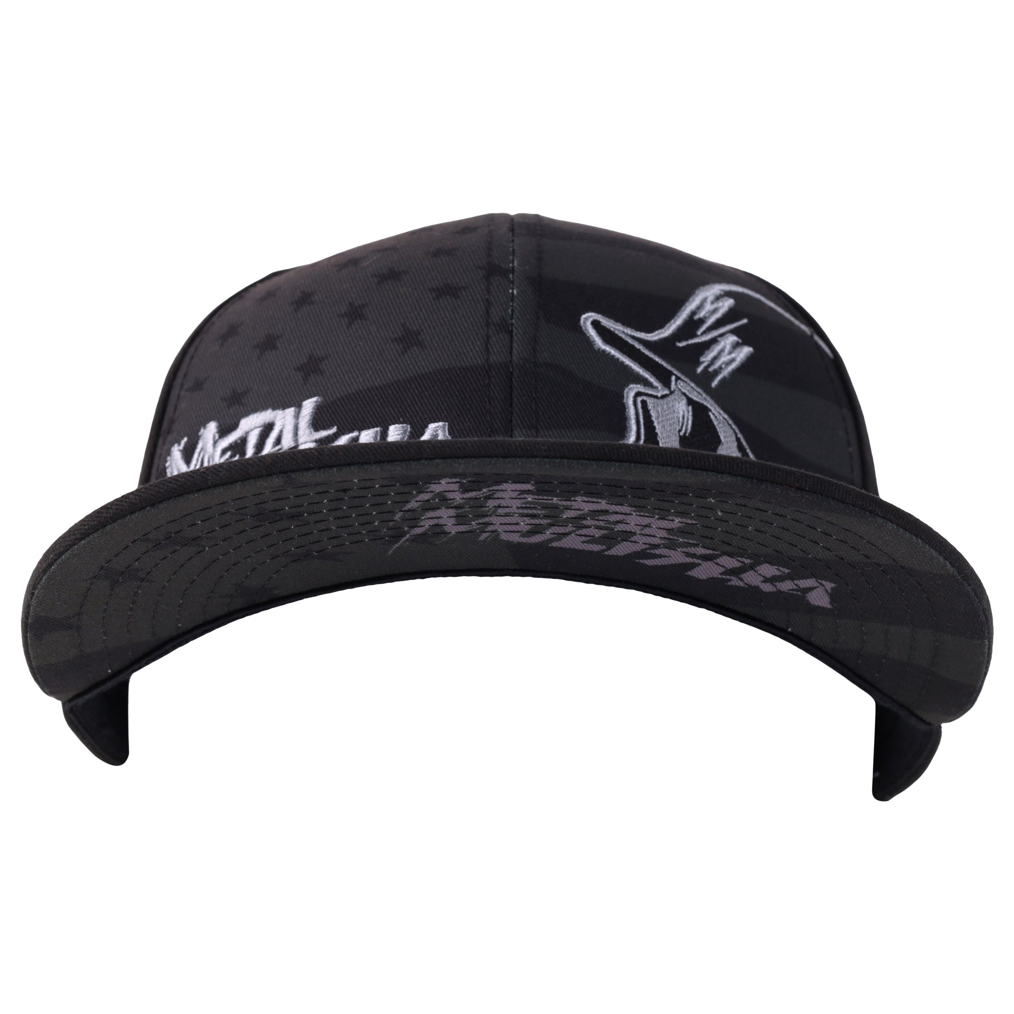 The Metal Mulisha D-Day Flex Hat in Black features a tonal black and grey sublimated American Flag background on the front panels, a Metal Mulisha skull embroidery on wearer's front left panel and Metal Mulisha embroidery on the right panel, small Metal Mulisha embroidery on back center, and small helmet embroidery on side, American Flag under bill print, custom printed internal seam tape. Naturally a flat bill, but easily curved. 59% Cotton, 40% Polyester, 1% Spandex