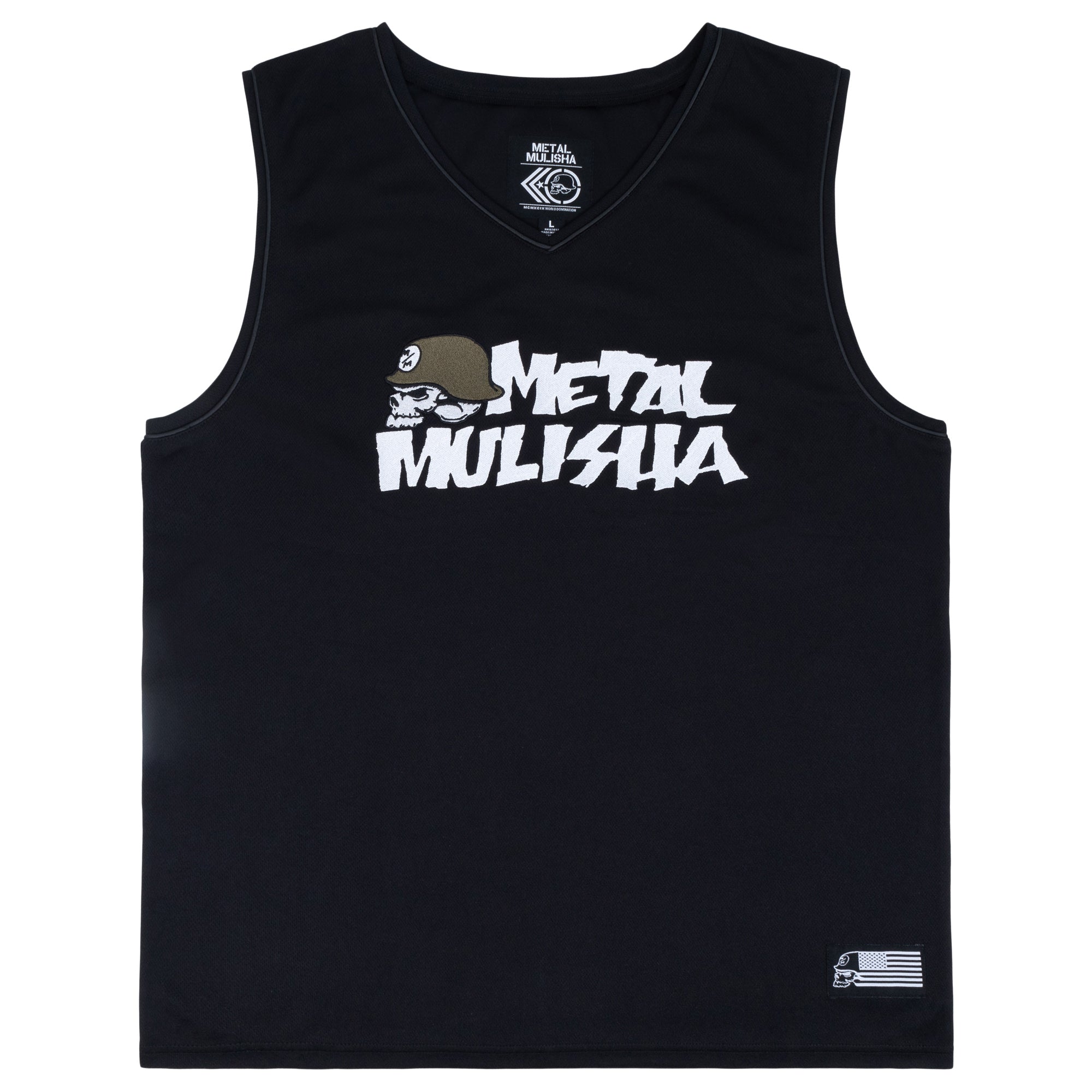 Metal Mulisha OG Icon Jersey Tank in Black features a crew neck with contrast grey piping along neck seams and arm seams, a large front chest embroidery, and a Metal Mulisha flag woven label on the bottom left of the jersey.