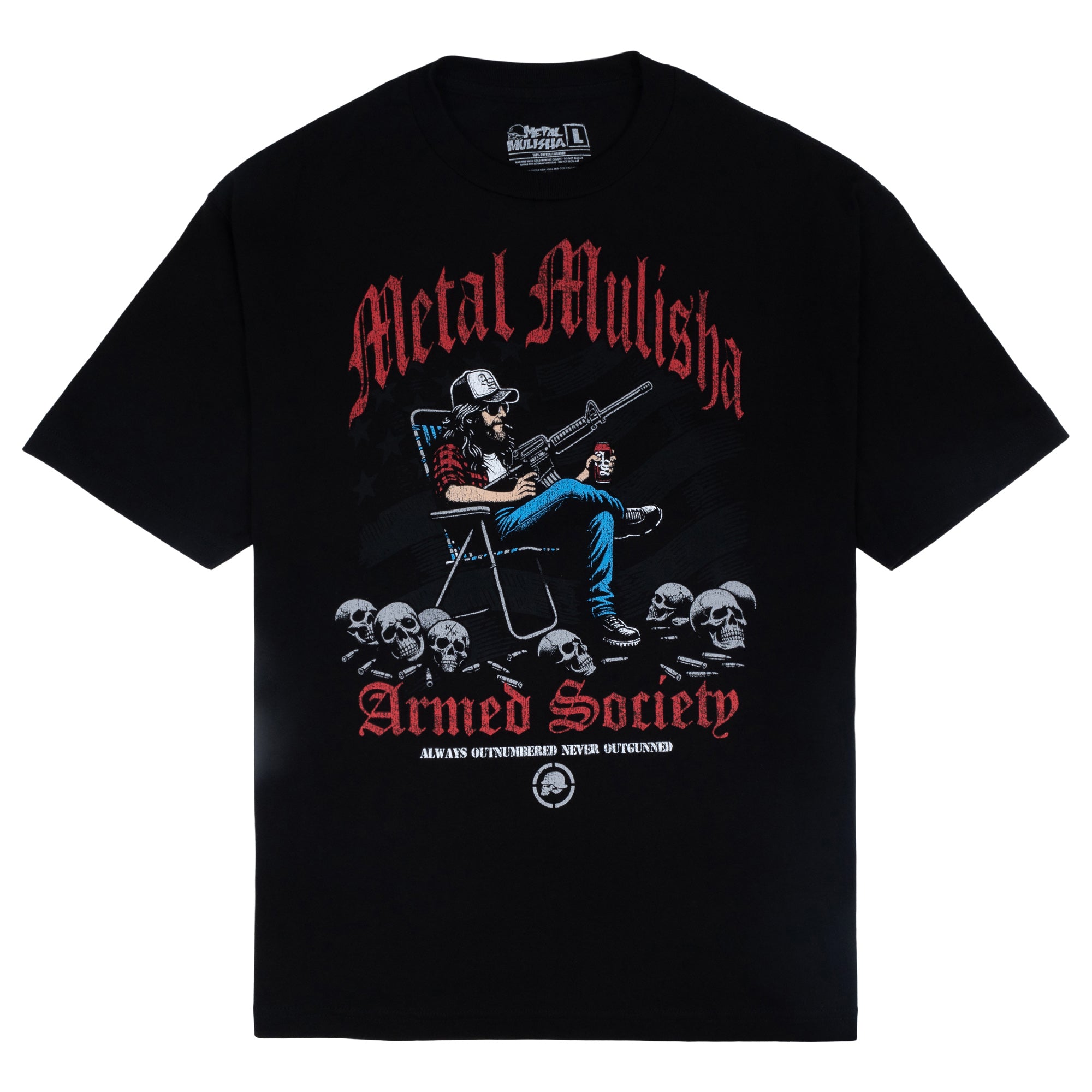 The Outgunned Tee in Black features a large front hit in Red, White and Grey.