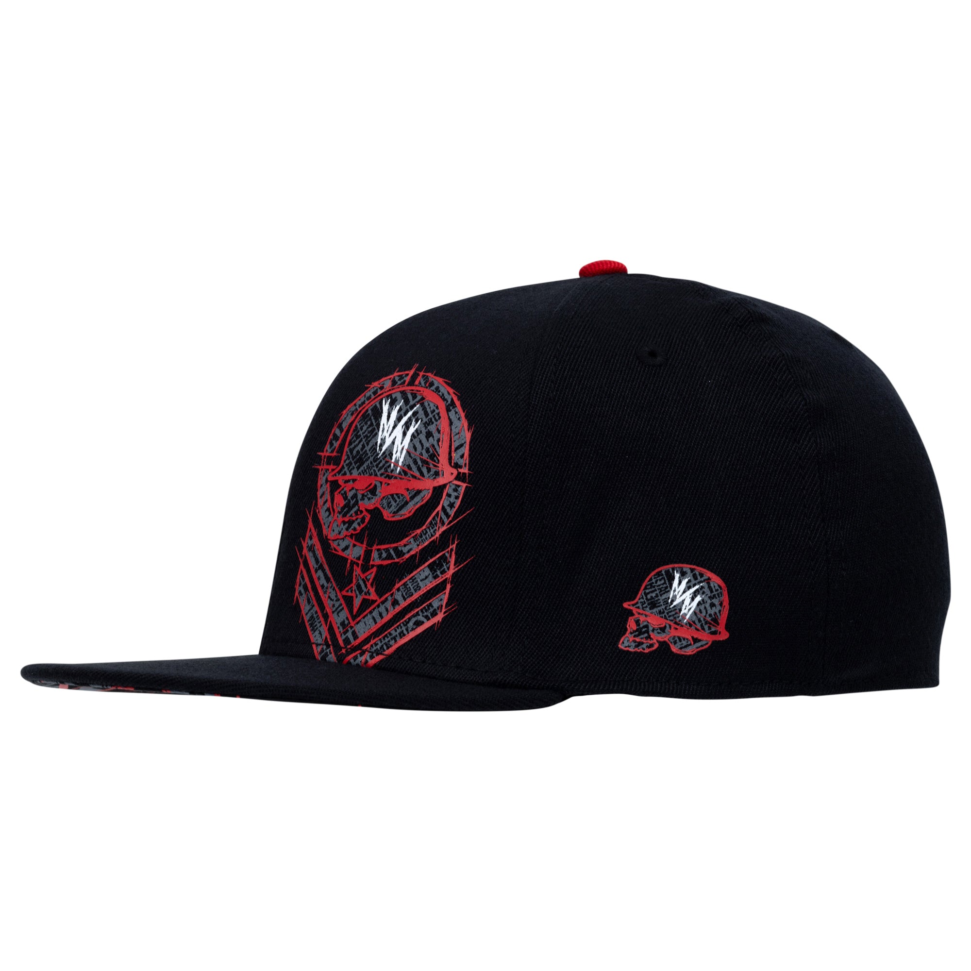 The Shred Flex Hat in Black features a large screenprint in Grey, White and Red on the left front panel, custom printed underbill, custom sweatband, small skull on left side in Red, Grey and White and M/M logo on back in Red.