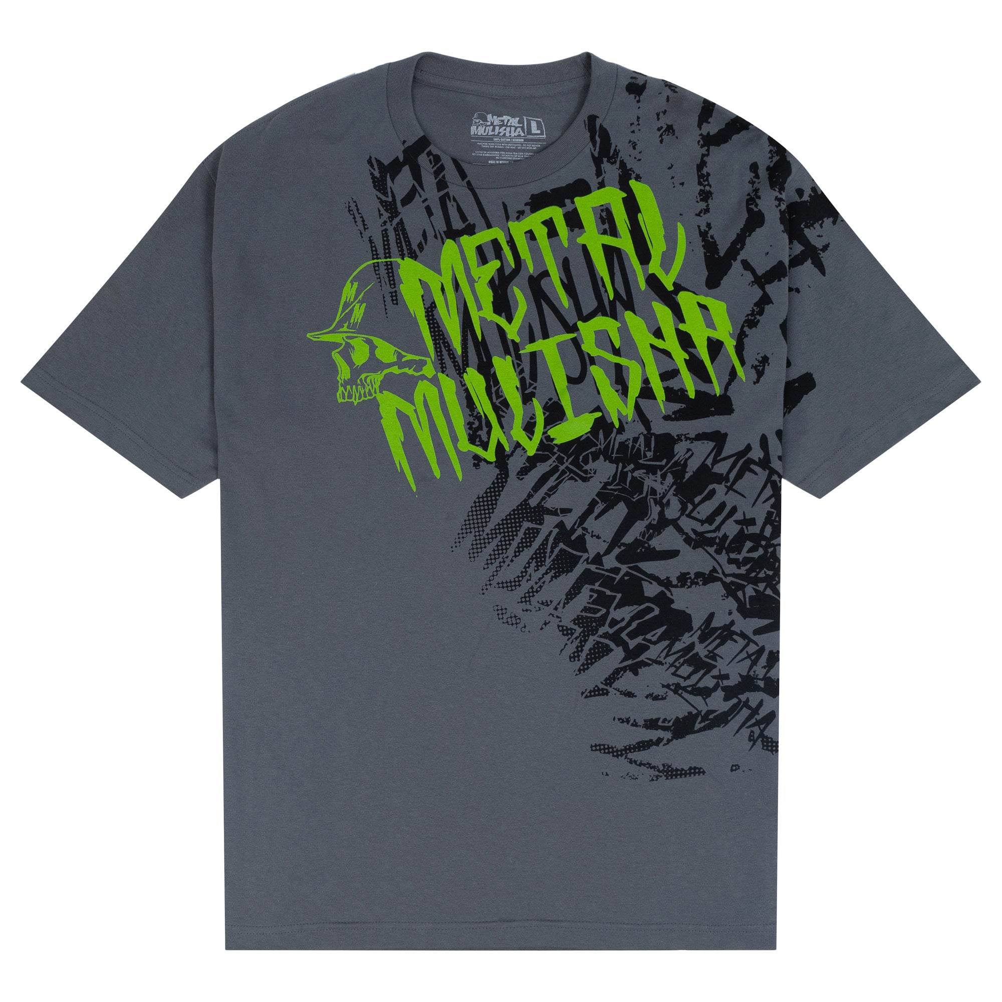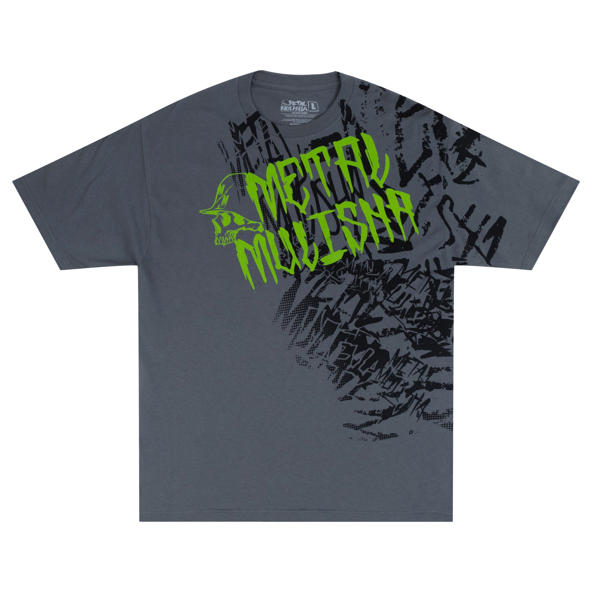 The Unfair Tee in Charcoal Grey features a massive all over front hit in Black and Green.