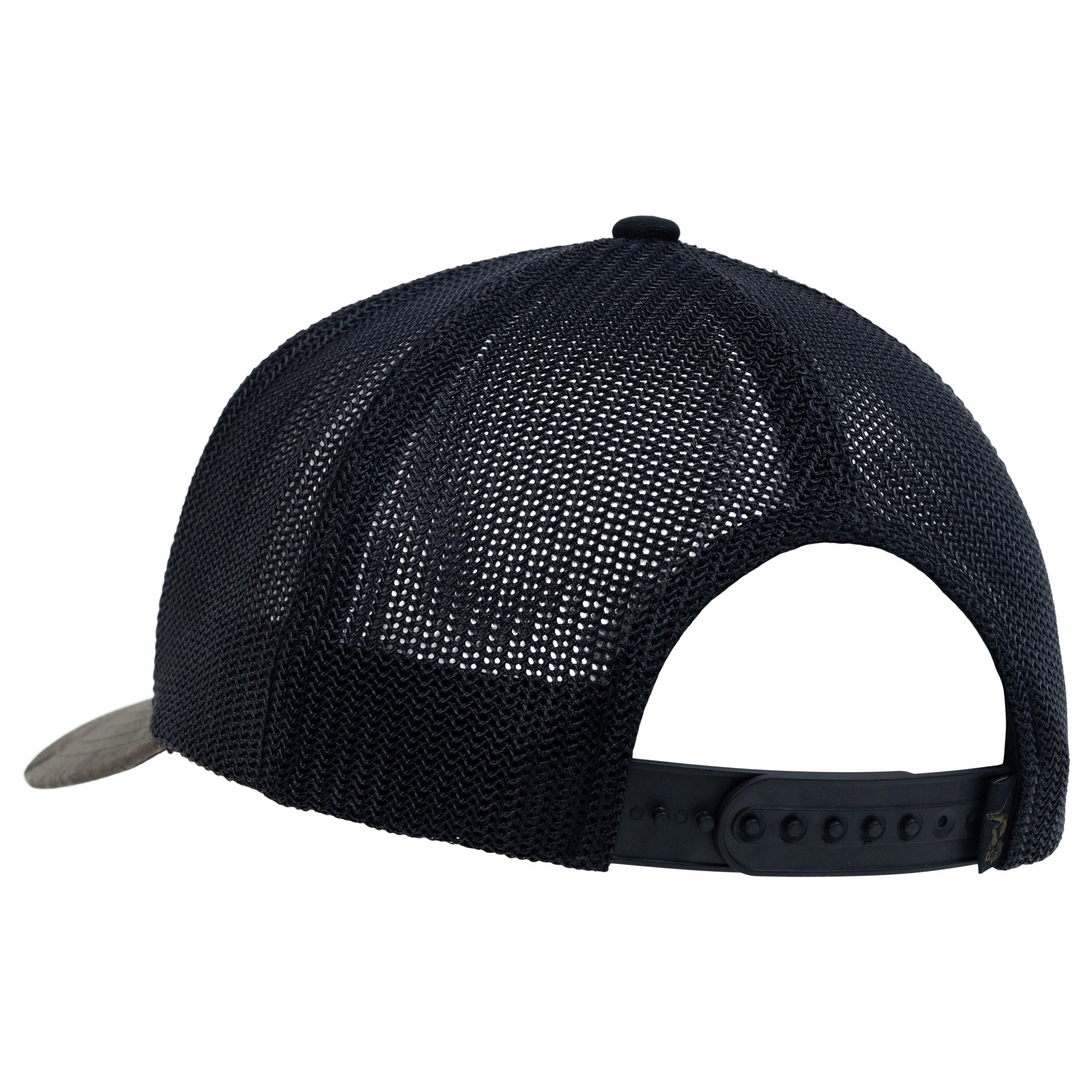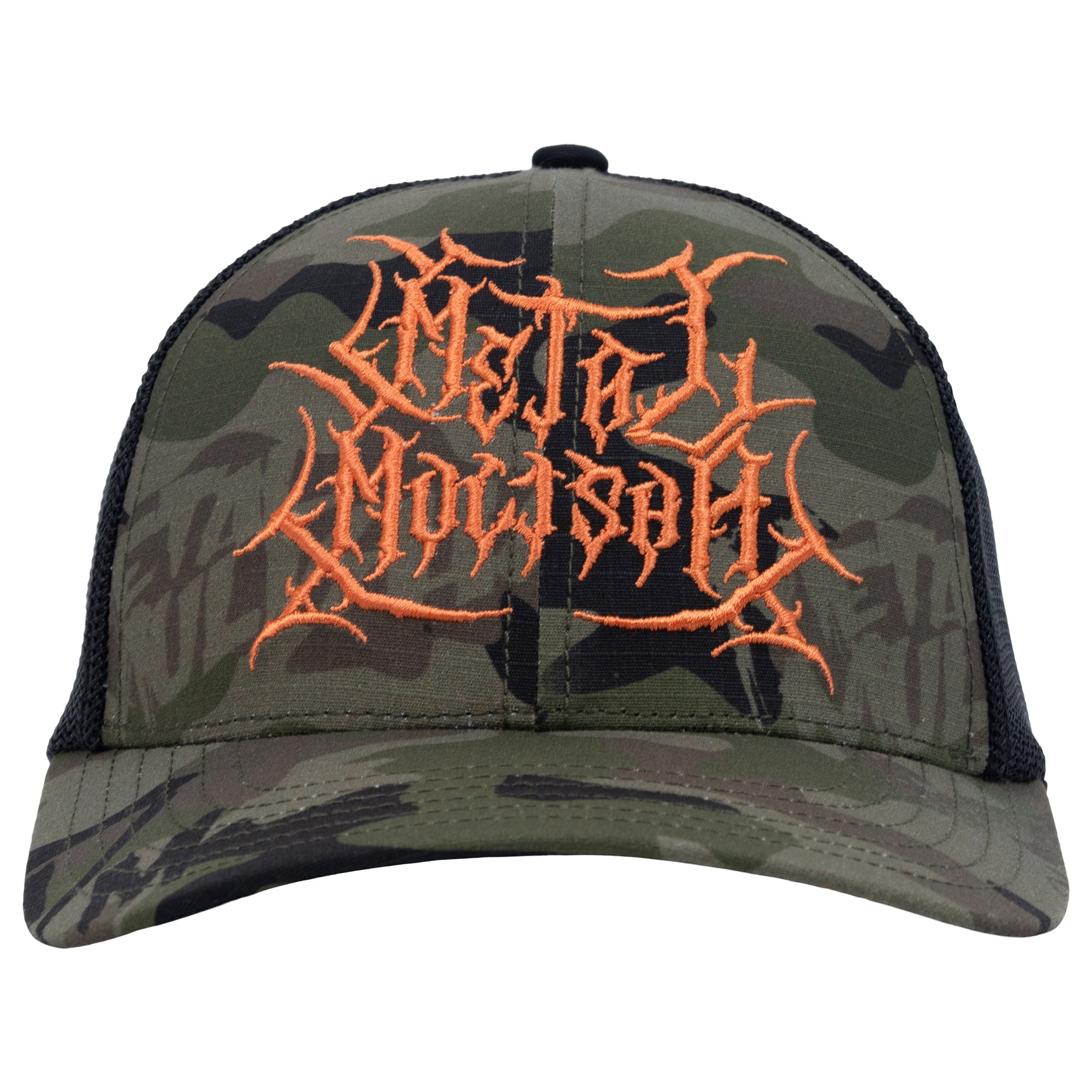 The Werd Snapback Hat in Camo features a large Metal Mulisha logo embroidery on the front panels in Orange, custom Metal Mulisha camo print, custom inseam taping with Metal Mulisha logo, soft rubberized snap, and a custom woven label on snapback.