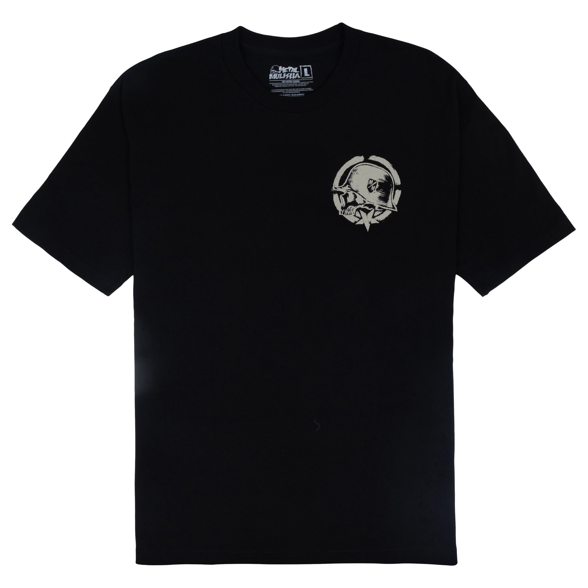 The Chalk Tee in Black features a small front and a large back screenprint in Tan.