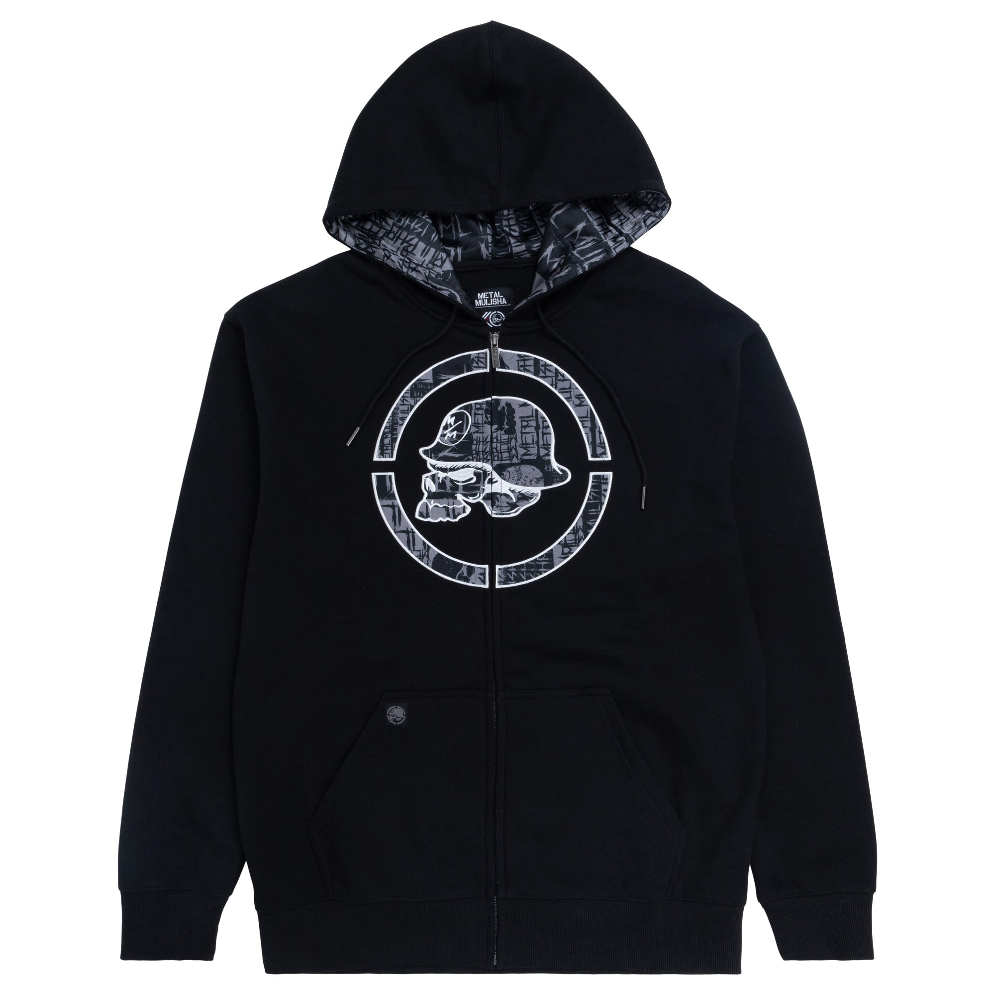 The Deposit Heavyweight Zip Hoodie in Black. This Hoodie features a large custom printed applique embroidered on the front of the hoodie in White, Grey and Black satin, custom all over print hood lining, custom metal zipper and metal tip drawstrings, and a custom woven metal mulisha label on the kangaroo pocket. The heaviest weight fleece we offer, it's built like a tank yet soft and comfortableand has a generous relaxed fit that is true to size.