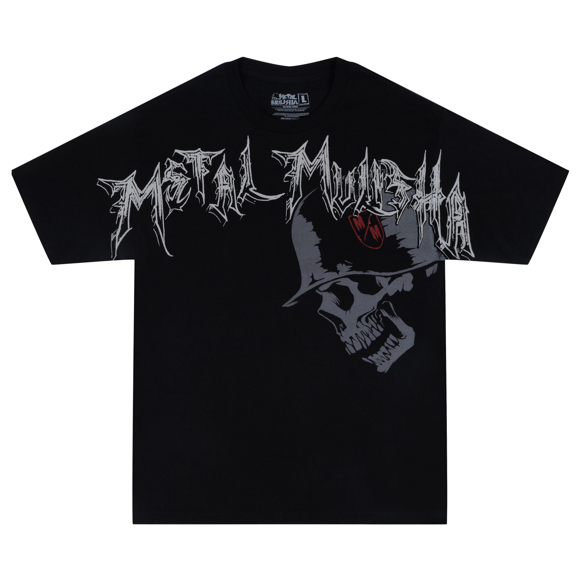 The Gravity Tee in Black features a large Metal Mulisha logo across the front from the left sleeve to the right sleeve with an MM skull in Grey.