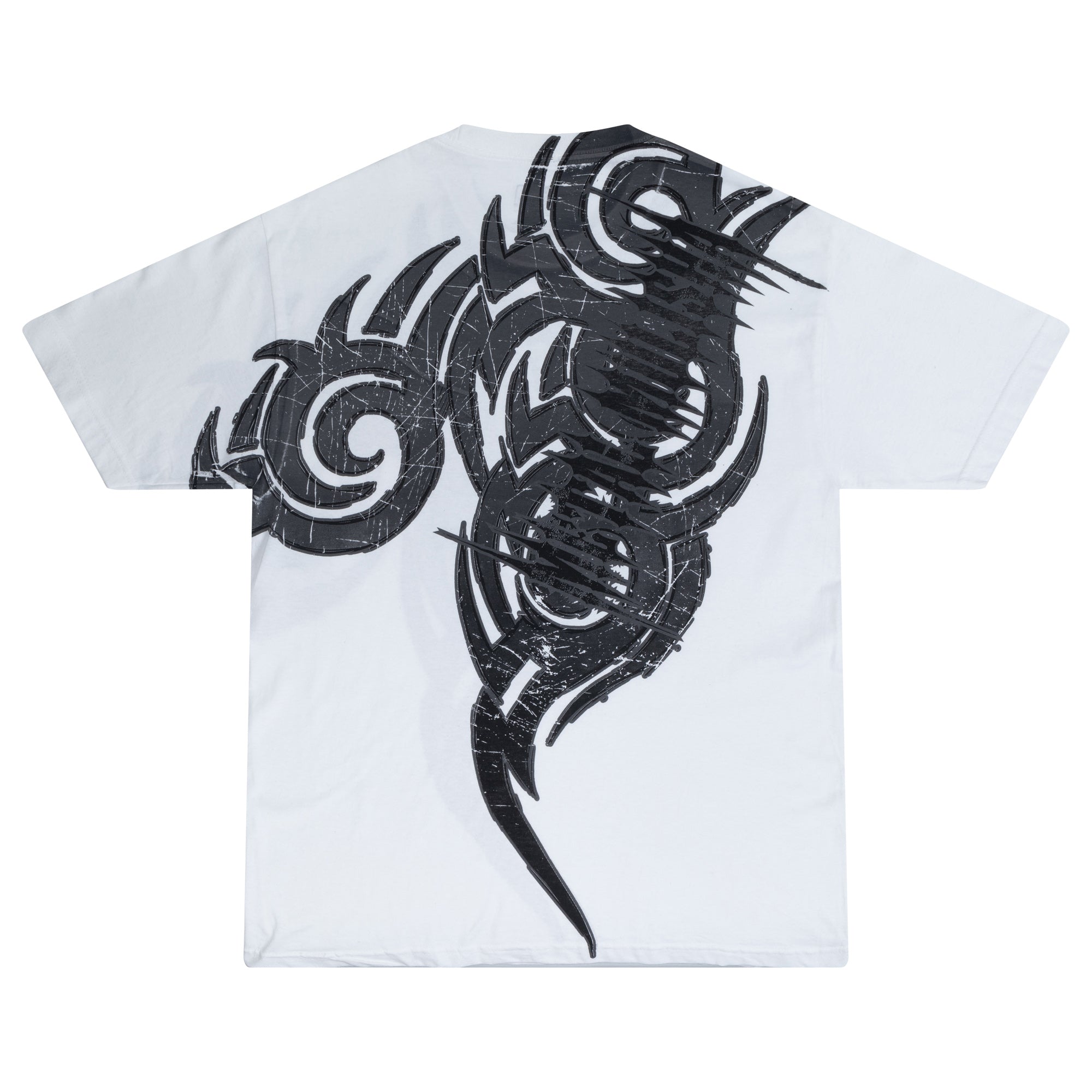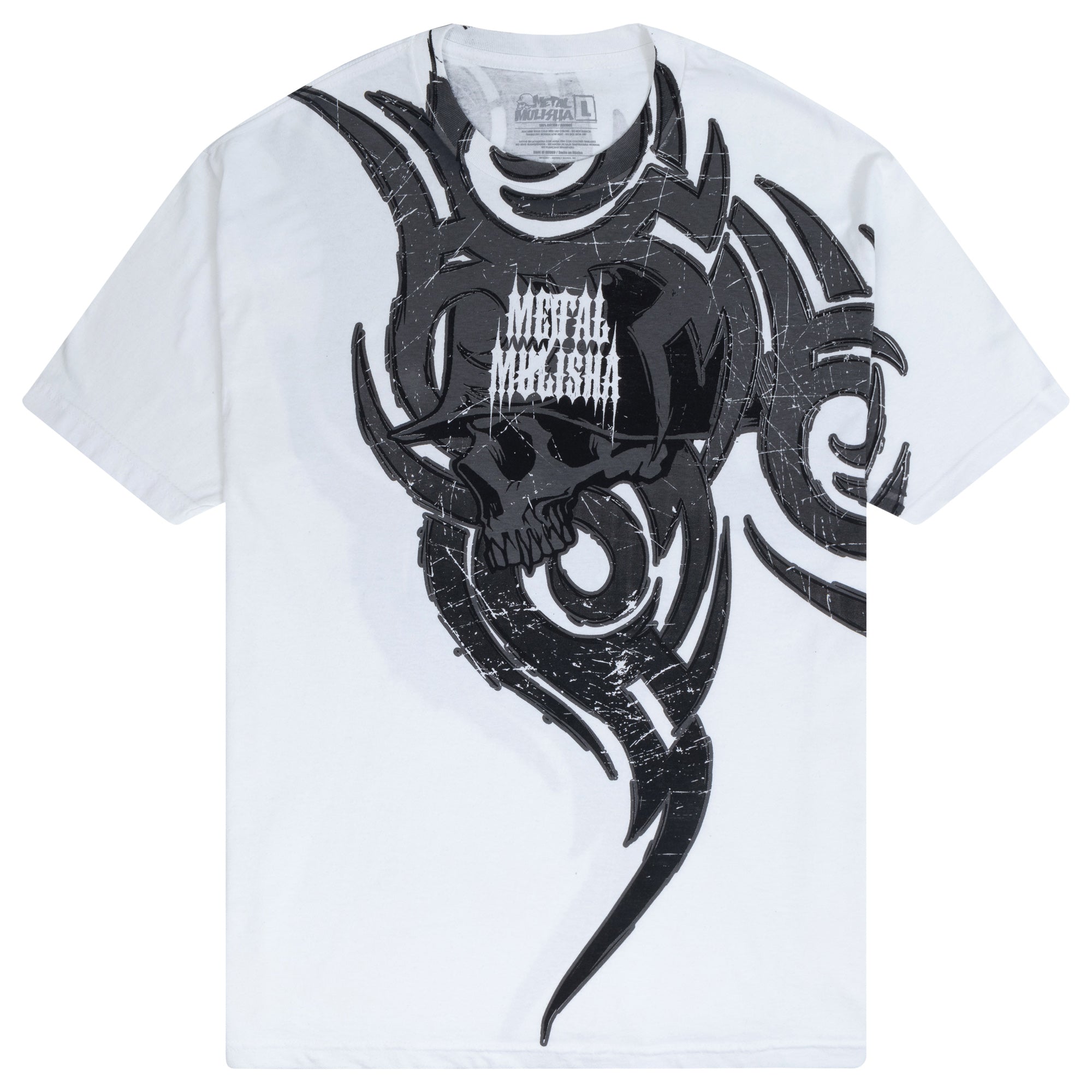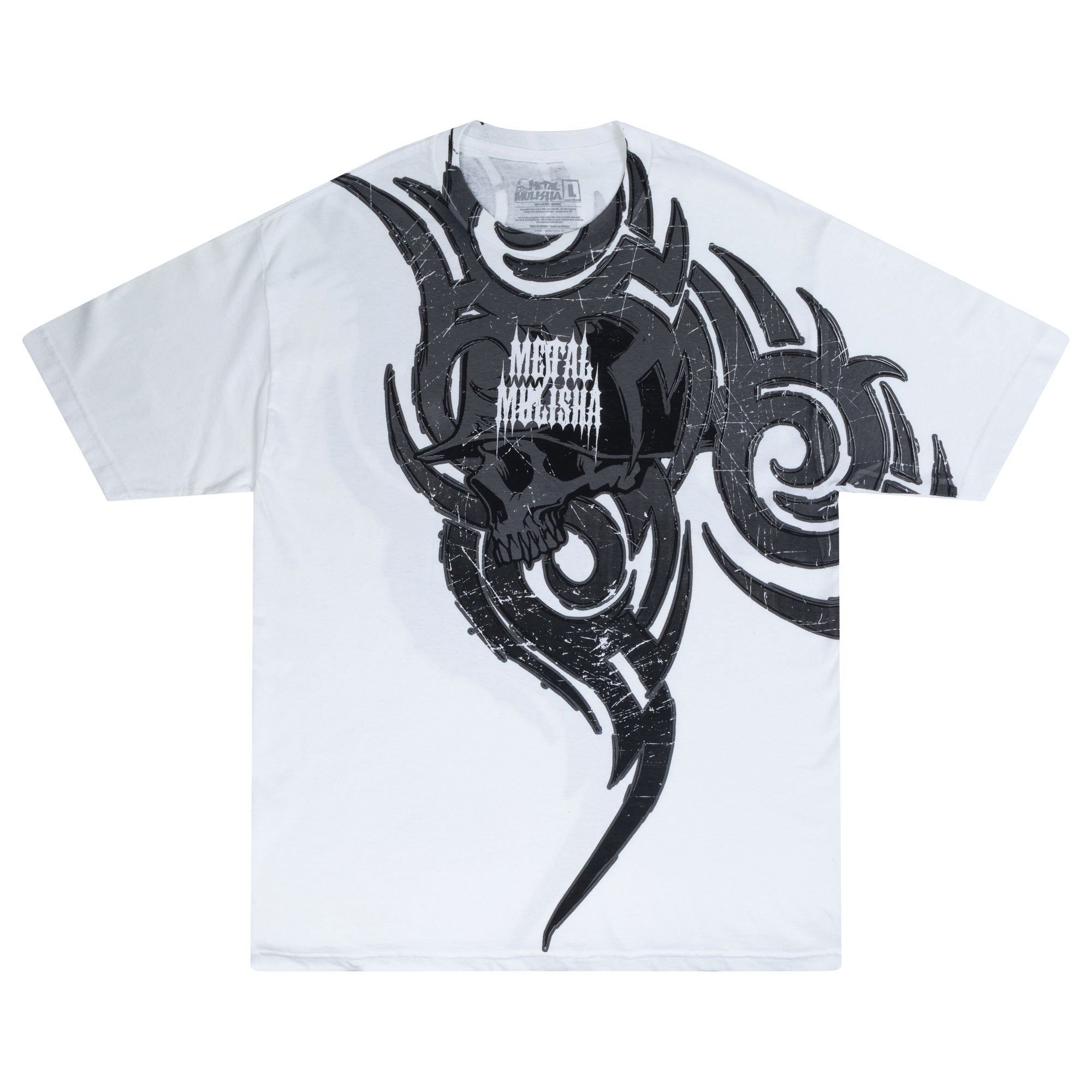 The Metal Tribe Tee in White features a large front hit and large back print in Black and Grey.