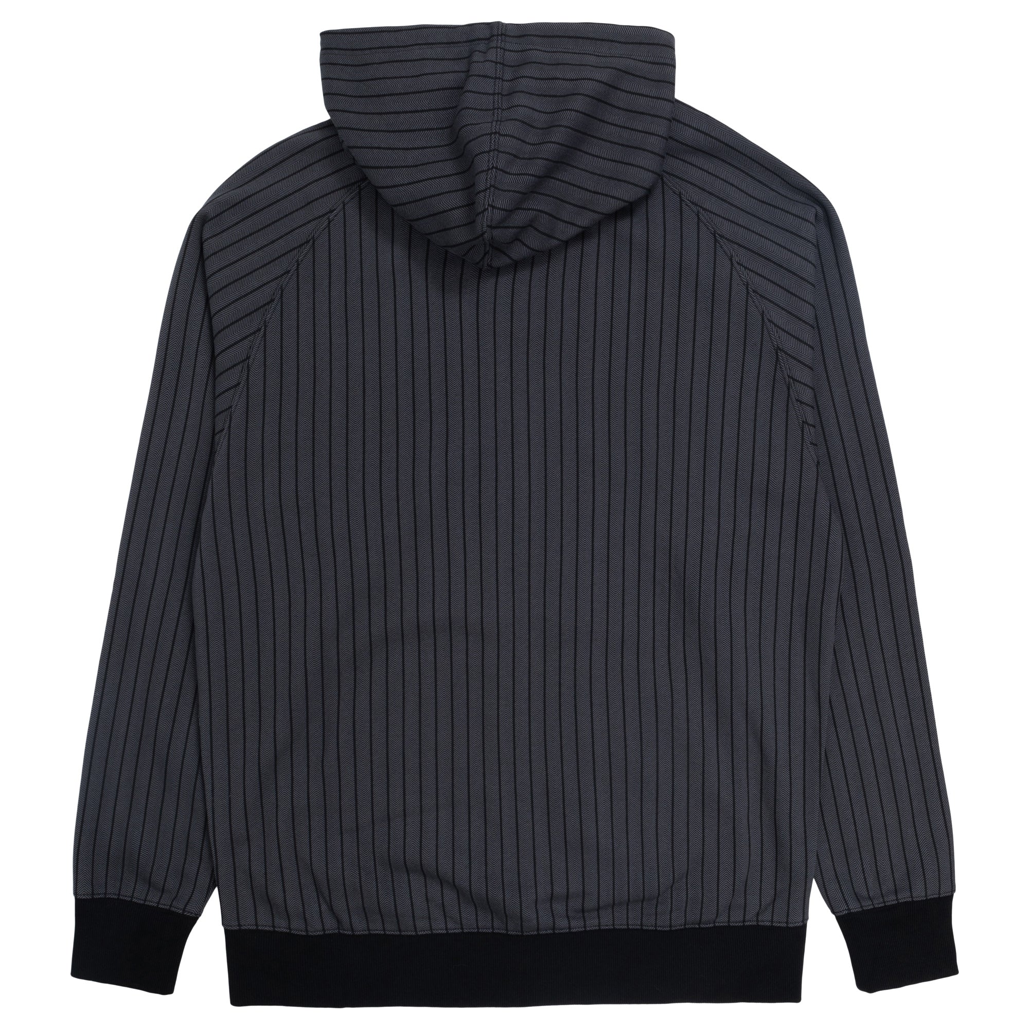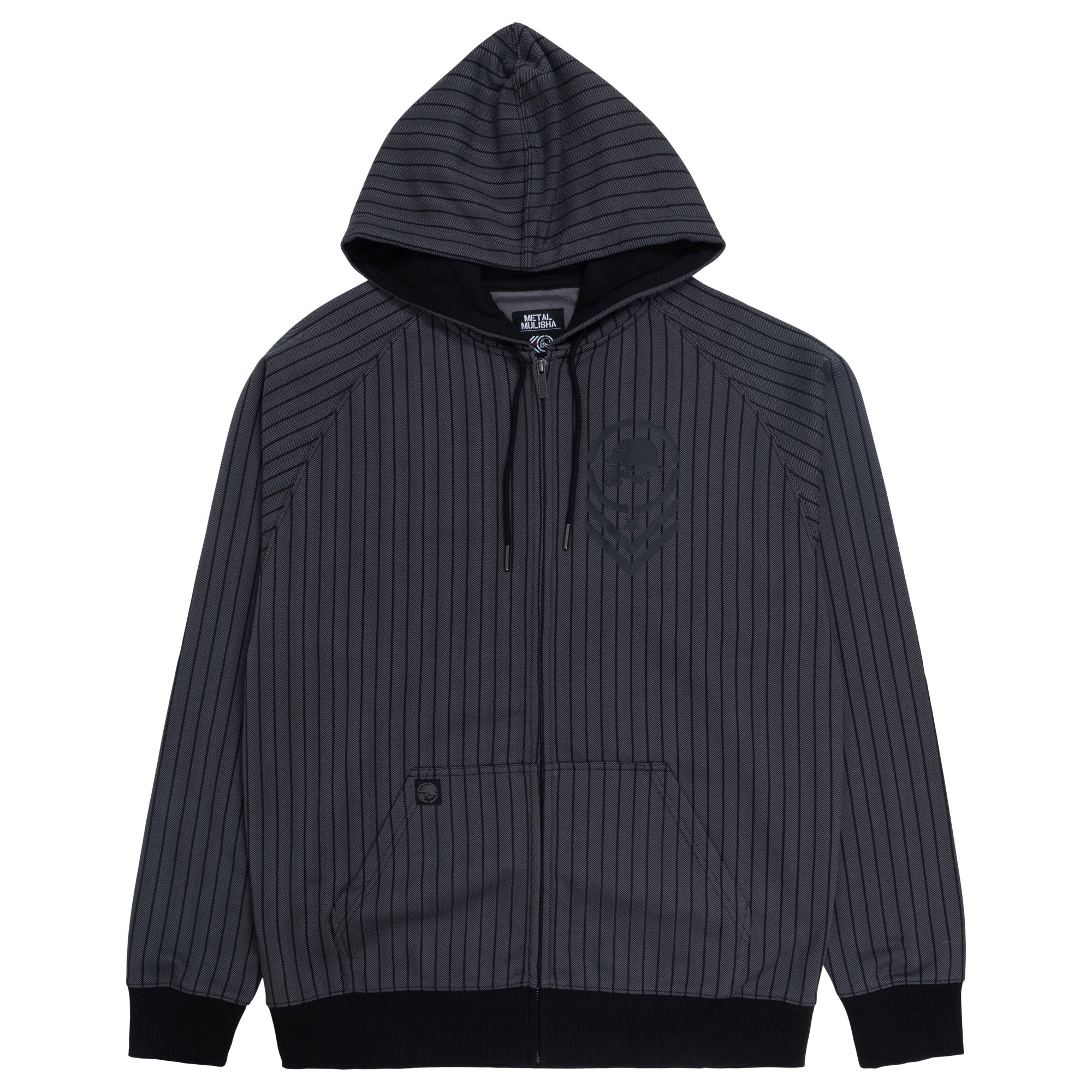 The Revolver Heavyweight Zip Hoodie in Grey with Black Pinstripes and Chevron pattern. This Hoodie features a small Chevron logo screen print on the front of the hoodie, a custom woven label on front right pocket and a custom Metal Mulisha zipper pull and metal tip drawstrings. The heaviest weight fleece we offer, it's built like a tank yet soft and comfortableand has a generous relaxed fit that is true to size.