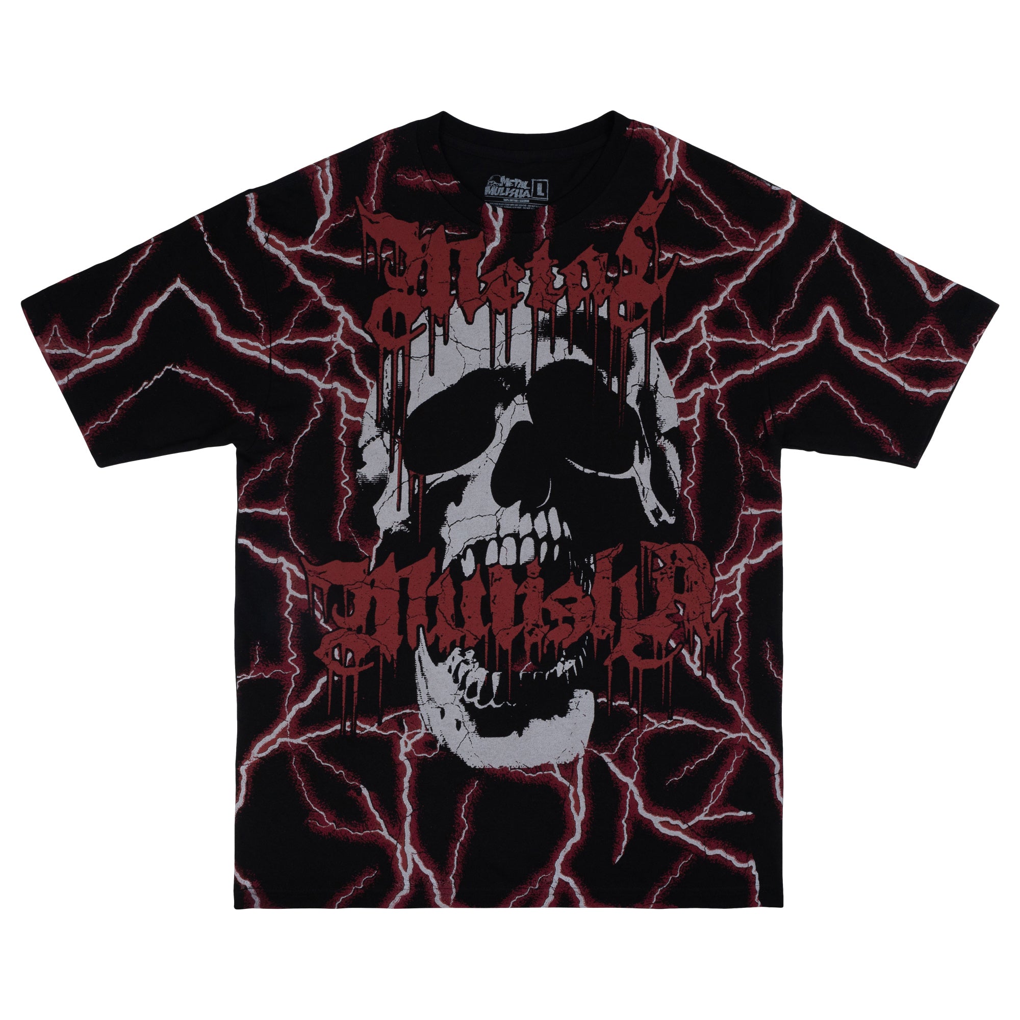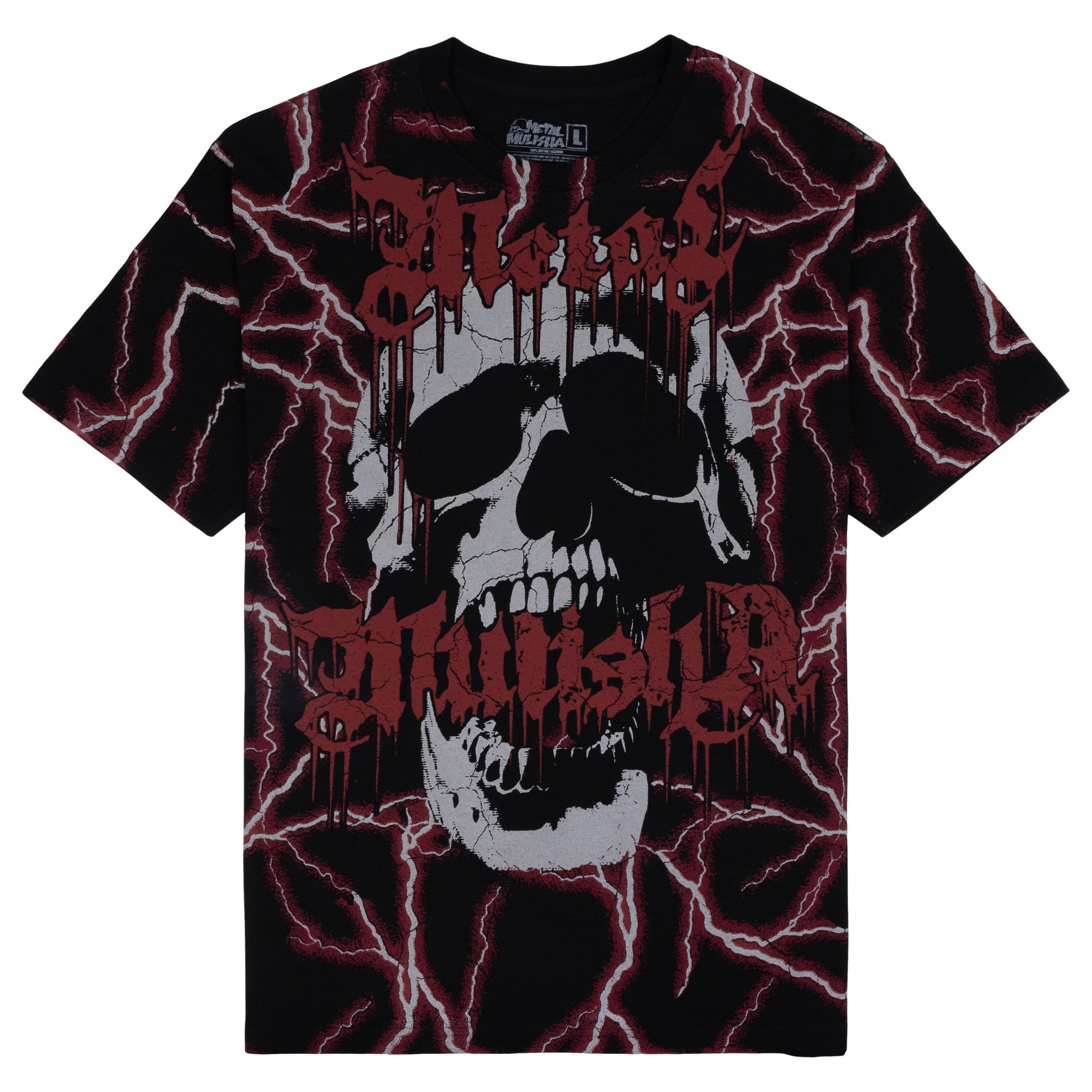 Metal Mulisha Shock Tee in Black and Red features a large all over lightning print on the front of the tee with a large skull with Metal Mulisha logo.