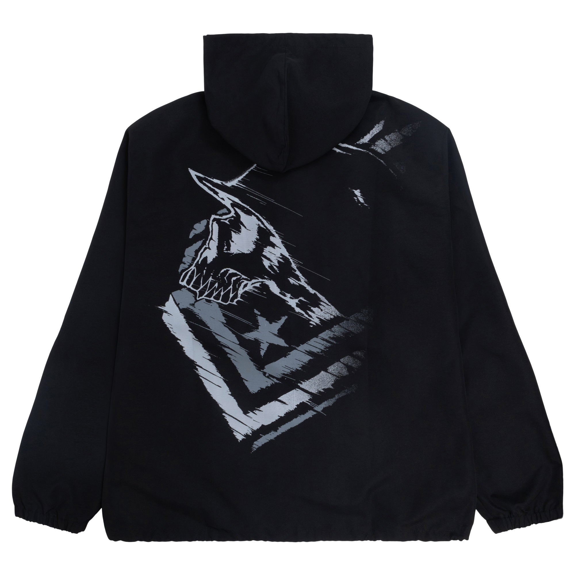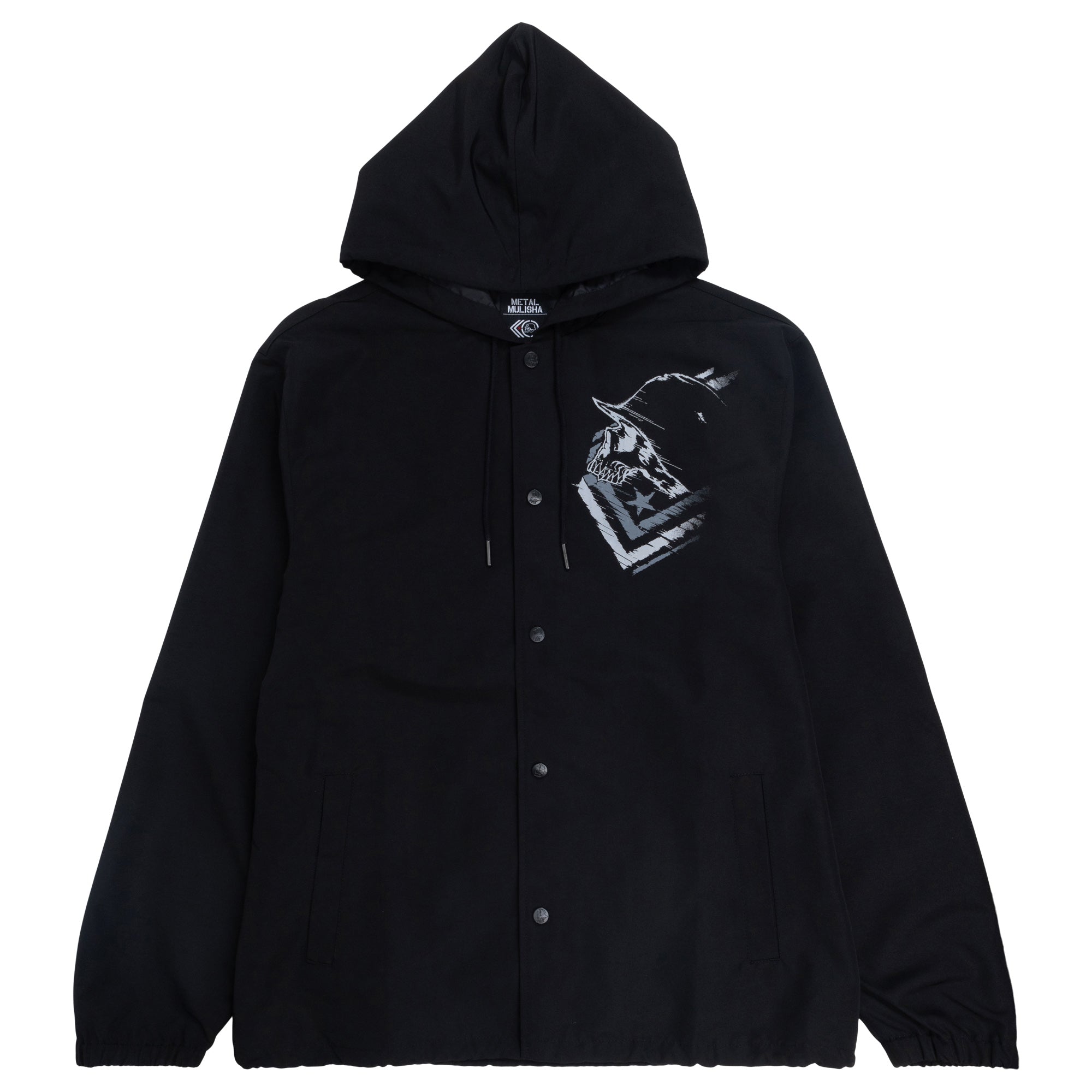 The Winded Coaches Jacket in Black with Black and Grey screen prints on the back and front left of the jacket. 100% poly hooded coaches jacket, water resistant processed shell with poly taffeta lining, built-in hood with adjustable drawcord, custom screen printed Metal Mulisha designs at chest and back, matte black metal snap closure, two slash hand pockets, elastic cuffs and adjustable drawcord hem.