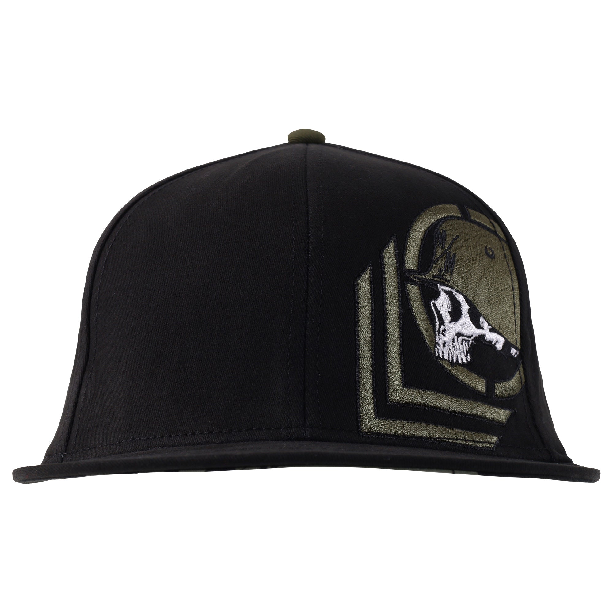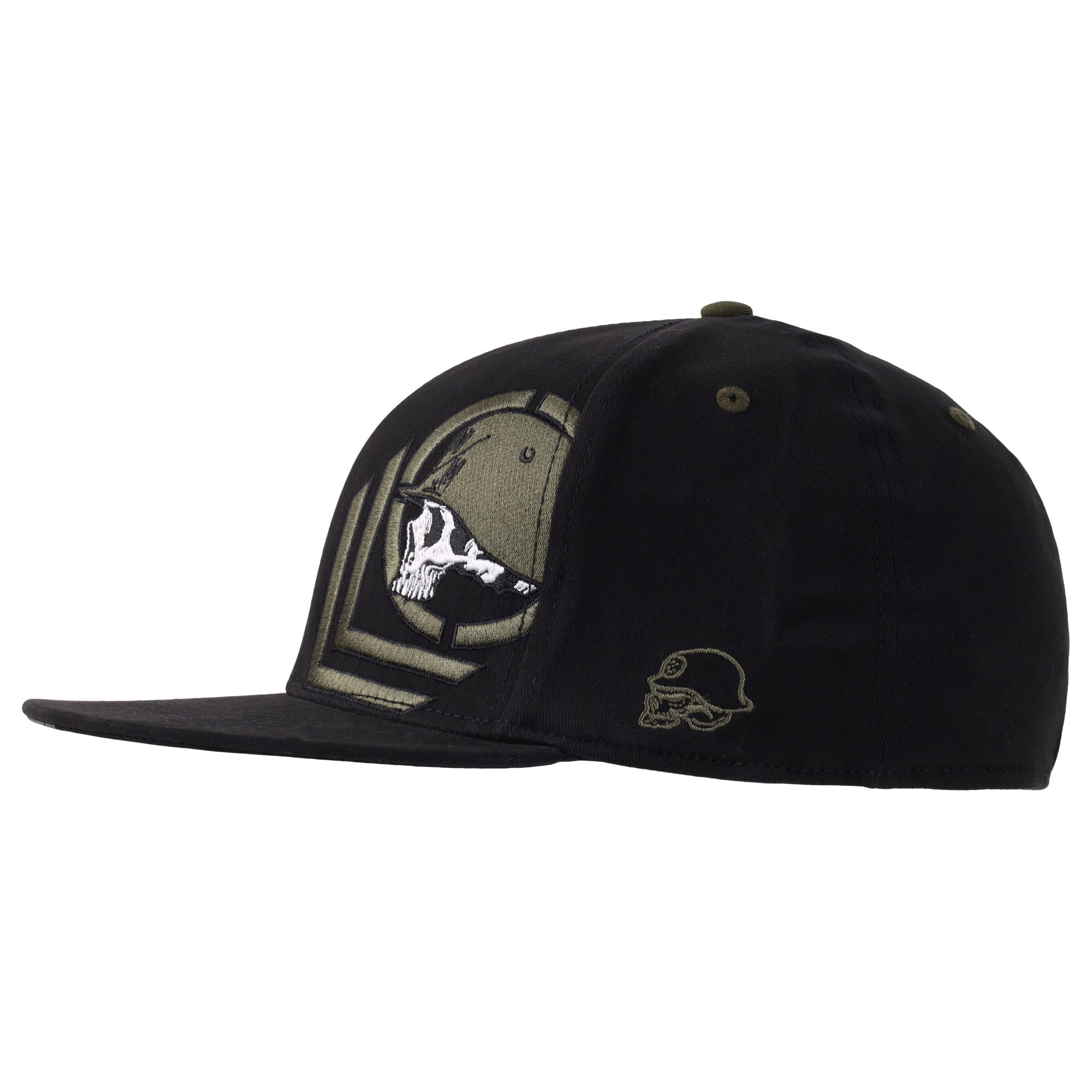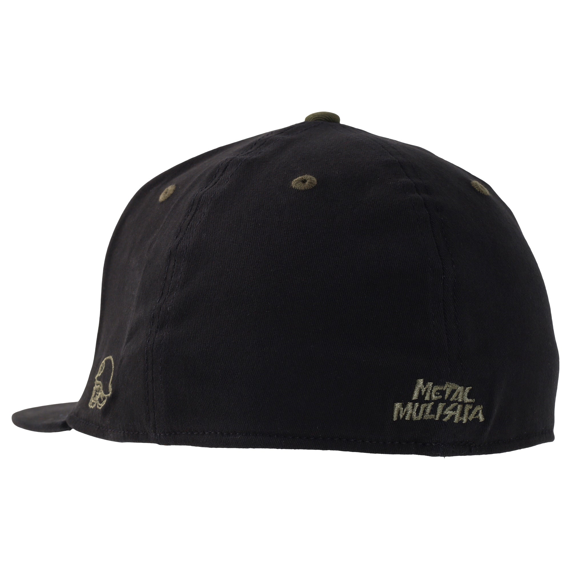 The Metal Mulisha Sketched Flex Hat in Black features a large Metal Mulisha Chevron logo embroidery in Military Green, small Metal Mulisha logo embroidery on back center and helmet logo on left side, large M/M under bill print, and custom printed internal seam taping. Flat bill with ability to curve. 98% Cotton, 2% Spandex