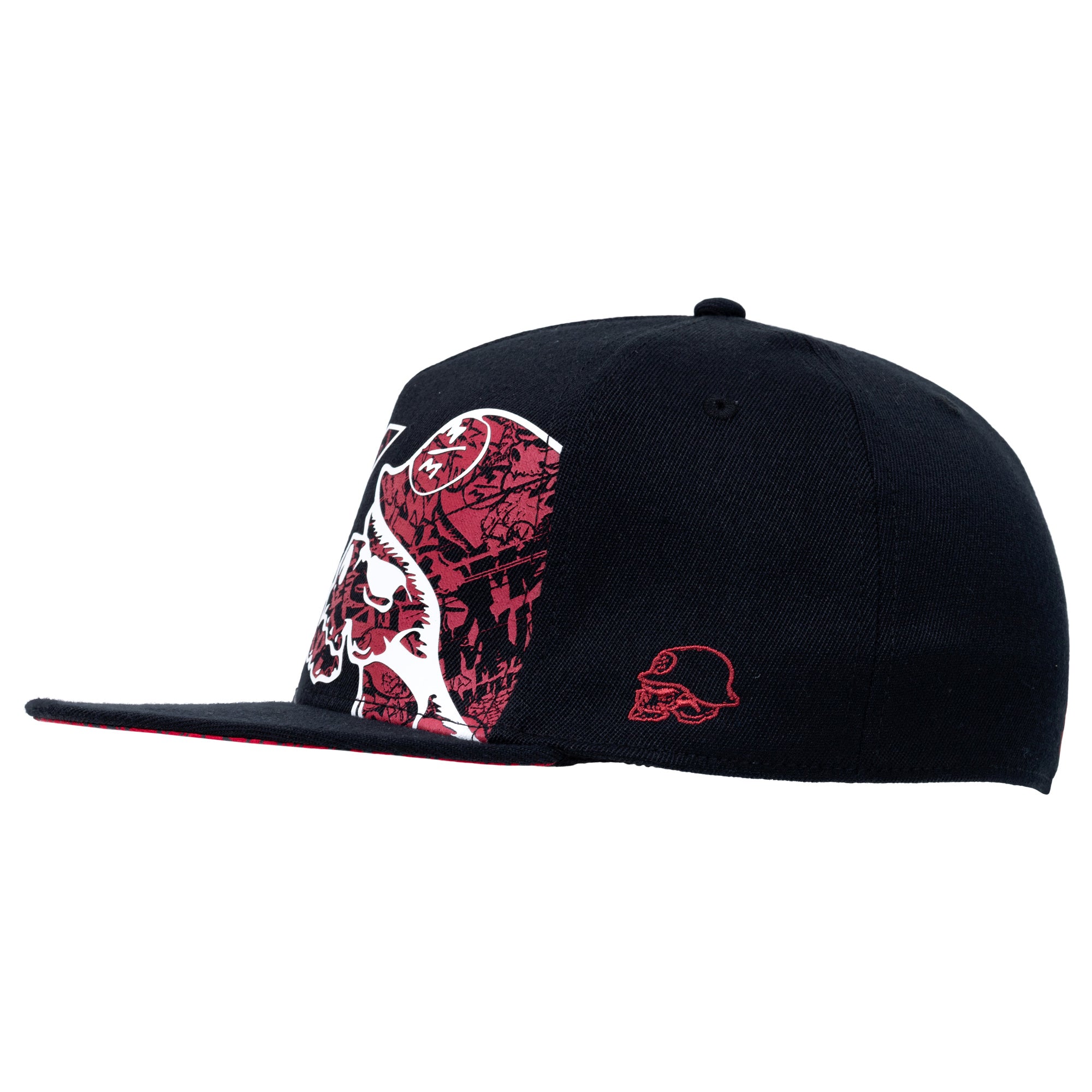 The Higher Ground Flex Hat in Black features a large M/M Skull Chevron on the left front panel with white high density outline print and red fill screenprint art, custom printed underbill and interior seam tape, custom sweatband, and Metal Mulisha logo on back center.
