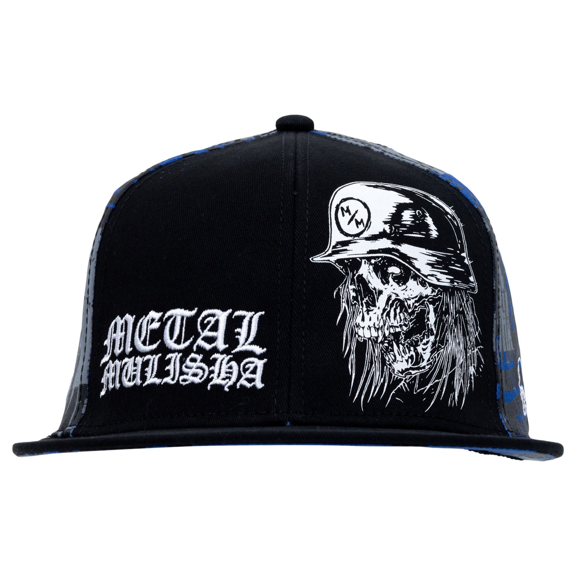 The Metal Mulisha Mayhem Flex Hat in Blue features a custom skull art screenprint on the wearer's front left panel and an old english style Metal Mulisha embroidery on the front right panel, small Metal Mulisha logo embroidery on back center and small helmet embroidery on left side, blue back panels covered in black and grey all over screen print, large M/M underbill print, and custom printed internal seam taping. Flat bill with ability to curve.