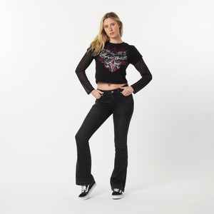 The Patina Cropped Long Sleeve Two-Fer in Black delivers layered style with zero effort. Featuring a cropped short-sleeve baby tee over sheer long sleeves, it’s finished with a Metal Mulisha chest art with pink highlights. It's a perfect dark & edgy look that stands out yet easy to wear.
