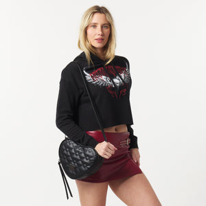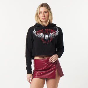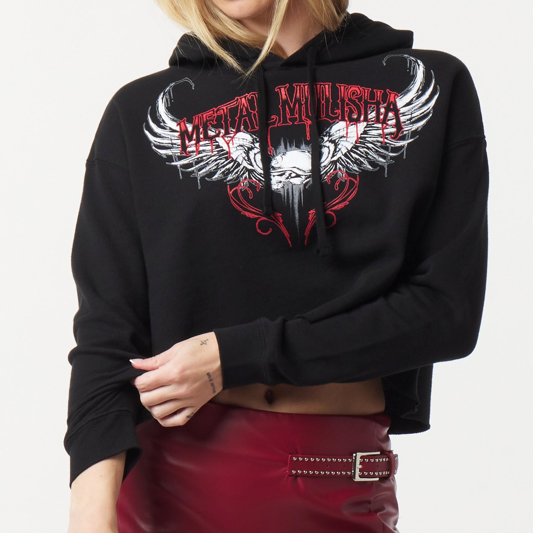 Metal Mulisha Maidens Bad To The Bone cropped hoodie in Black features a bold winged skull graphic with distressed detailing and deep red accents for a raw, vintage moto feel. The Metal Mulisha logo stretches across the chest, giving the design a classic edge with a rebellious twist. Finished in a modern cropped fit, this hoodie pairs perfectly with high-rise denim for an effortless, street-ready look or a cute leather skirt to dress it up.