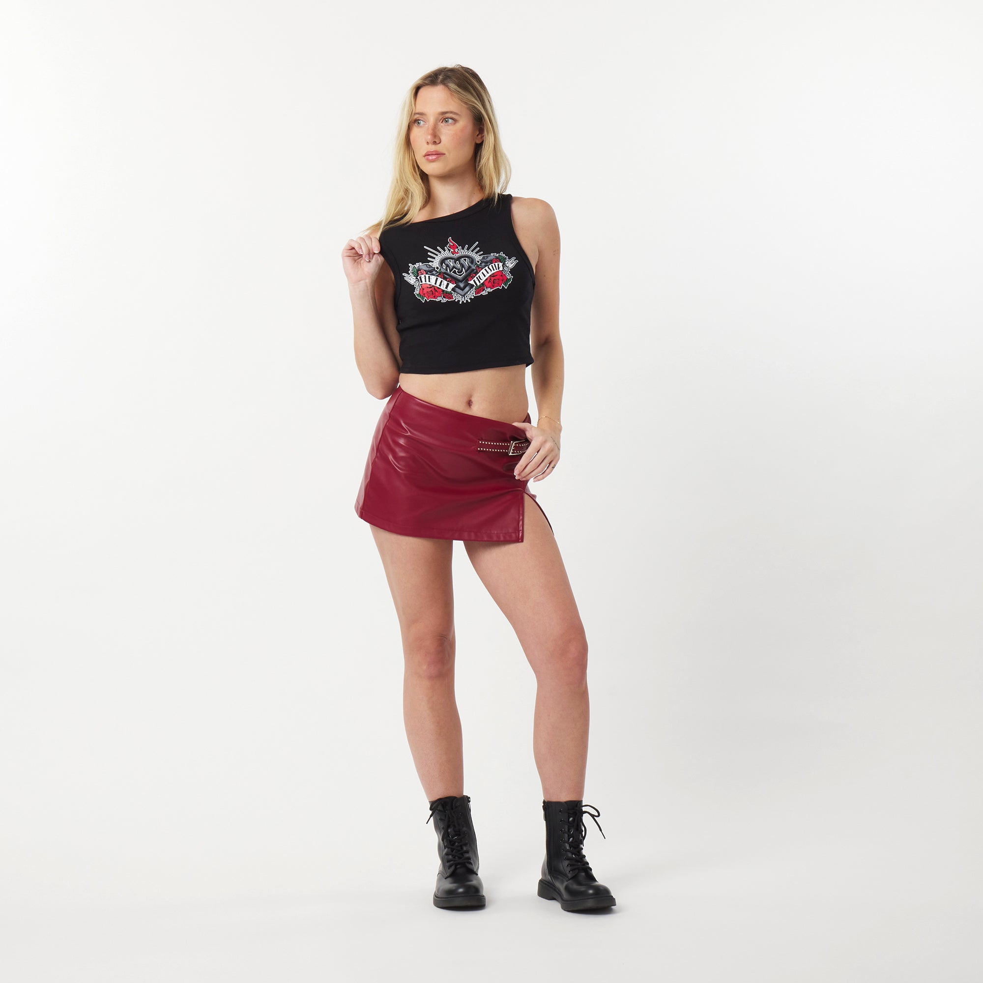 This Metal Mulisha Internal Cropped Tank in Black features a bold Metal Mulisha heart graphic across the chest, layered with lots of detailing, crossed elements, and red rose accents for a tough-meets-feminine look. The high-contrast print pops against the black base, giving it a classic moto edge with a modern twist. Finished in a flattering cropped cut, this tank is perfect for pairing with high-waisted denim or skirts for an effortlessly badass vibe.