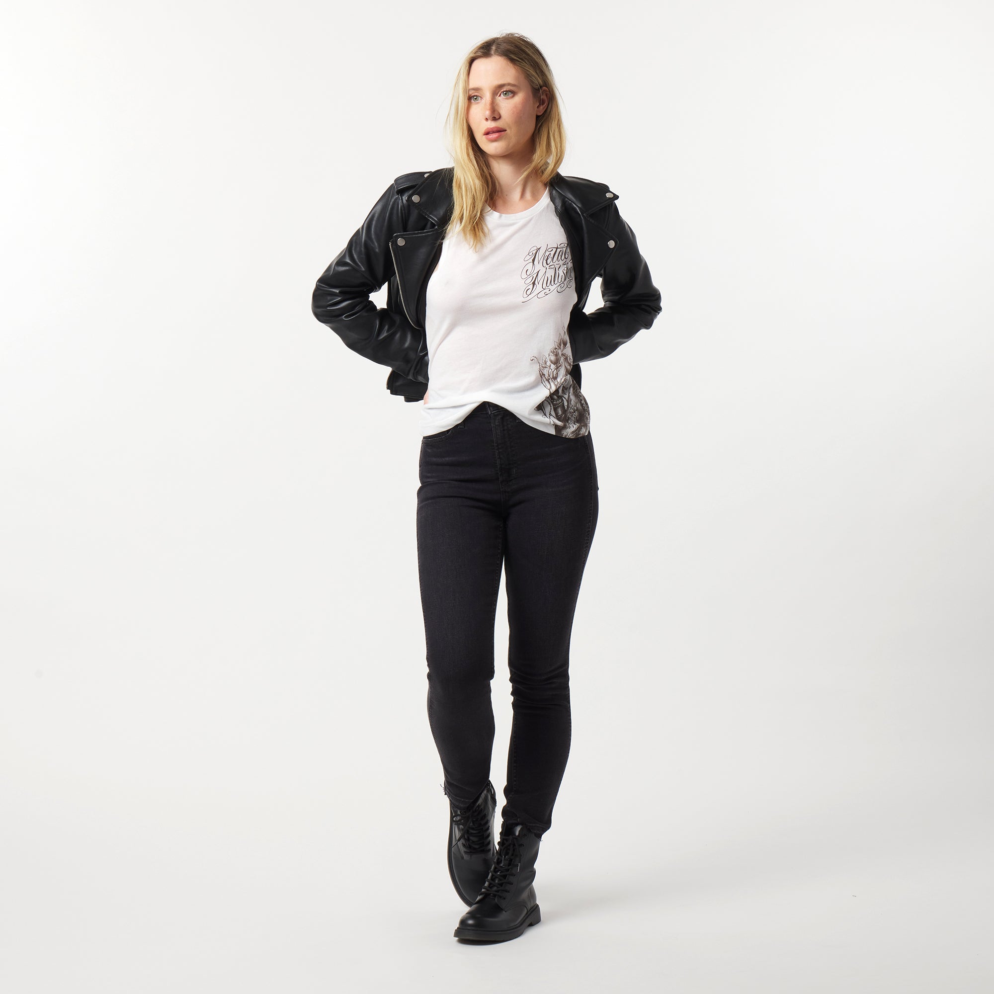 Metal Mulisha Maidens Kiss Of Death Muscle Tank in White brings classic Metal Mulisha edge. A script Metal Mulisha logo hits the chest, while a bold side graphic features a detailed illustrated figure woven with roses for a striking, tattoo-inspired look. Cut with a relaxed muscle fit and wide armholes, it’s lightweight, flattering, and made to move—from laid-back days to nights out.