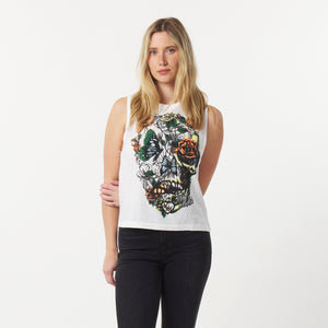 The Metal Mulisha Maidens Undercover Muscle Tank in White features a statement front graphic that mixes a skull with layered florals and butterflies for a fierce yet feminine vibe. The detailed artwork pops against the clean base, while the muscle-tank silhouette gives it a laid-back, edgy feel.