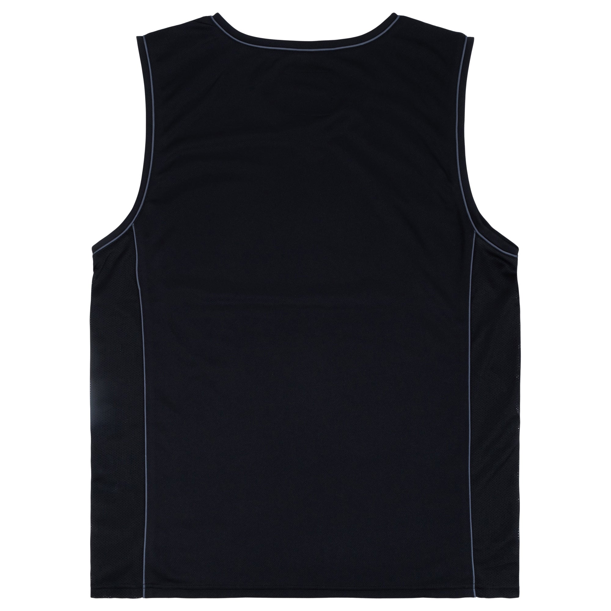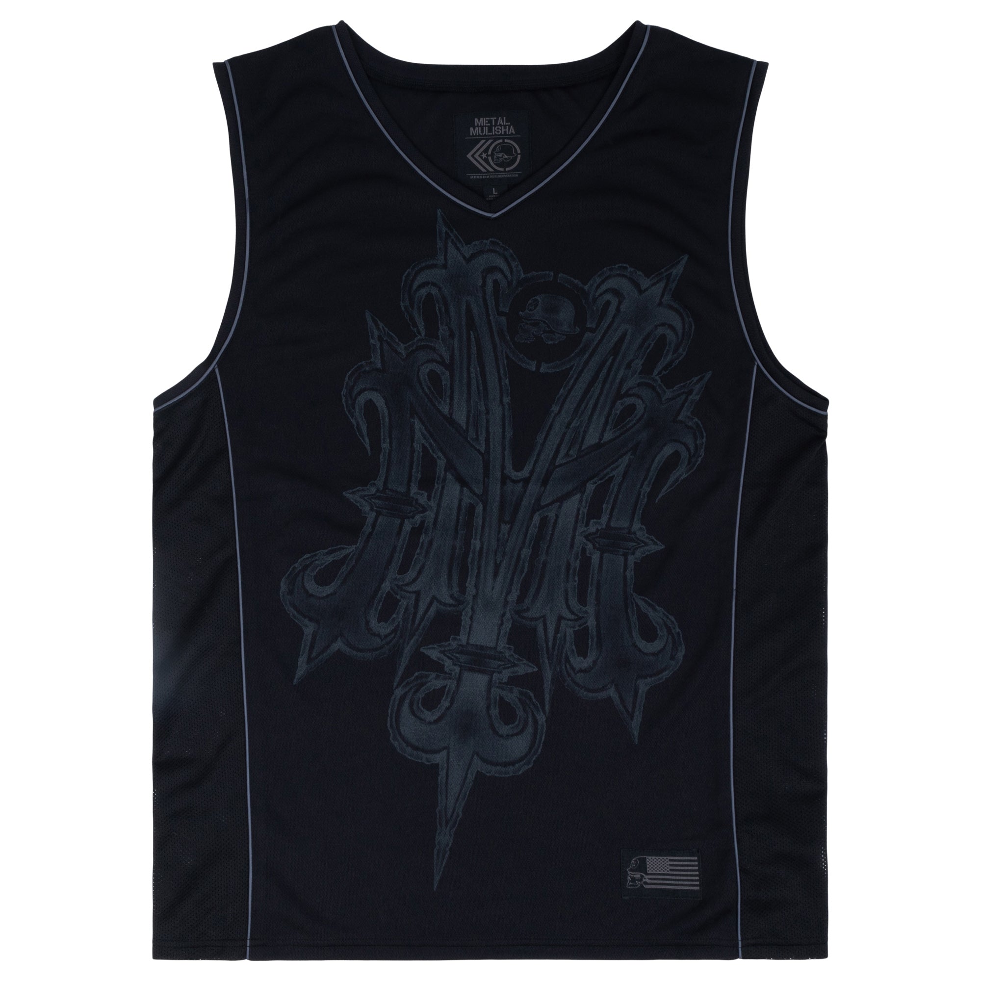 Metal Mulisha Recollect Jersey Tank in Black features a V-neck with contrast grey piping along neck seams and arm seams and side seams, a large chest hit, and a Metal Mulisha flag woven label on the bottom left of the jersey.