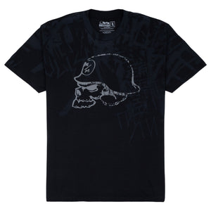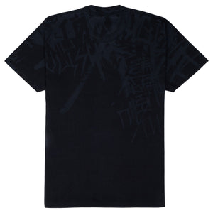 Metal Mulisha Delinquent Tee in Black features a large front custom graffiti style print in dark grey across the front and back body and arms, with a Metal Mulisha OG Helmet logo in light grey on center chest.