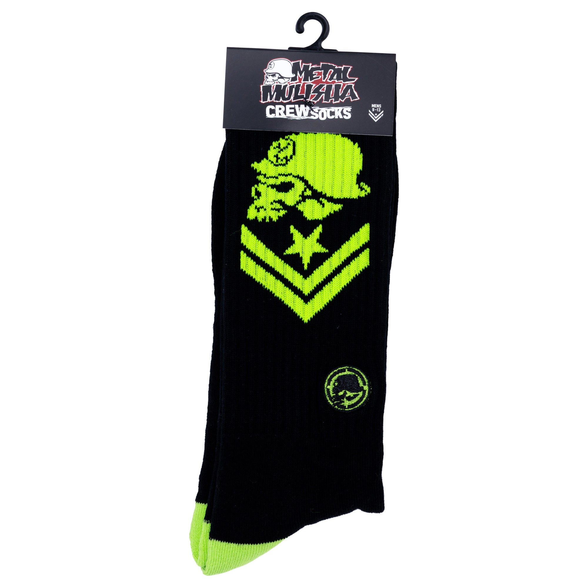 Metal Mulisha Troops Socks in Black/Green feature a chevron logo jacquard knit on both sides. Made with 60% Cotton / 35% Poly / 5% Spandex, these socks are breathable and the material won't make your feet sweat (at least not any more than usual!). They have a padded sole and toe seams that are crafted for comfort and moved up so they won't mess with the tips of your toes. We haven't worn anything else since these arrived and they are as good as anything those fancy sock brands make.