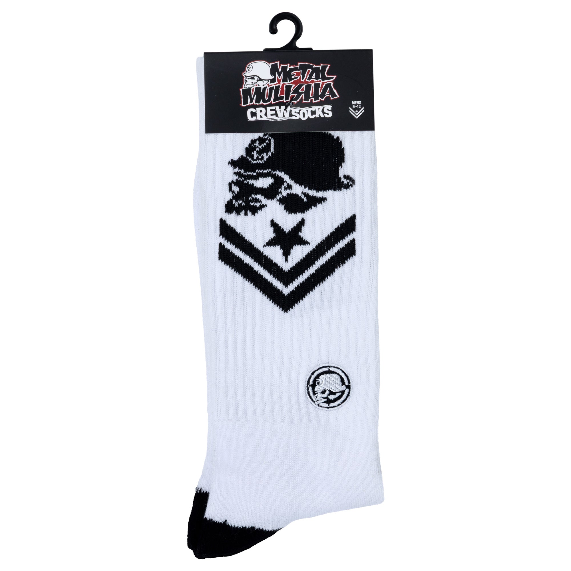Metal Mulisha Troops Socks in White feature a chevron logo jacquard knit on both sides. Made with 60% Cotton / 35% Poly / 5% Spandex, these socks are breathable and the material won't make your feet sweat (at least not any more than usual!). They have a padded sole and toe seams that are crafted for comfort and moved up so they won't mess with the tips of your toes. We haven't worn anything else since these arrived and they are as good as anything those fancy sock brands make.