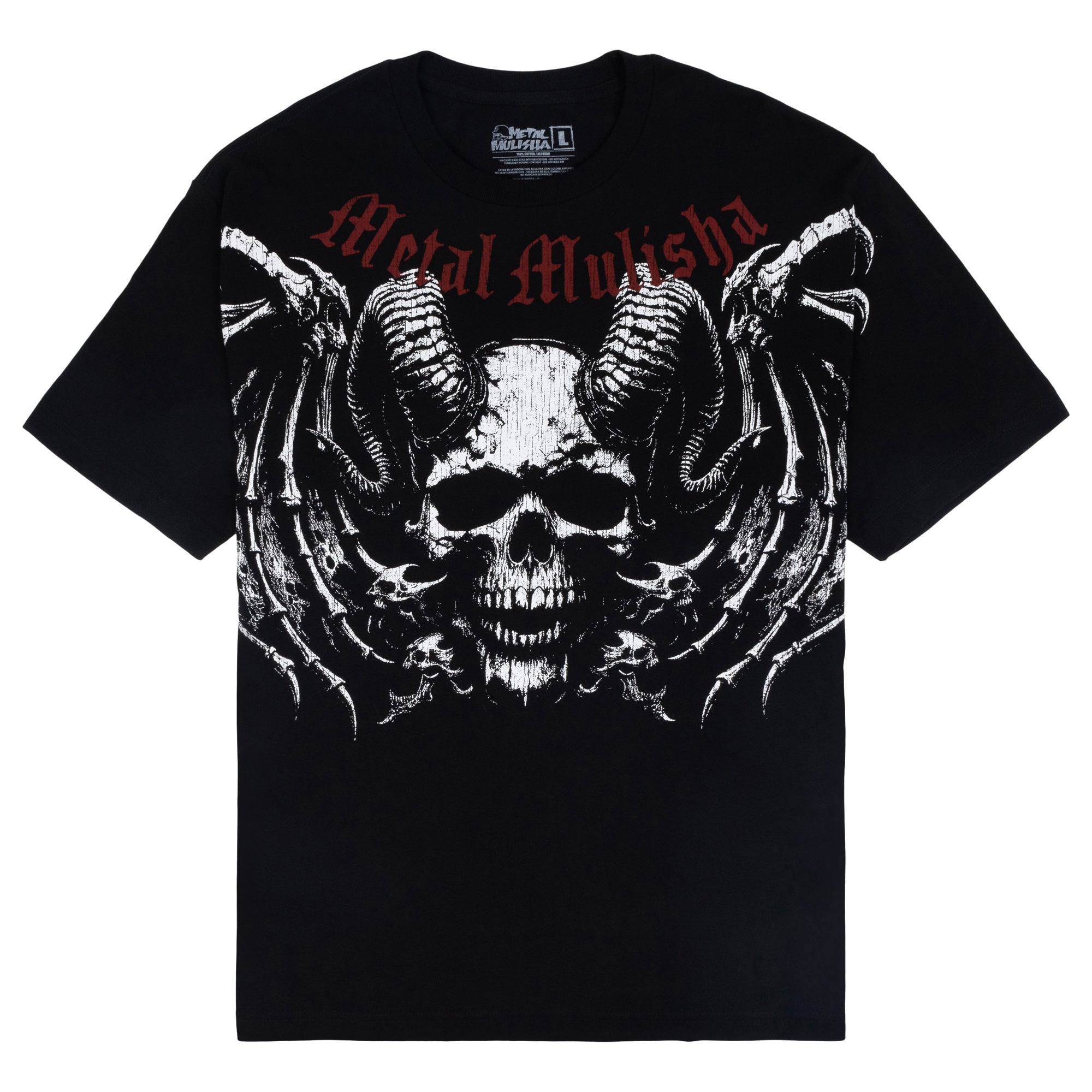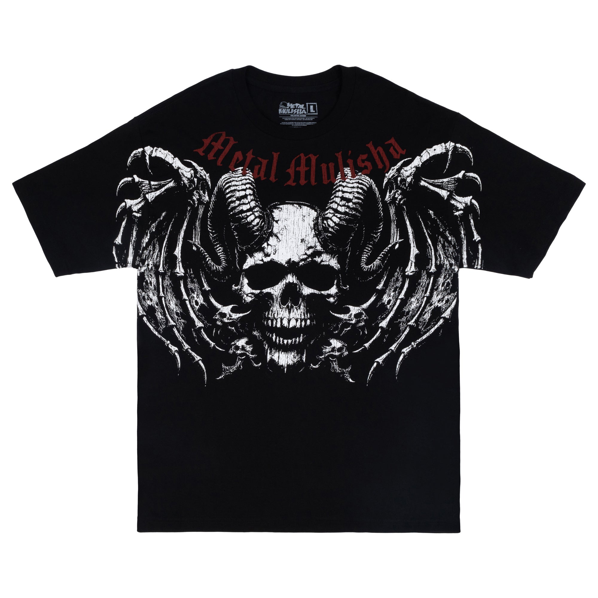 The Metal Mulisha Darkness Tee in Black features a large oversized Metal Mulisha screenprint across the chest from sleeve to sleeve in White and Red.