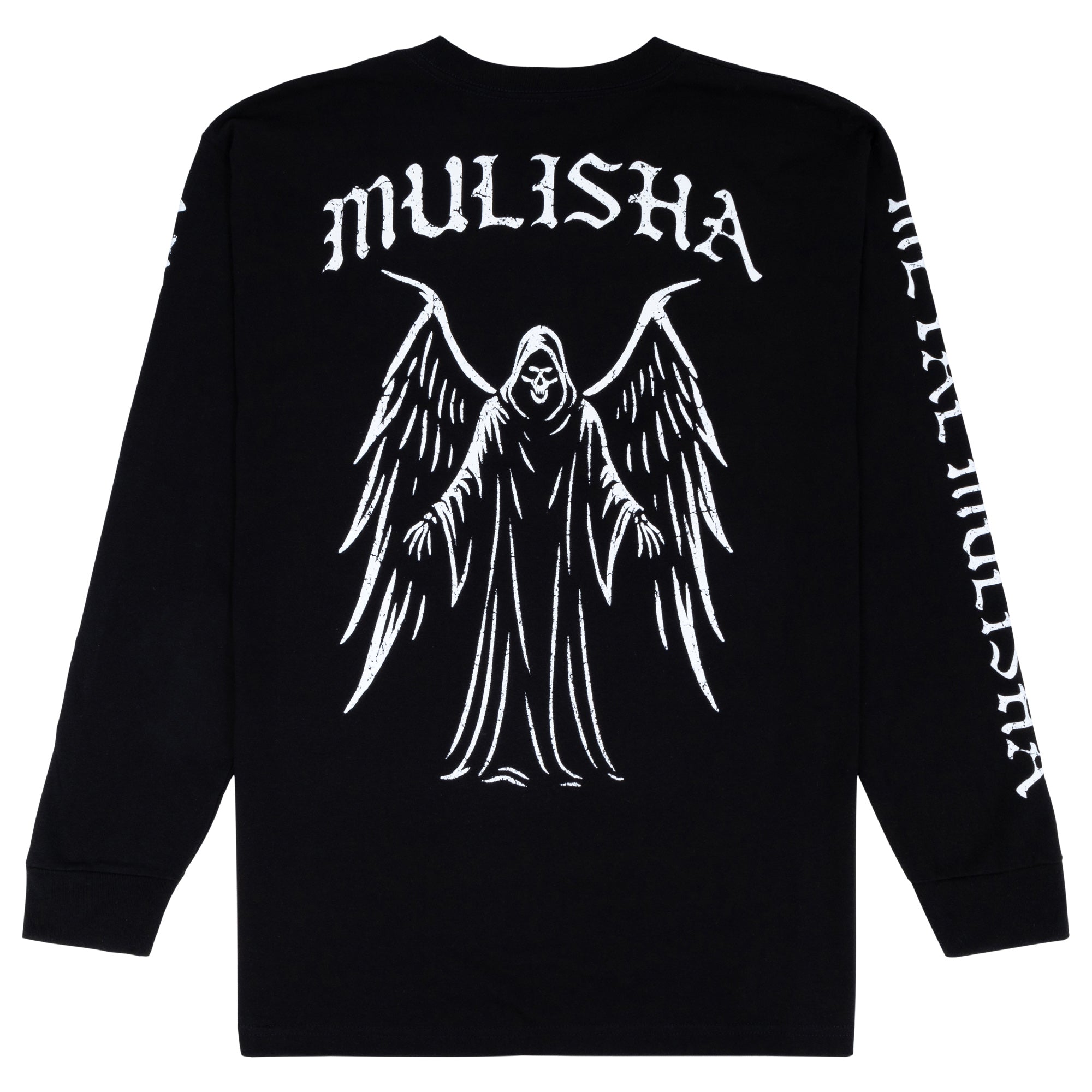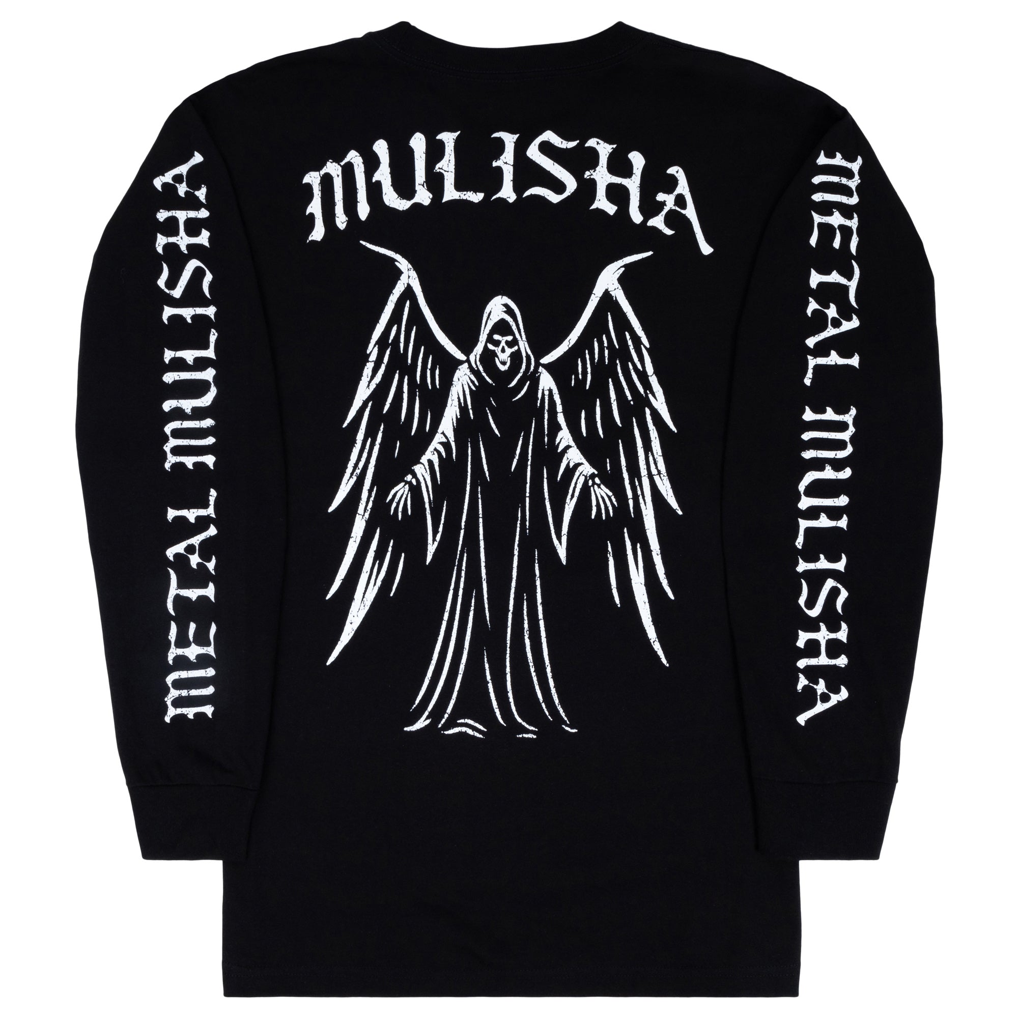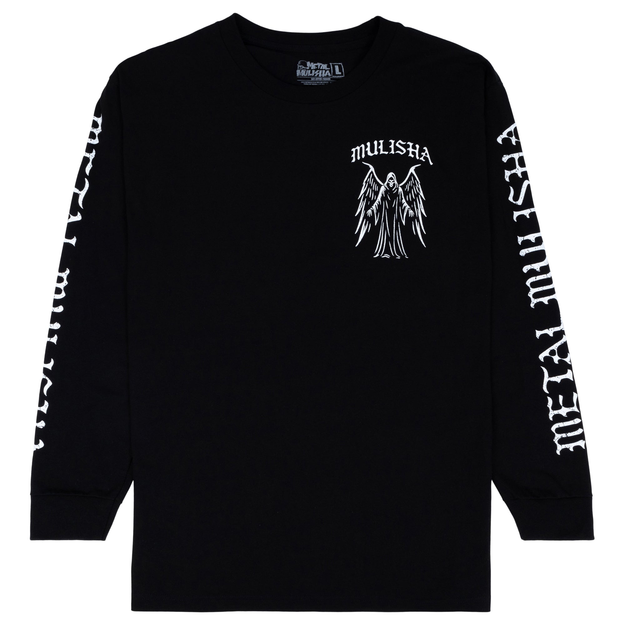 Metal Mulisha AOD Long Sleeve T-Shirt in Black features a small front chest hit and large back hit, with Metal Mulisha print down the side of both sleeves.
