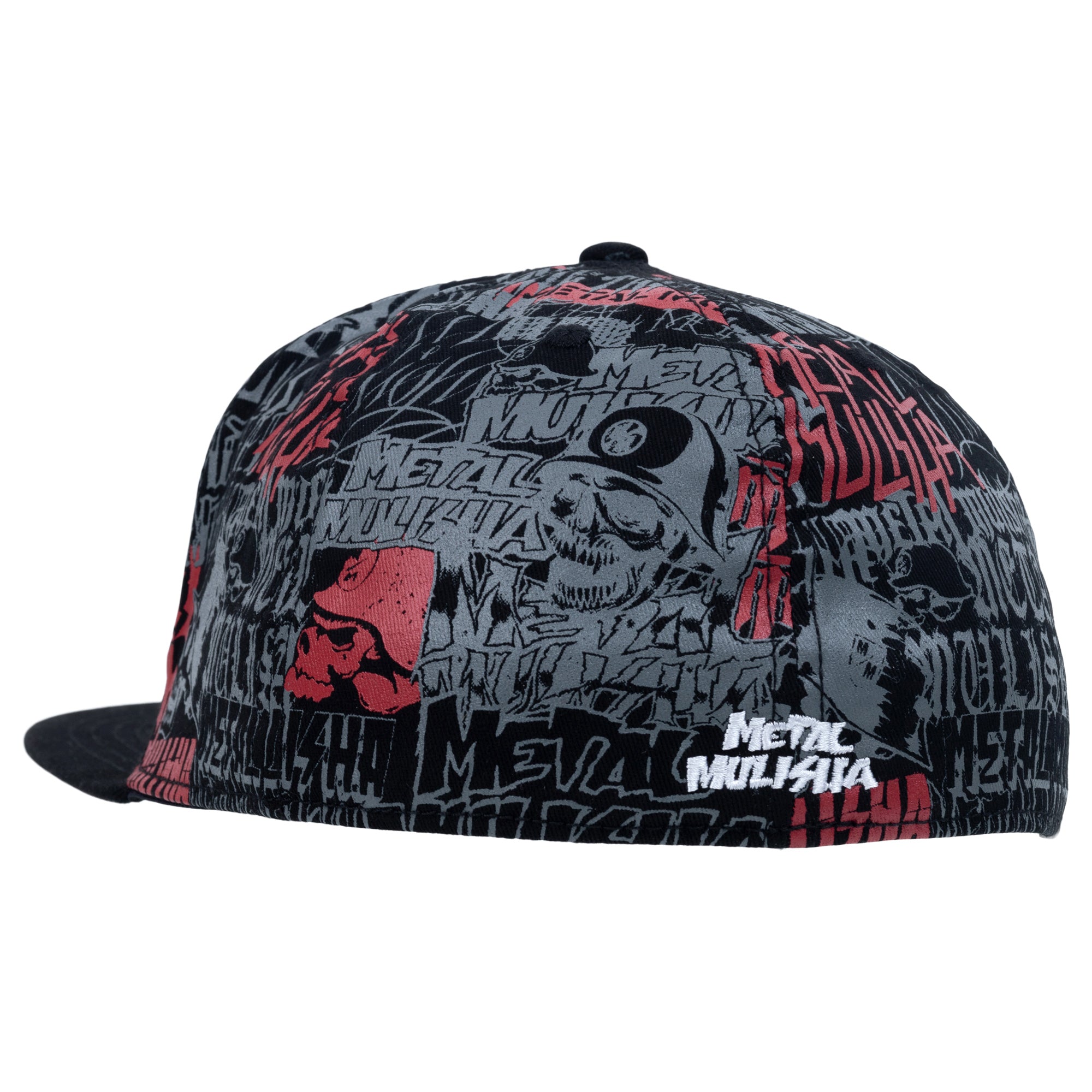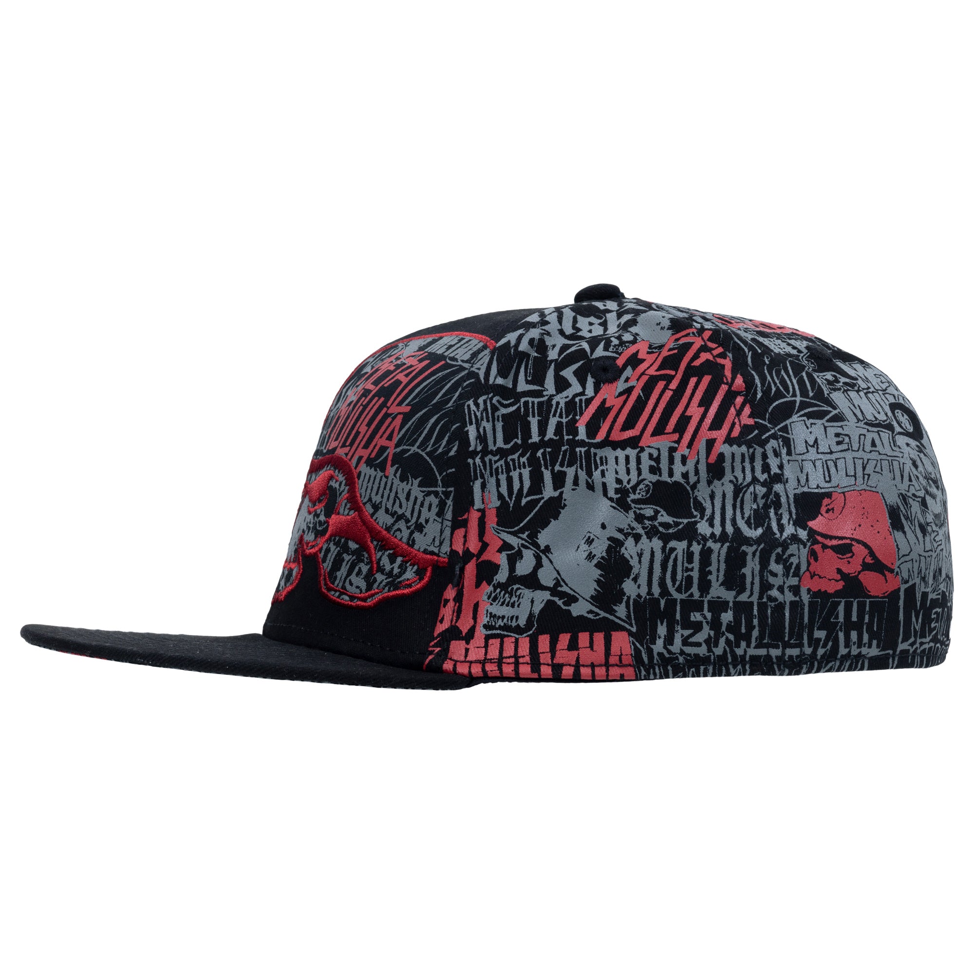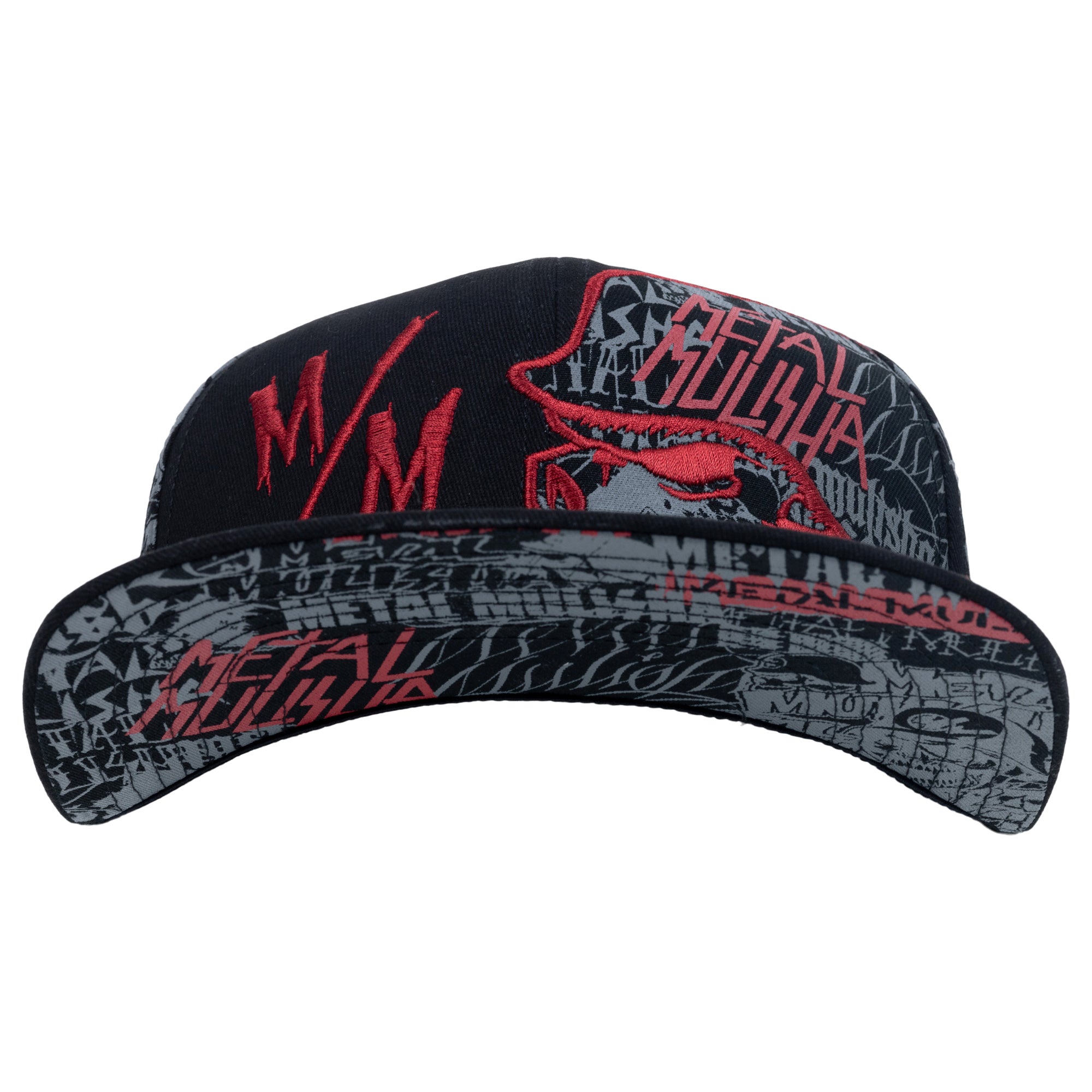 The Metal Mulisha Decade Flex Hat in Black is made with cotton twill fabric and features custom allover print on back 4 panels, large Metal Mulisha Helmet embroidery on wearer's front left panel with allover printed applique fill, red M/M embroidery on wearer's front right panel, matching allover print undervisor, back center Metal Mulisha embroidery, custom printed internal seam taping, and new comfort sweatband. Flat bill with ability to curve.