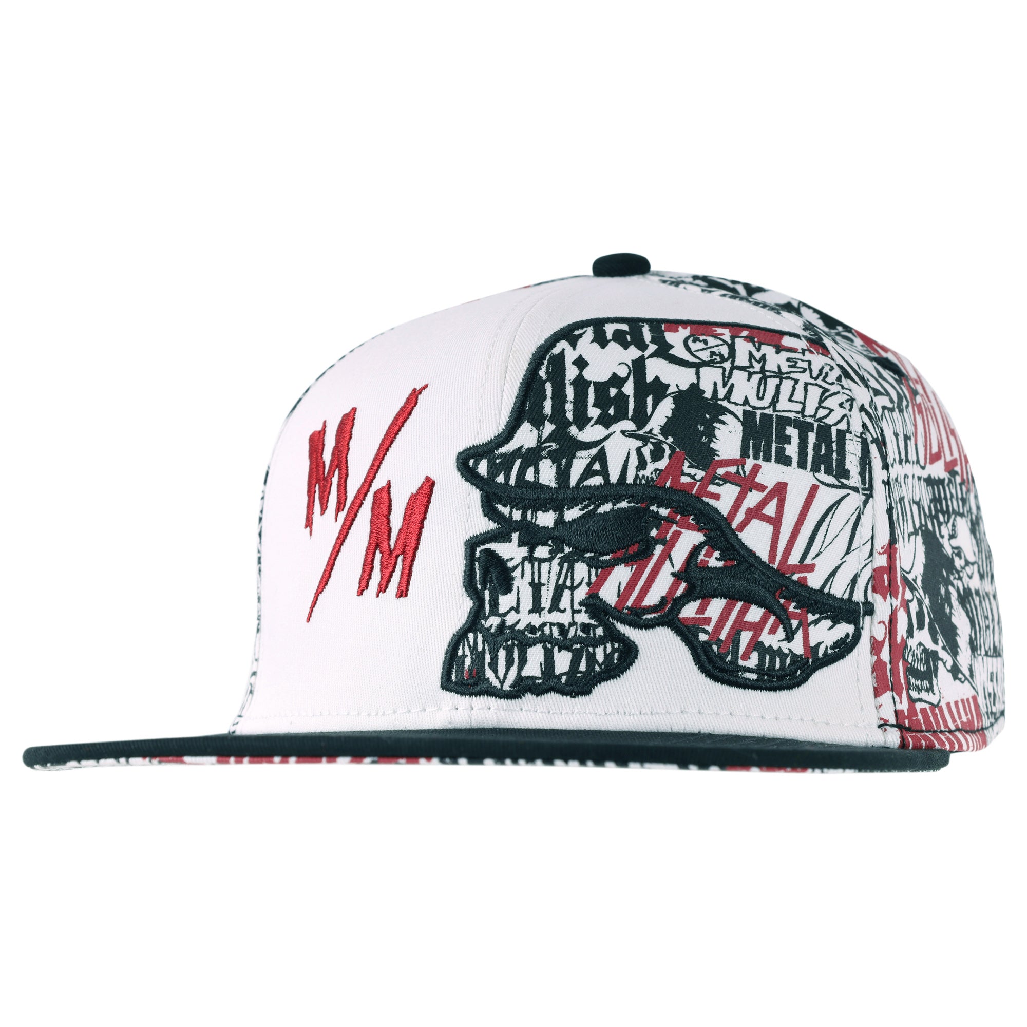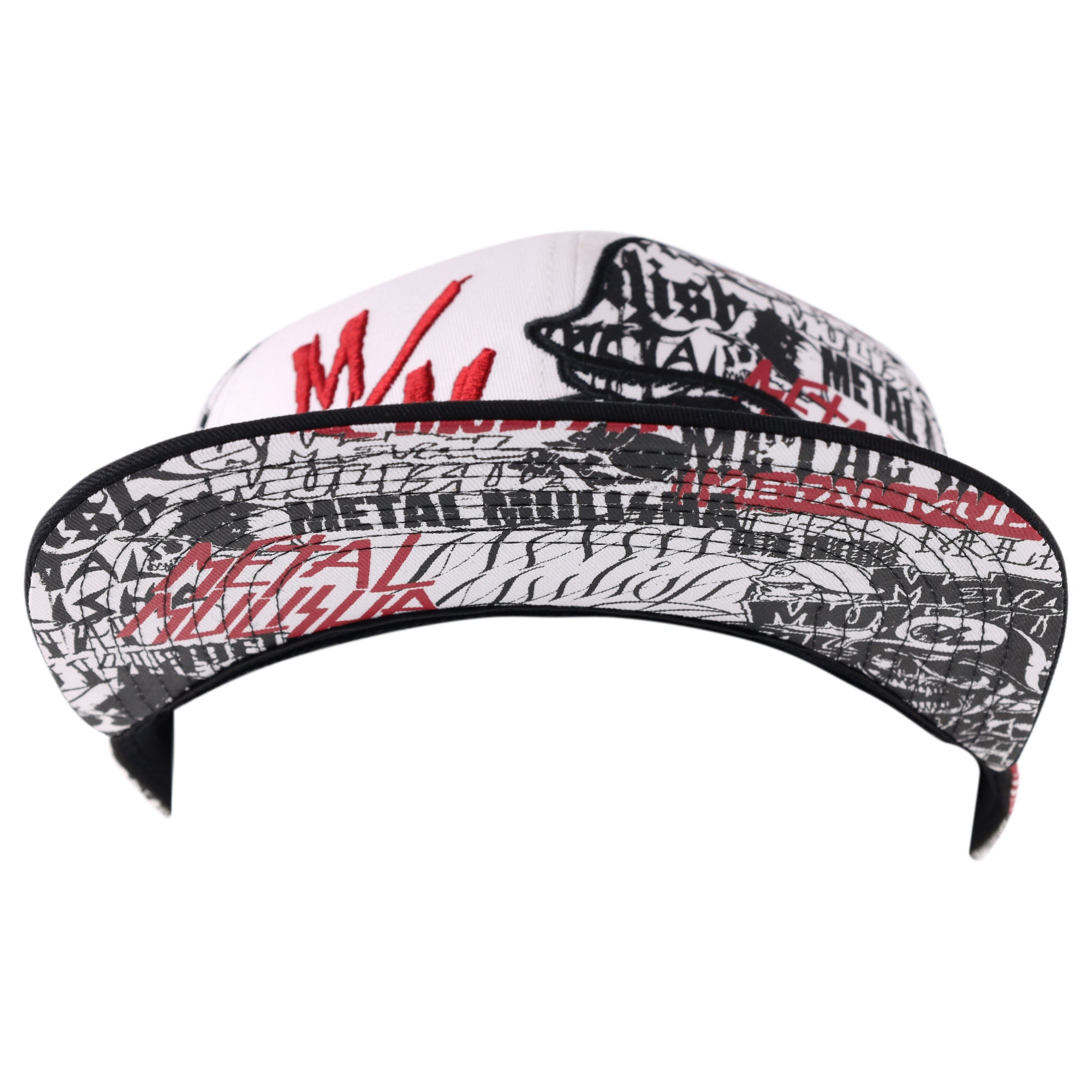 The Metal Mulisha Decade Flex Hat is made with cotton twill fabric and features custom allover print on back 4 panels, large Metal Mulisha Helmet embroidery on wearer's front left panel with allover printed applique fill, red M/M embroidery on wearer's front right panel, matching allover print undervisor, back center Metal Mulisha embroidery, custom printed internal seam taping, and new comfort sweatband. Flat bill with ability to curve.