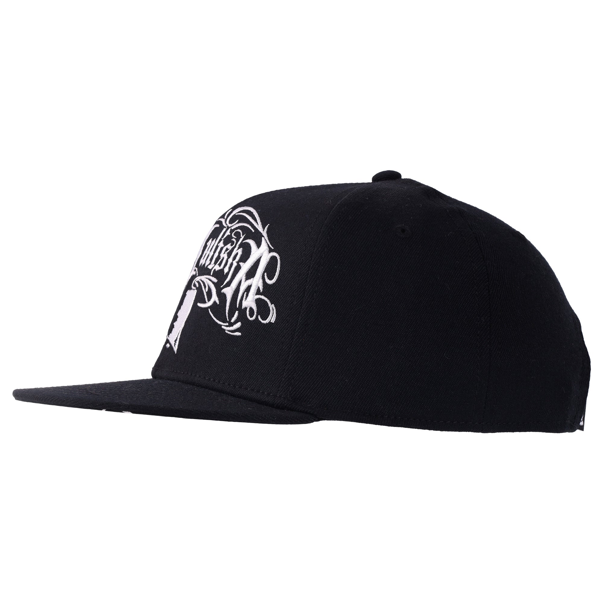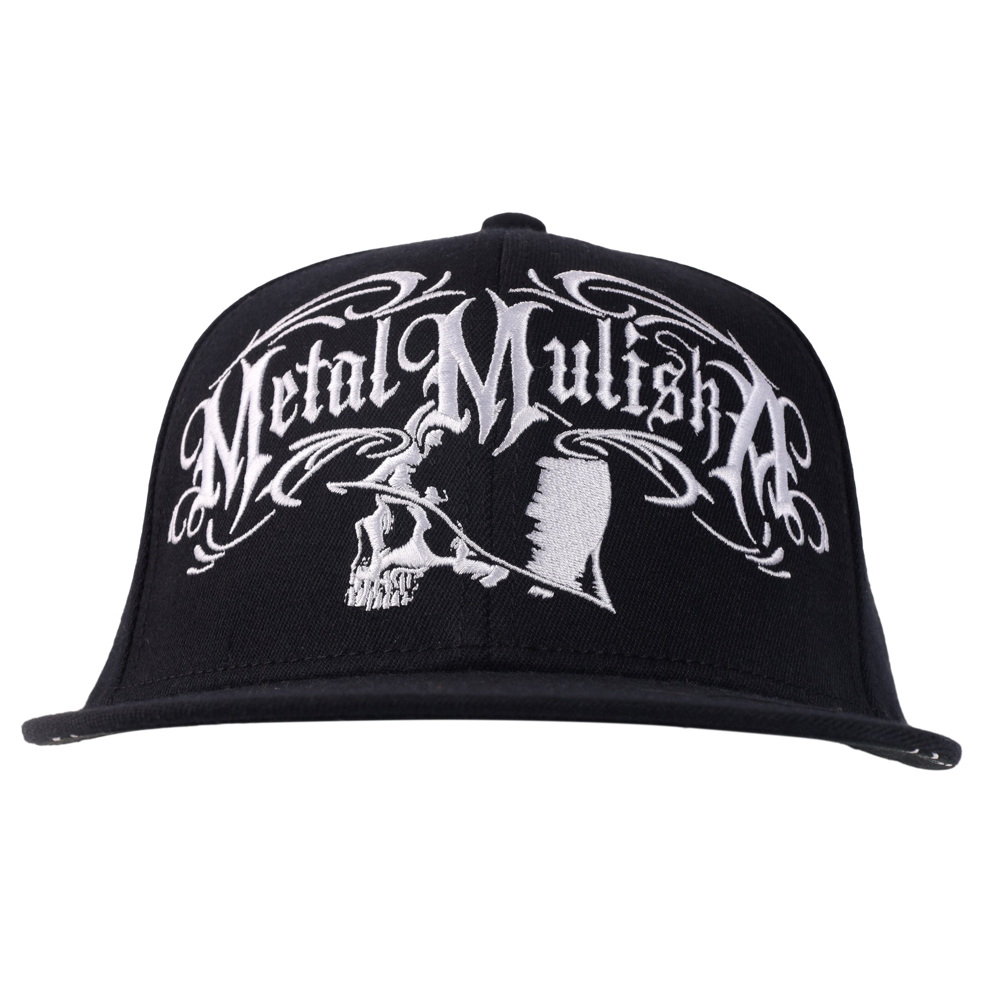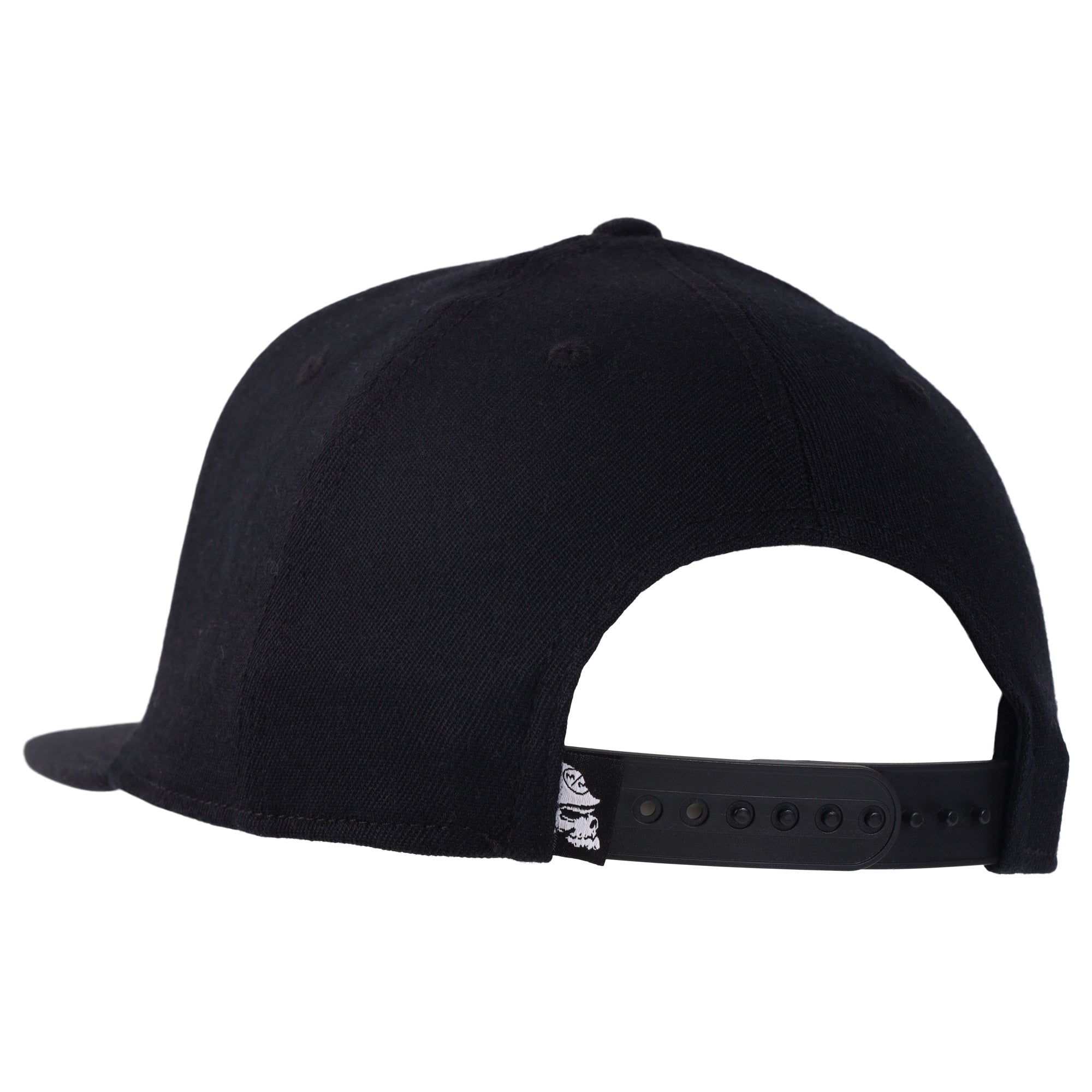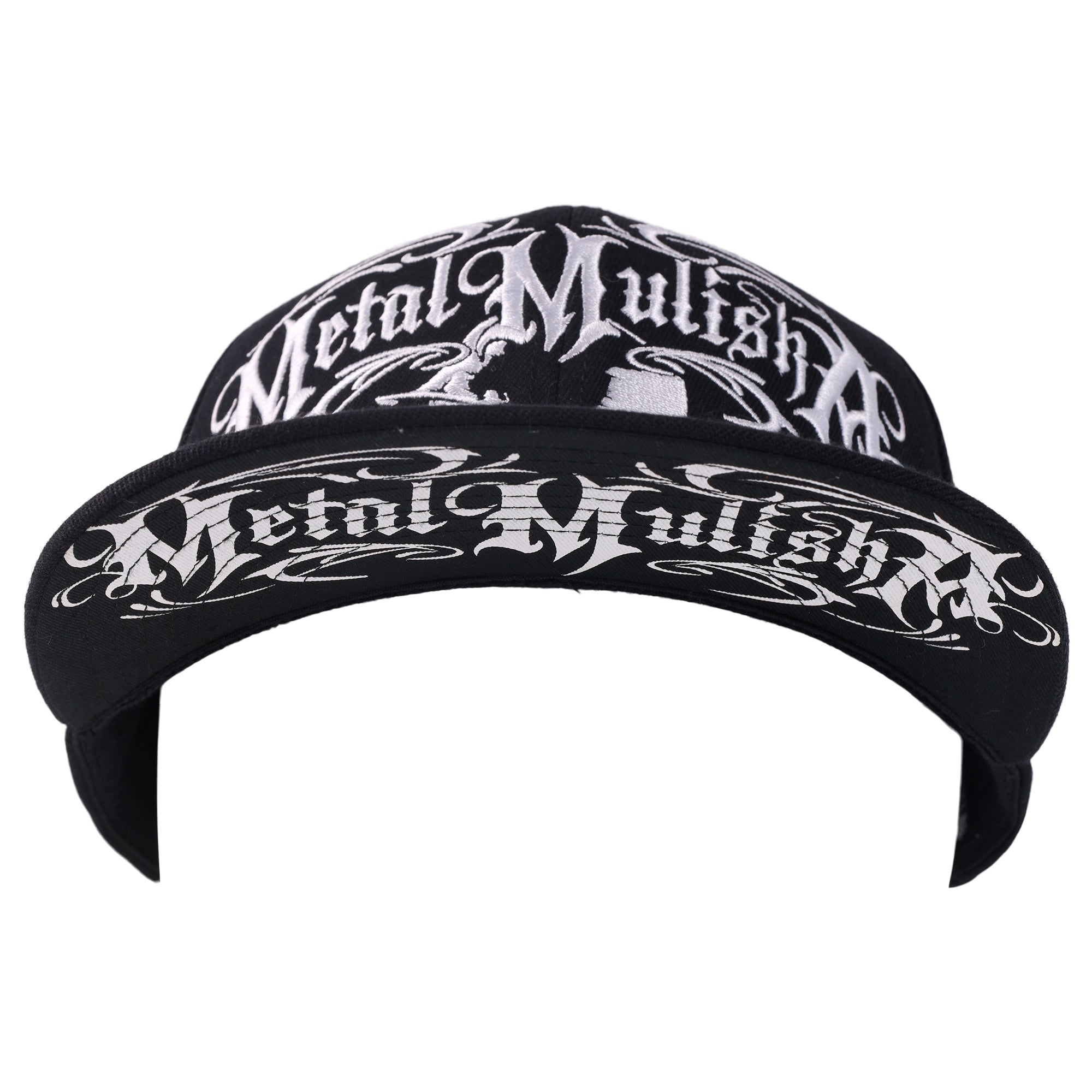 The Intricate Snapback Hat in Black features a large Metal Mulisha logo in White with OG helmet, Metal Mulisha logo underbill in White and back snap seam has a custom woven label. The hat is made of 66% Acrylic, 13% Poly, 12% Wool, 7% Cotton, and 2% Spandex.