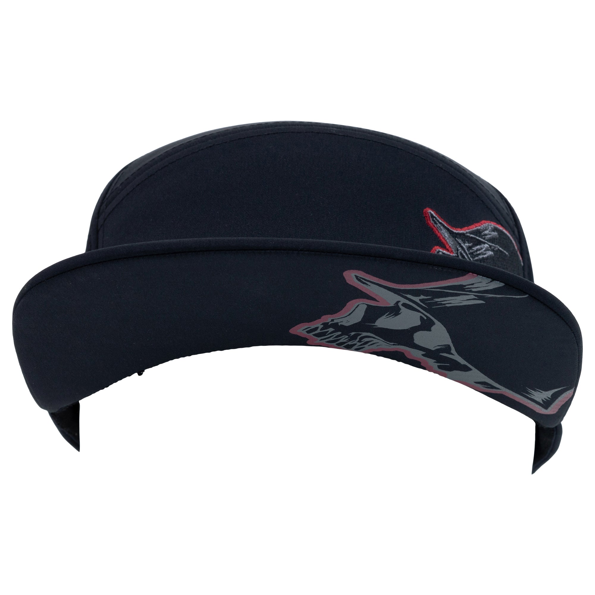 The Masked Snapback Hat in Black the Metal Mulisha skull logo embroidery on the front left panel in Red and Grey, custom printed underbill, breathable stretch mesh back panels with a very comfortable flexsnap band with a custom woven label.