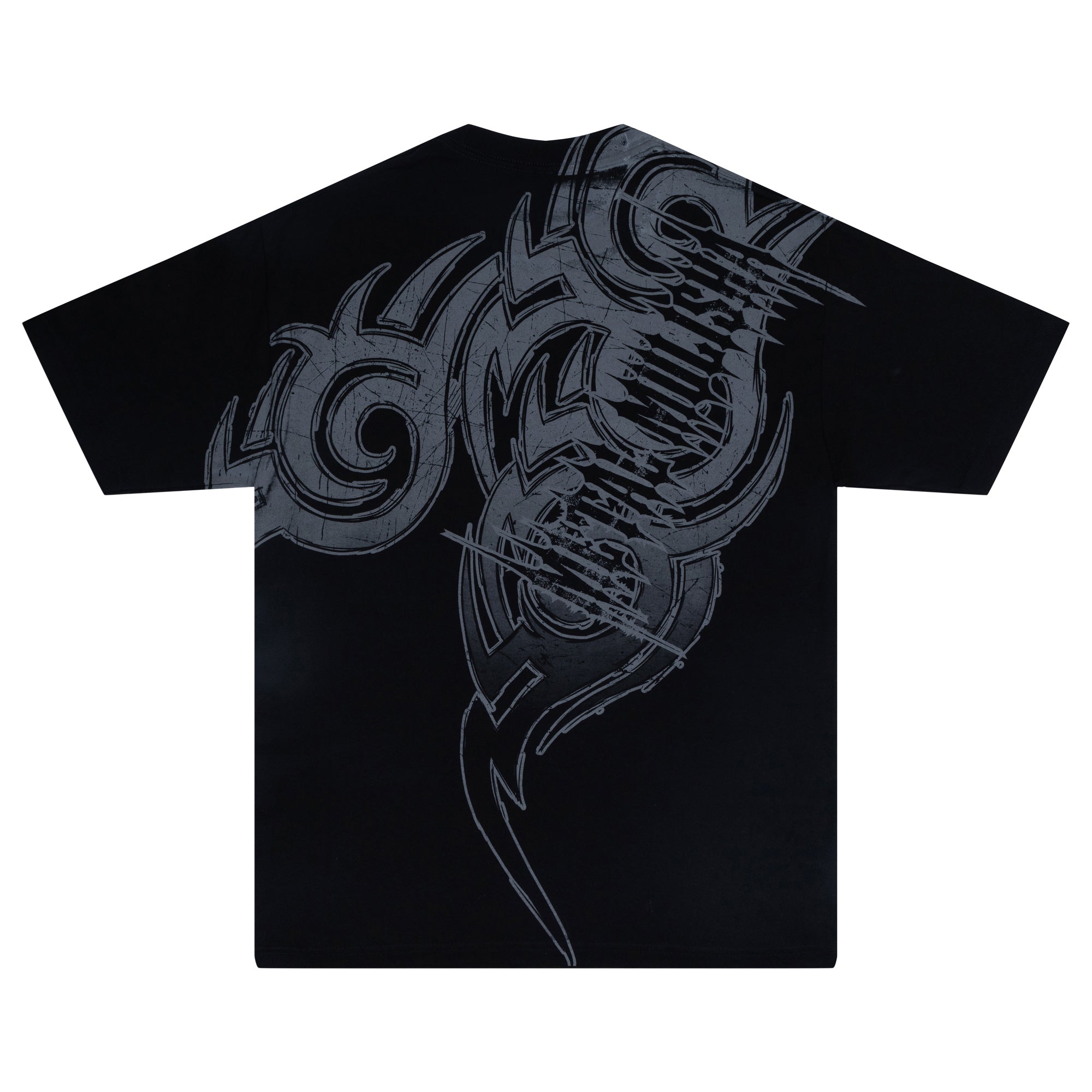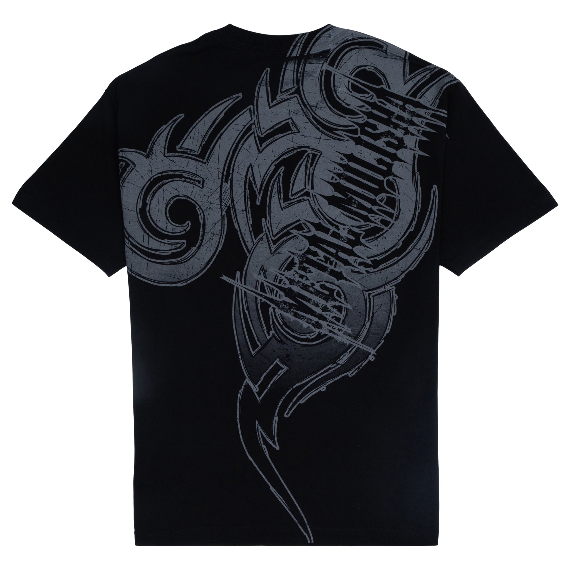 The Metal Tribe Tee in Black features a large front hit and large back print in Grey.