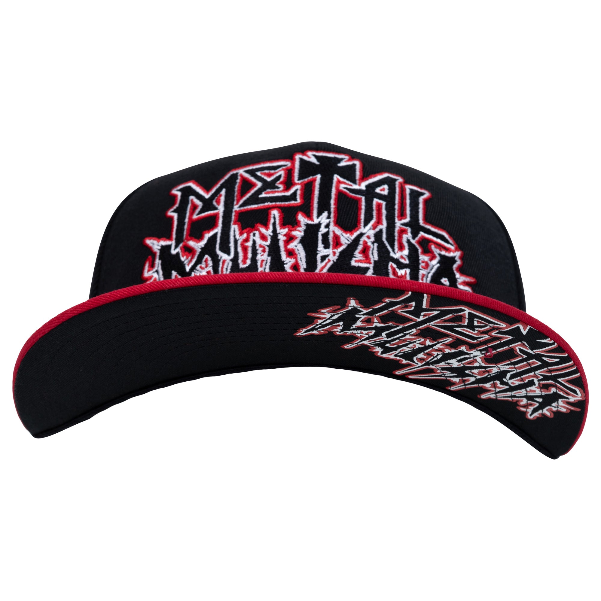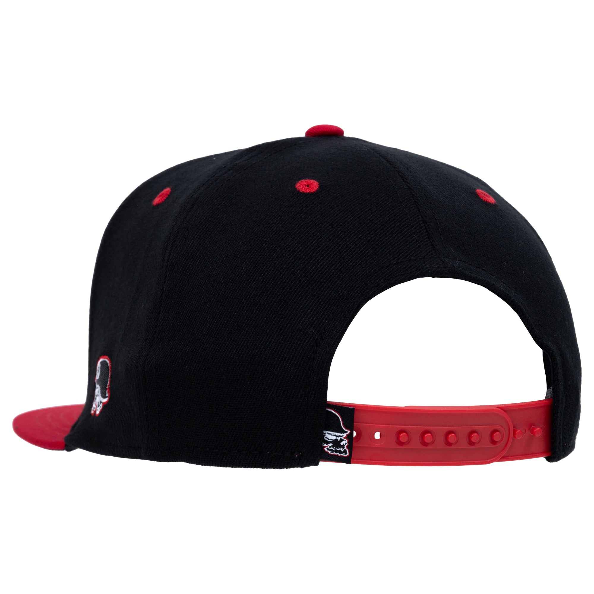 The Metalhead Snapback Hat in Black features a large embroidered Metal Mulisha logo on the front in Red, White and Black, a custom underbill print, a small White and Red helmet logo on the left side panel, and Red Flexsnap band with a small custom woven label.