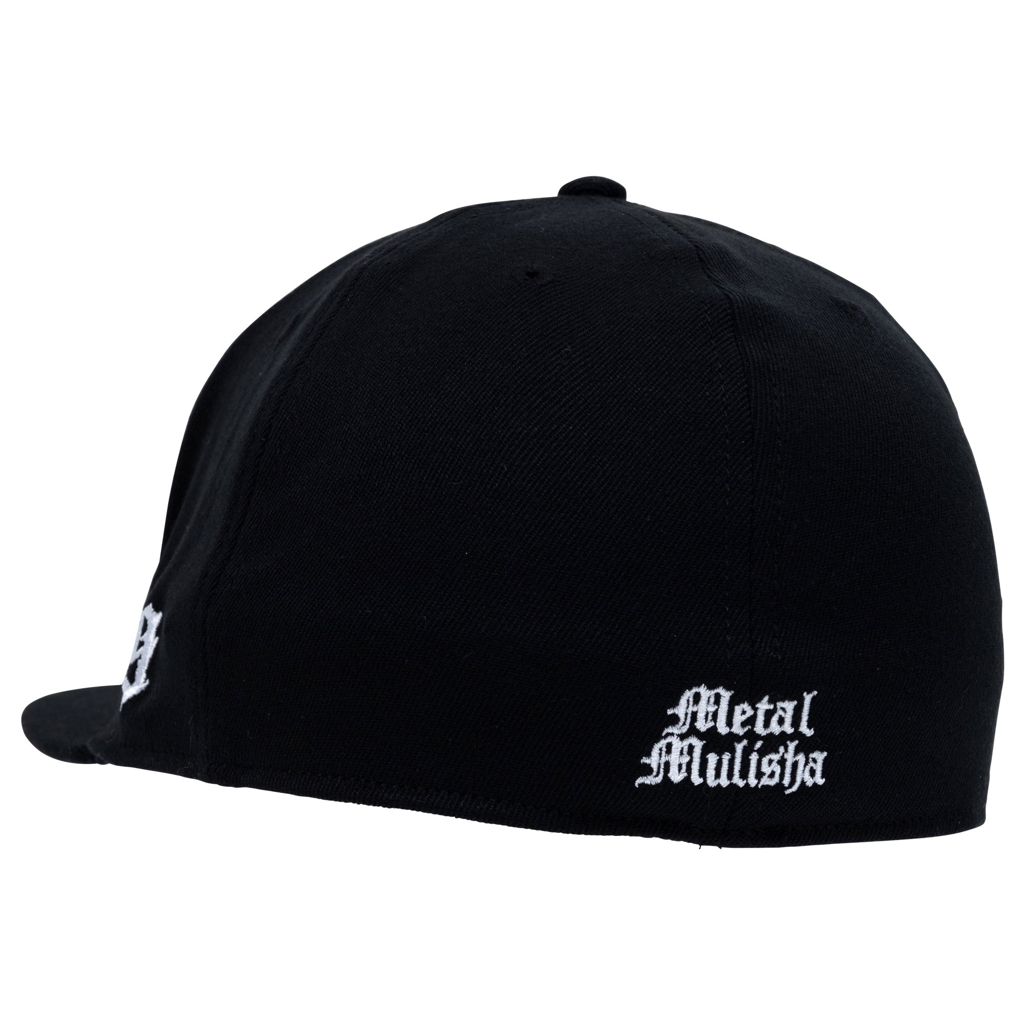 The Mind Flex Hat in White features a large skull embroidery on the front panels in White, custom printed underbill, custom sweatband, small 99 logo on left side in White and Metal Mulisha logo on back in White