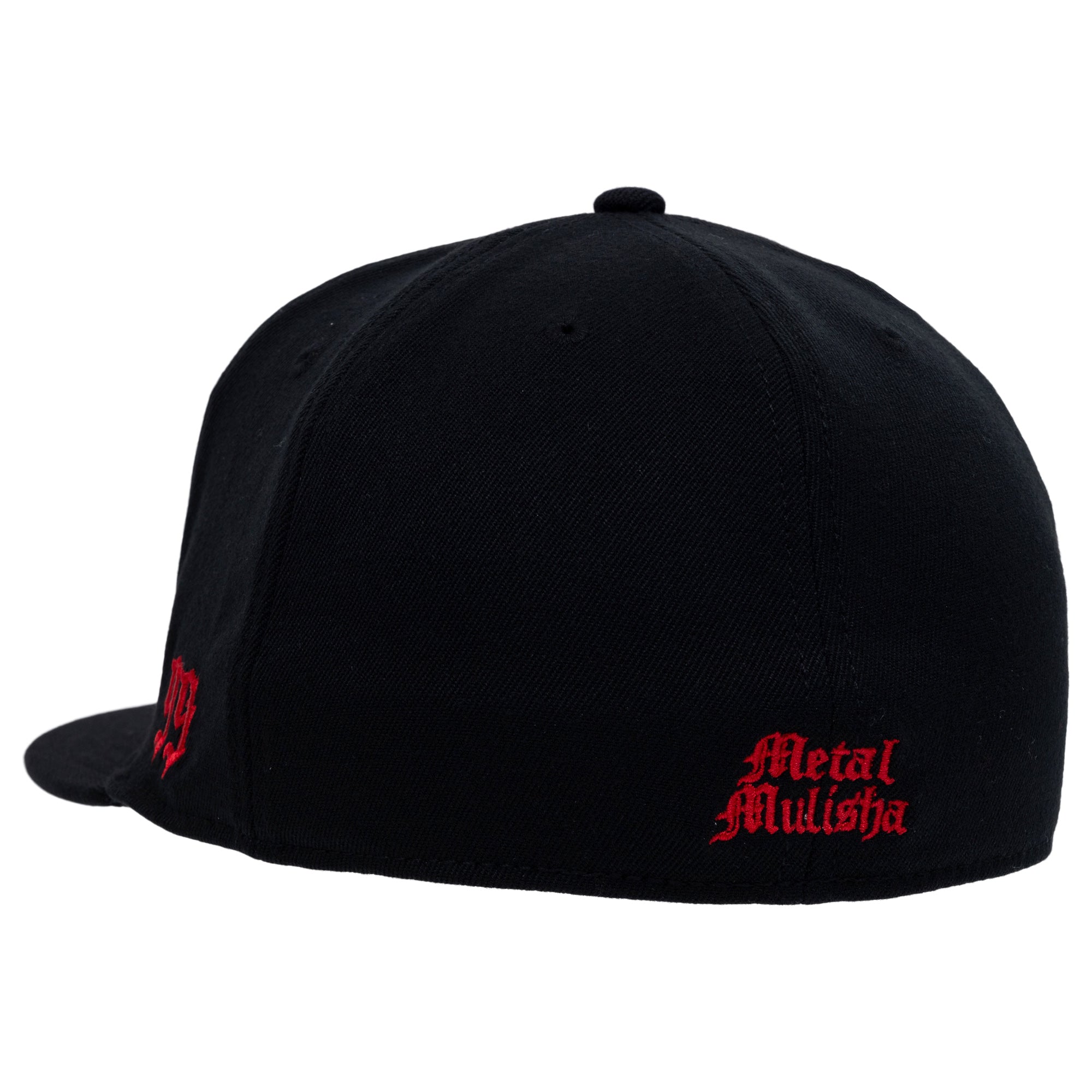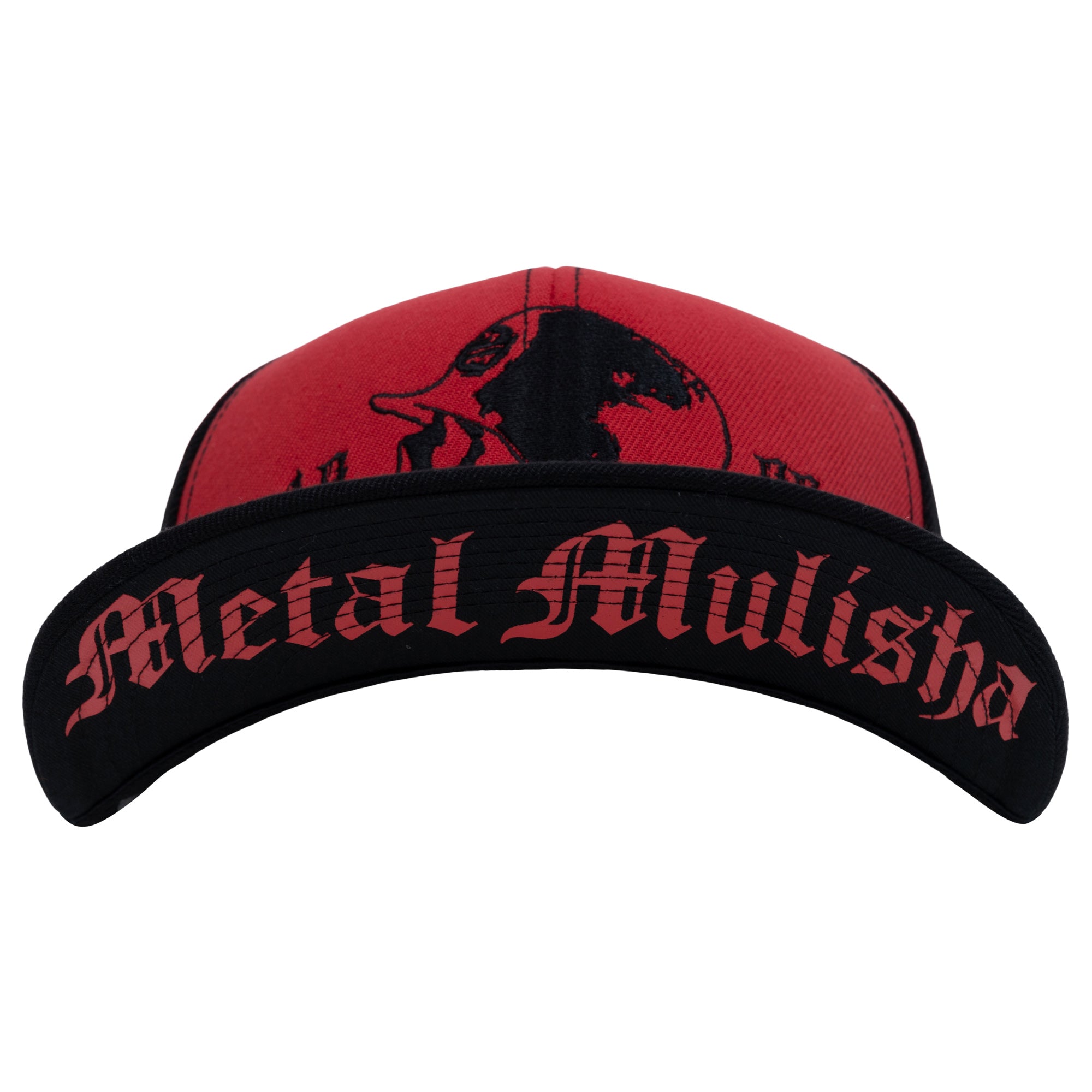 The Mind Flex Hat in Red and Black features a large skull embroidery on the front panels in Black, custom printed underbill, custom sweatband, small 99 logo on left side in Red and Metal Mulisha logo on back in Red.