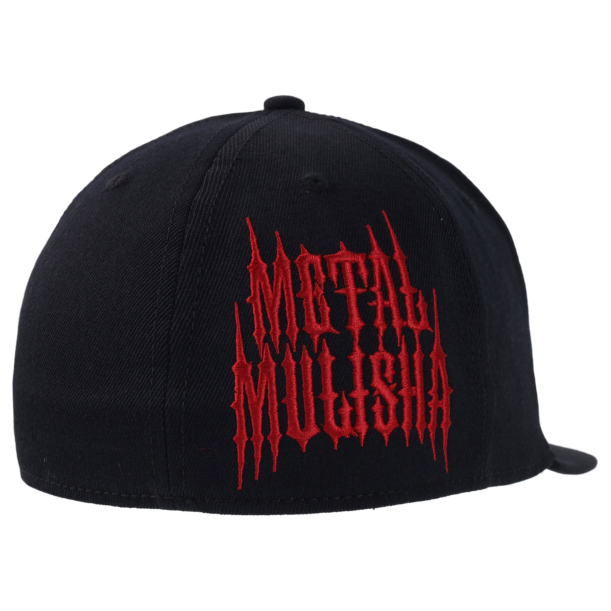The Mobber Flex Hat in Black features a large OG Metal Mulisha Skull embroidery in Red on wearer's front left panel that wraps around to the side panel, matching Skull logo print on underbill, and a large Metal Mulisha spike logo on back right side of the hat. 66% Acrylic, 20% Cotton, 12% Wool, 2% Spandex