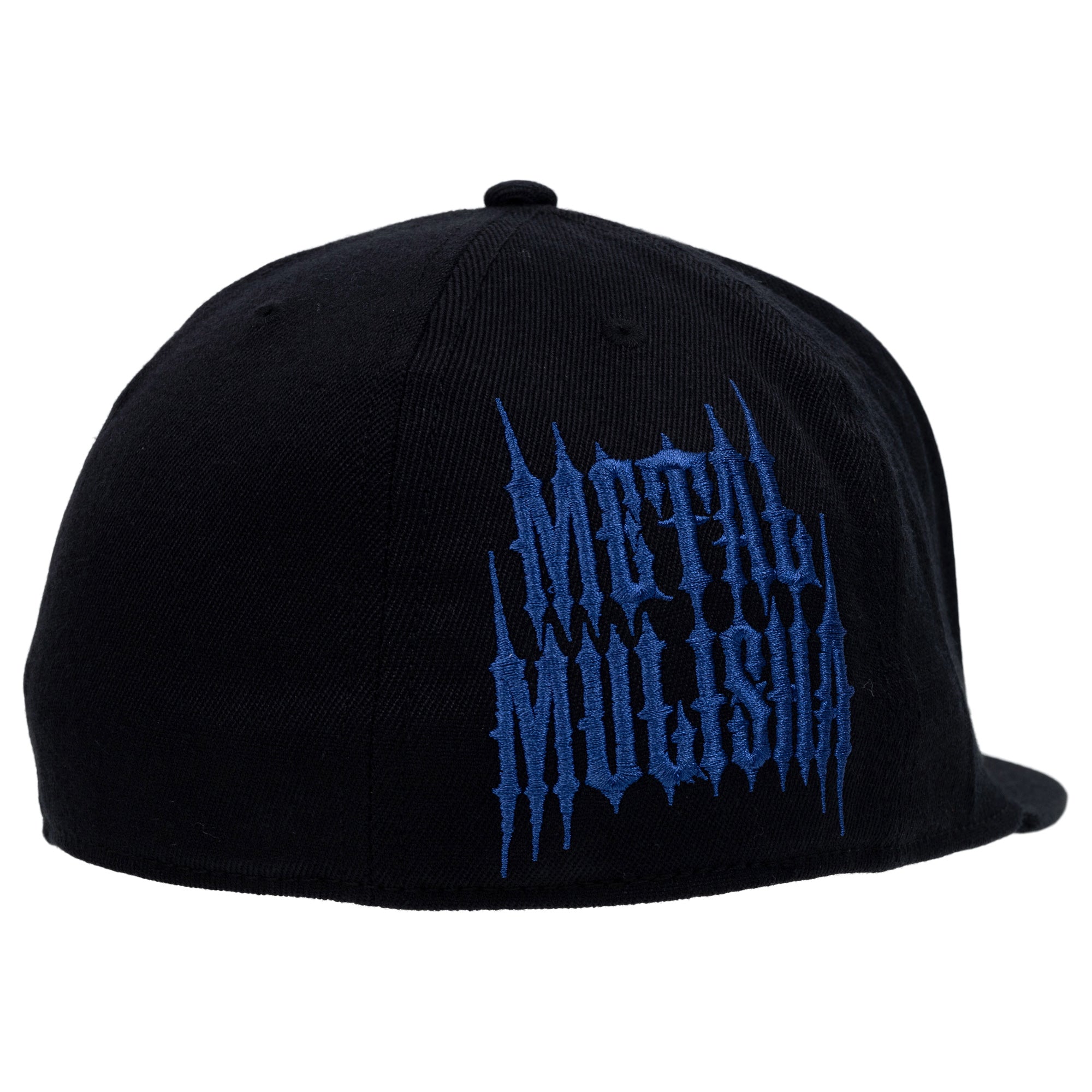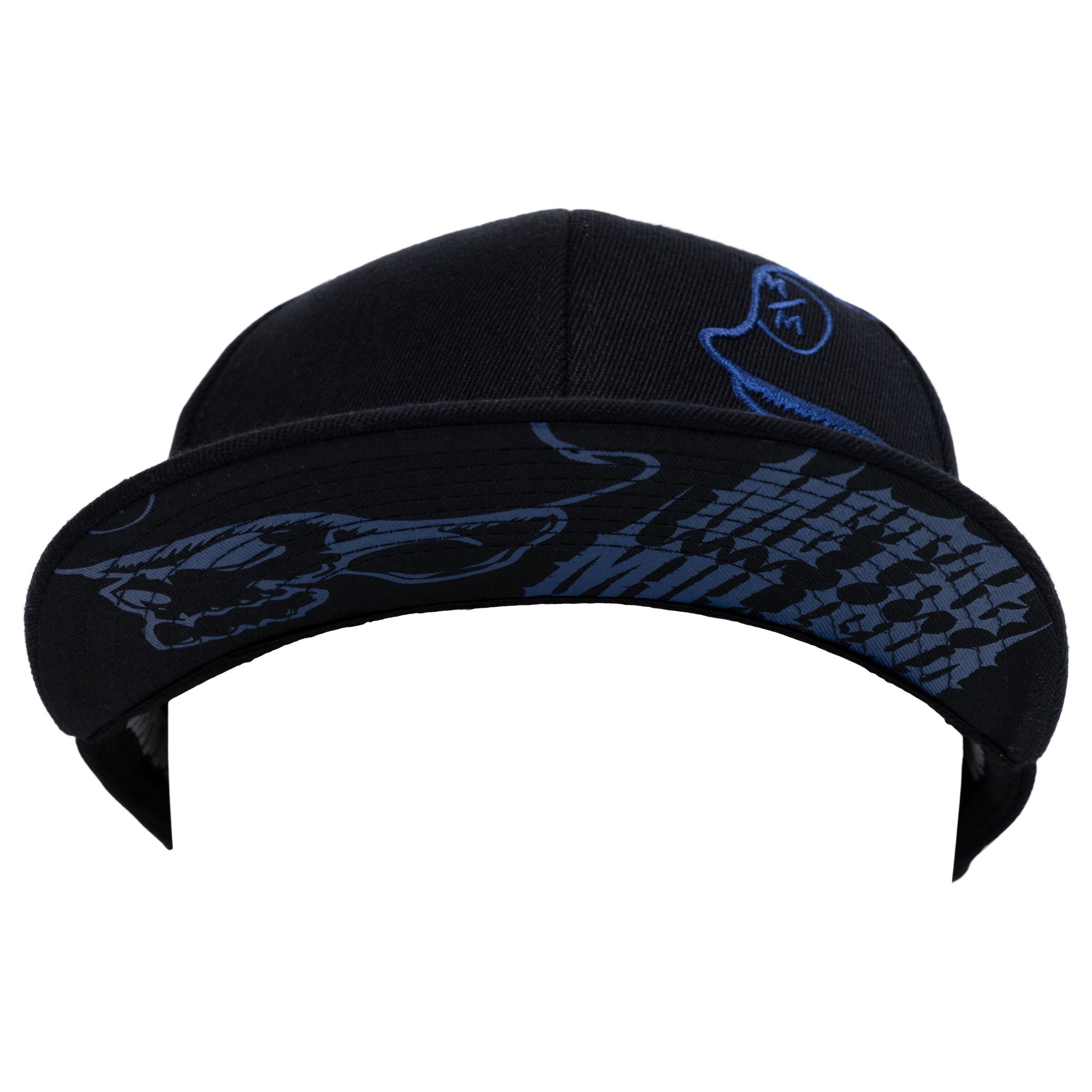 The Mobber Flex Hat in Black and Blue features a large skull embroidery on the left front panel in Blue, custom printed underbill, custom sweatband, large Metal Mulisha logo on back right panel.