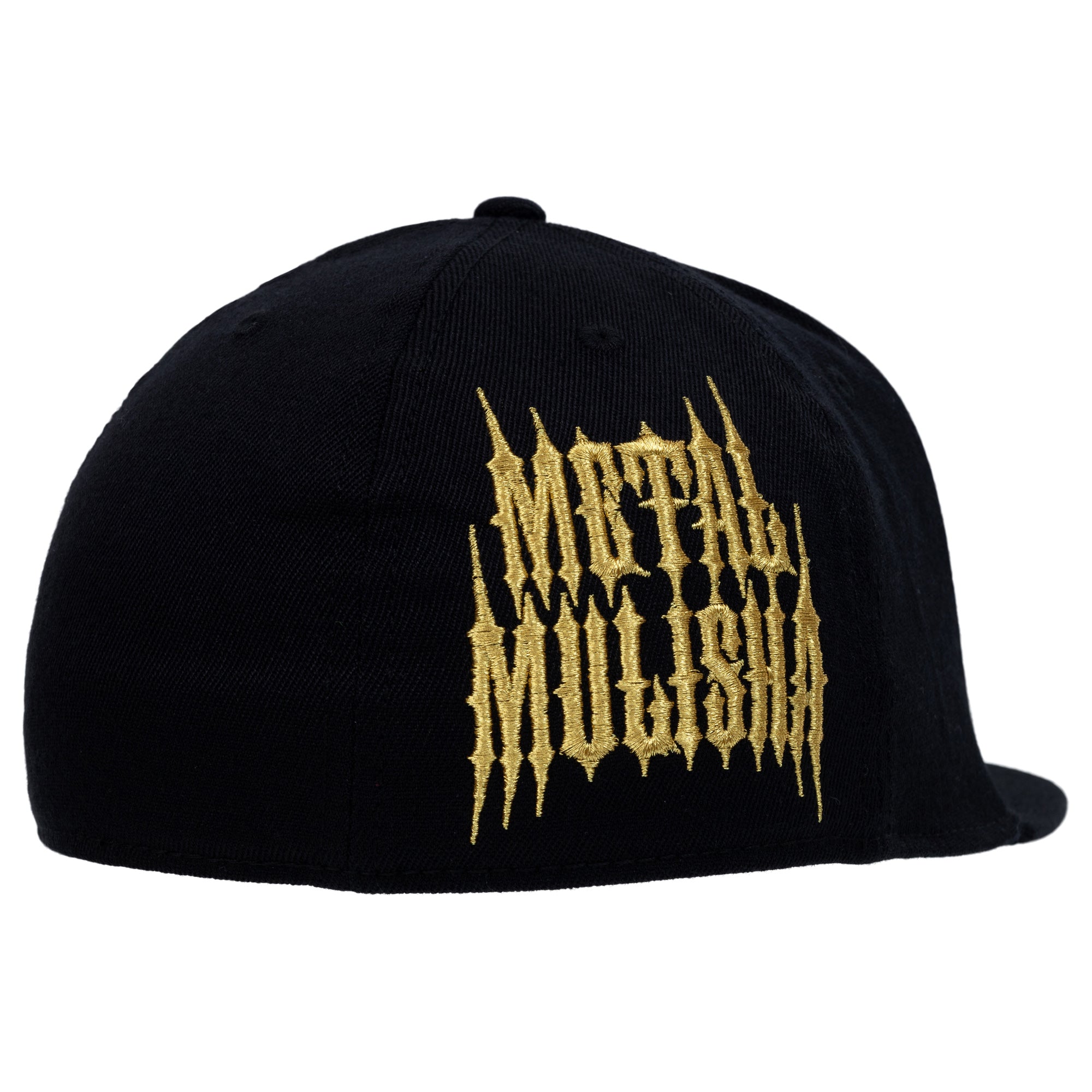 The Mobber Flex Hat in Black and Gold features a large skull embroidery on the left front panel in Gold, custom printed underbill, custom sweatband, large Metal Mulisha logo on back right panel.