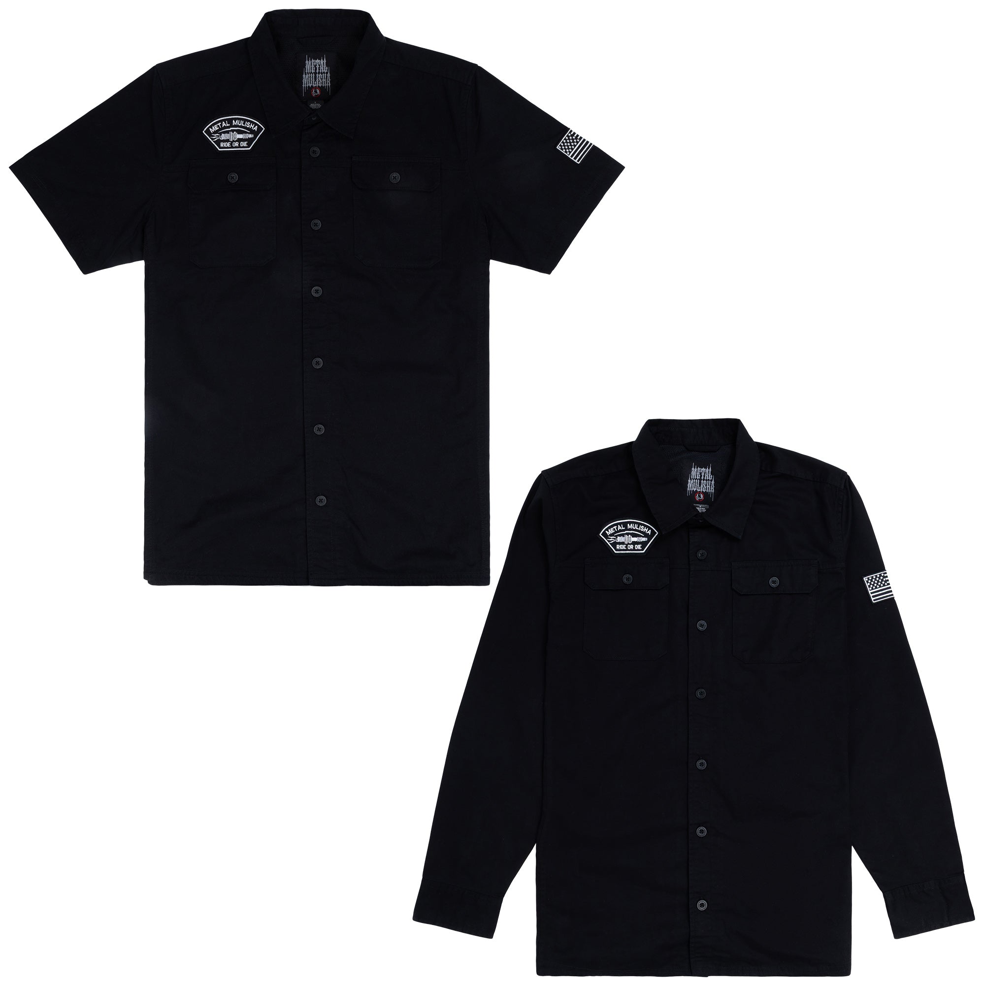 The Pits Woven Collared Work Shirts in Black are custom button up shirts that features a heavy duty 100% Cotton material, mesh under armpits for breathability, custom Metal Mulisha buttons, patch on the front right of the shirt and the left sleeve, M/M woven label on back seam, and 2 front pockets with buttons. Buy both together in this 2-Pack & save big!